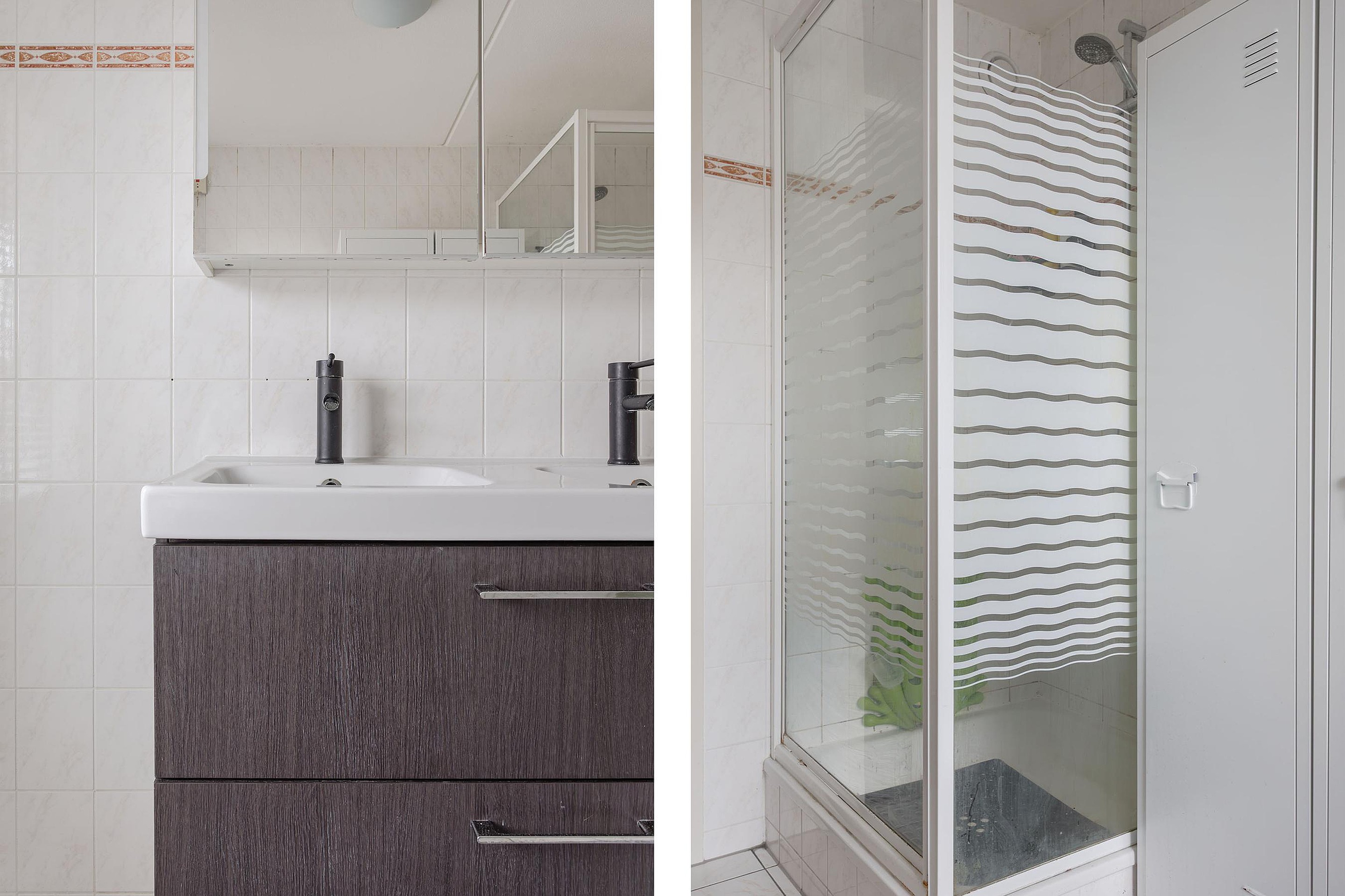 Ruime badkamer met licht betegelde wanden en dito vloer. Naast het centraal afzuigsysteem kan het raam open voor de natuurlijke ventilatie. Er is een breed wastafelmeubel met 2 porseleinen wasbakken en 2 brede laden, een spiegelkastje met verlichting, een “senioren” staand toilet, grote radiator en een douchecabine met thermostaatkraan.