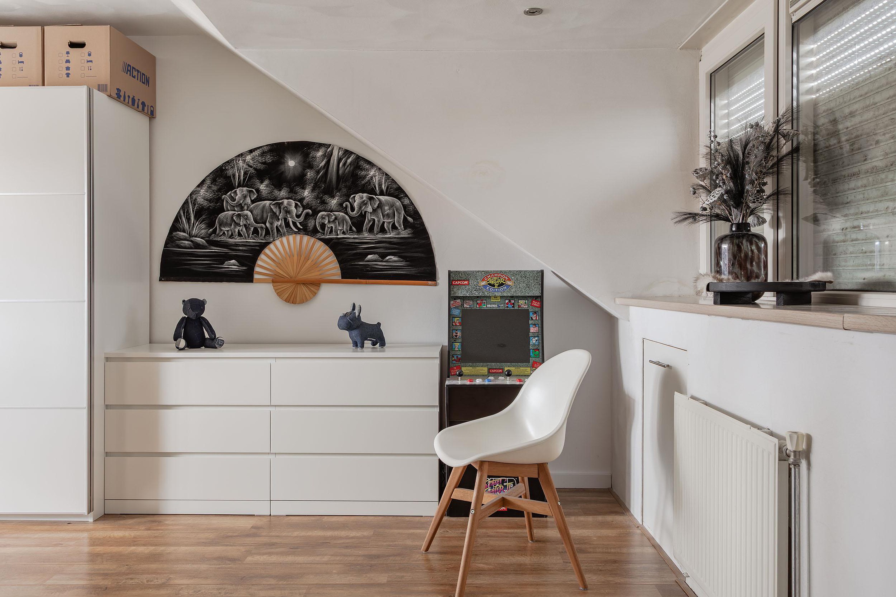 4e Slaapkamer – royale zolderkamer met kunststof dakkapellen aan de voor- en achterzijde met elektrisch te bedienen rolluiken. Voor de draai/kiepramen zijn losse horren aanwezig en in de vaste ramen zitten ventilatieroosters. De wanden en het plafond met inbouwspots op een dimmer zijn gestuukt en de laminaatvloer is vanuit de voorzolder doorgelegd. Aan beide zijden is extra bergruimte achter de knieschotten dus voldoende ruimte om uw spullen op te bergen. Er is indien gewenst vrij eenvoudig een 5e slaapkamer te realiseren