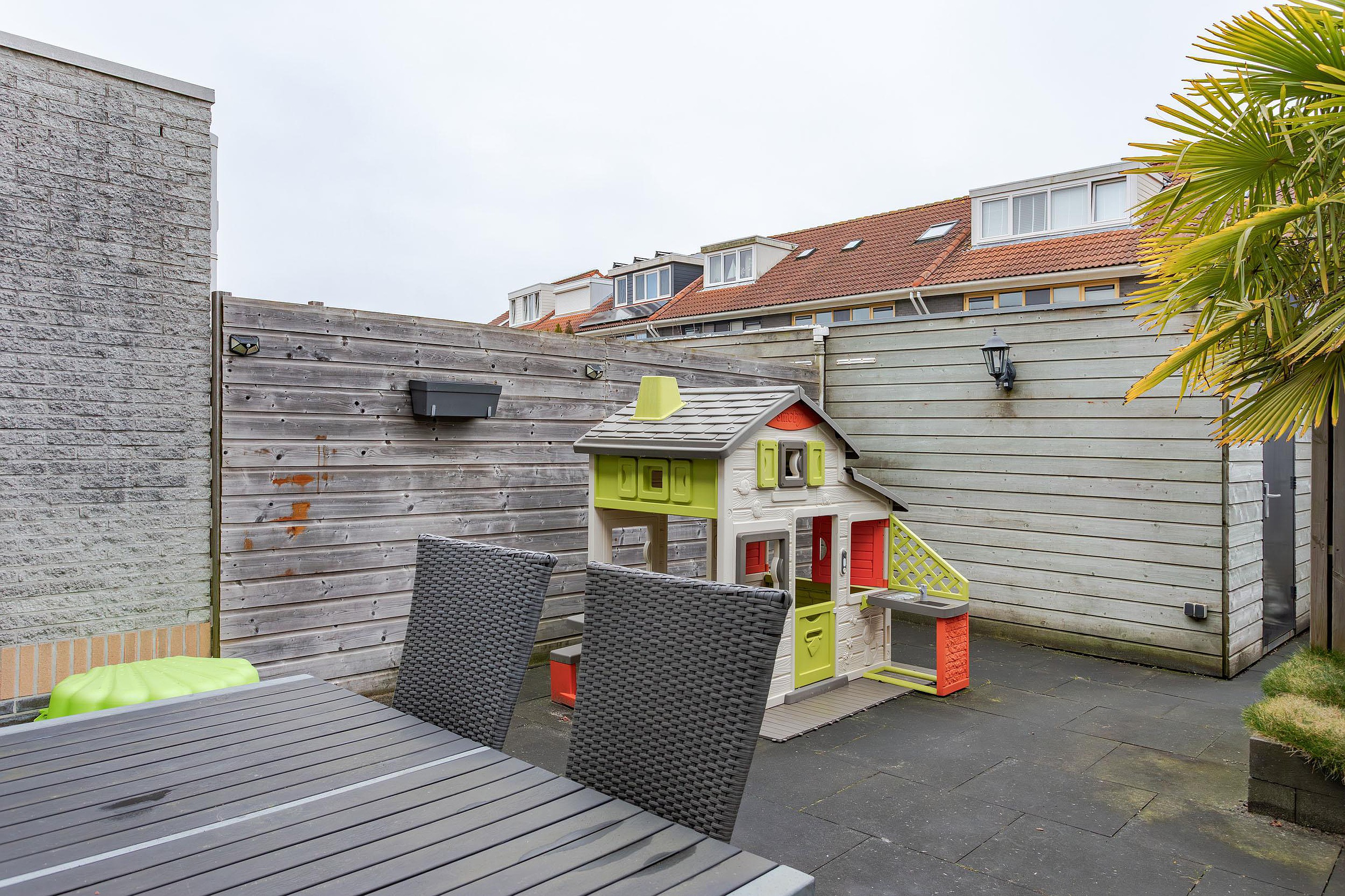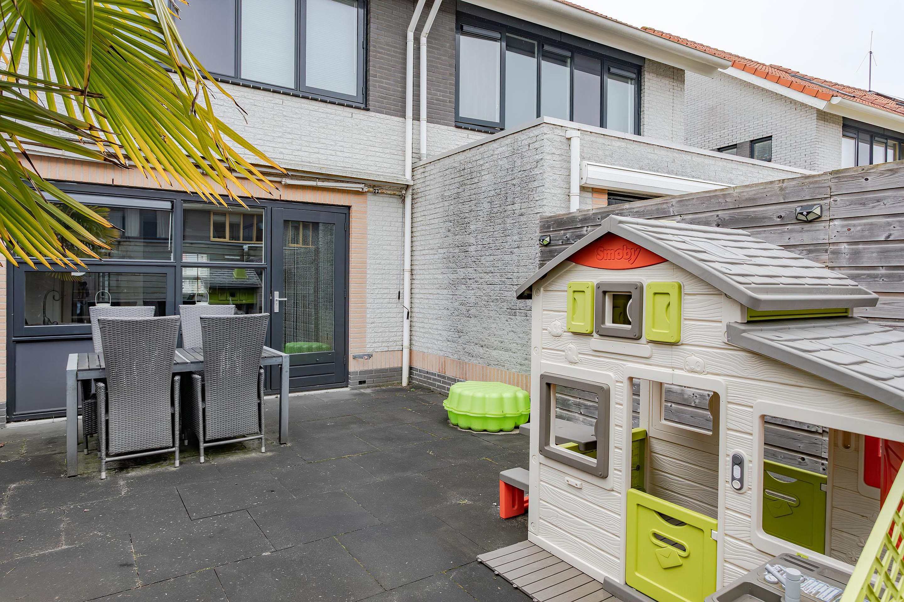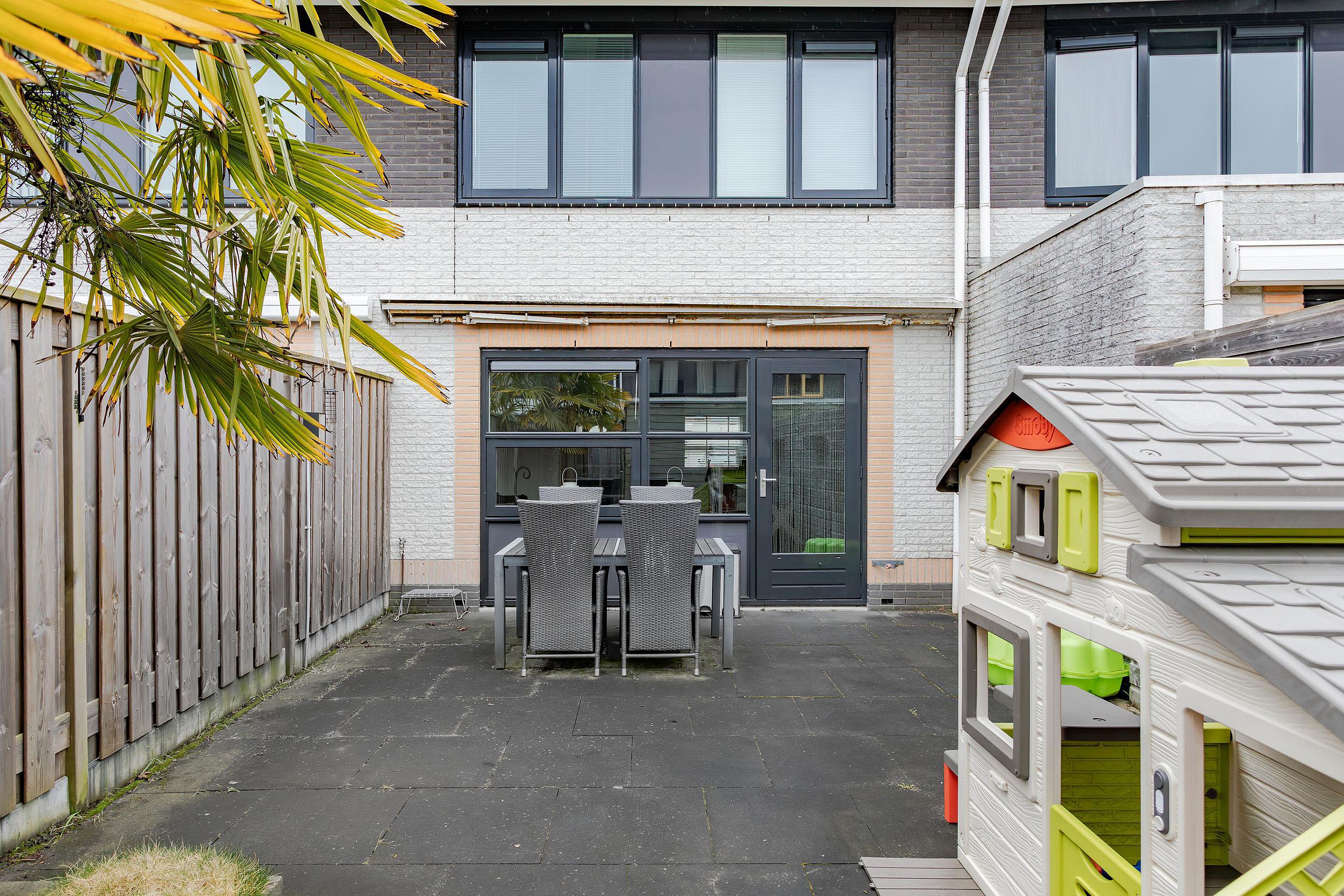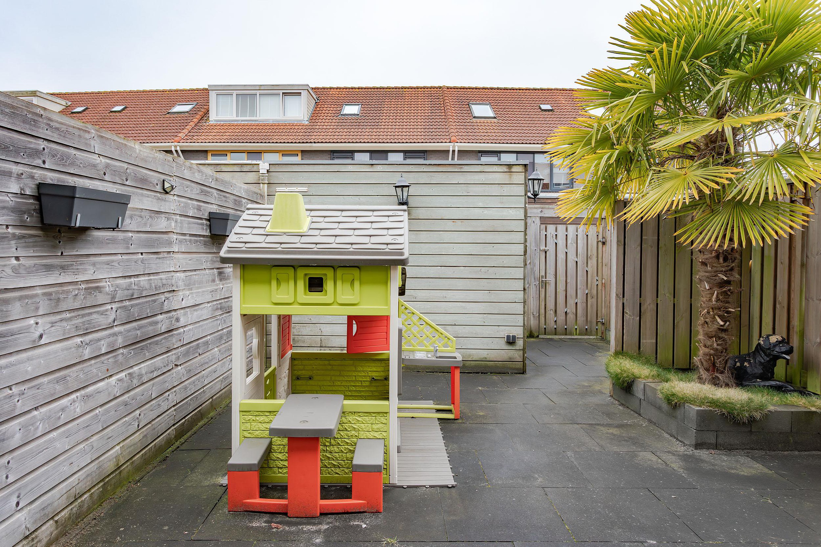 Fijne en zonnig gelegen tuin op het zuidoosten. De tuin is geheel bestraat met gezellige hoekjes en volop plek om van de zon te genieten. De sierlijke palmboom geeft een extra zomers tintje aan de tuin. Er is een handmatig te bedienen zonnescherm met een grote uitval, een buitenkraan en een grote houten berging met verlichting, stopcontacten en een betonnen vloer. De tuin is via het achterom te bereiken.