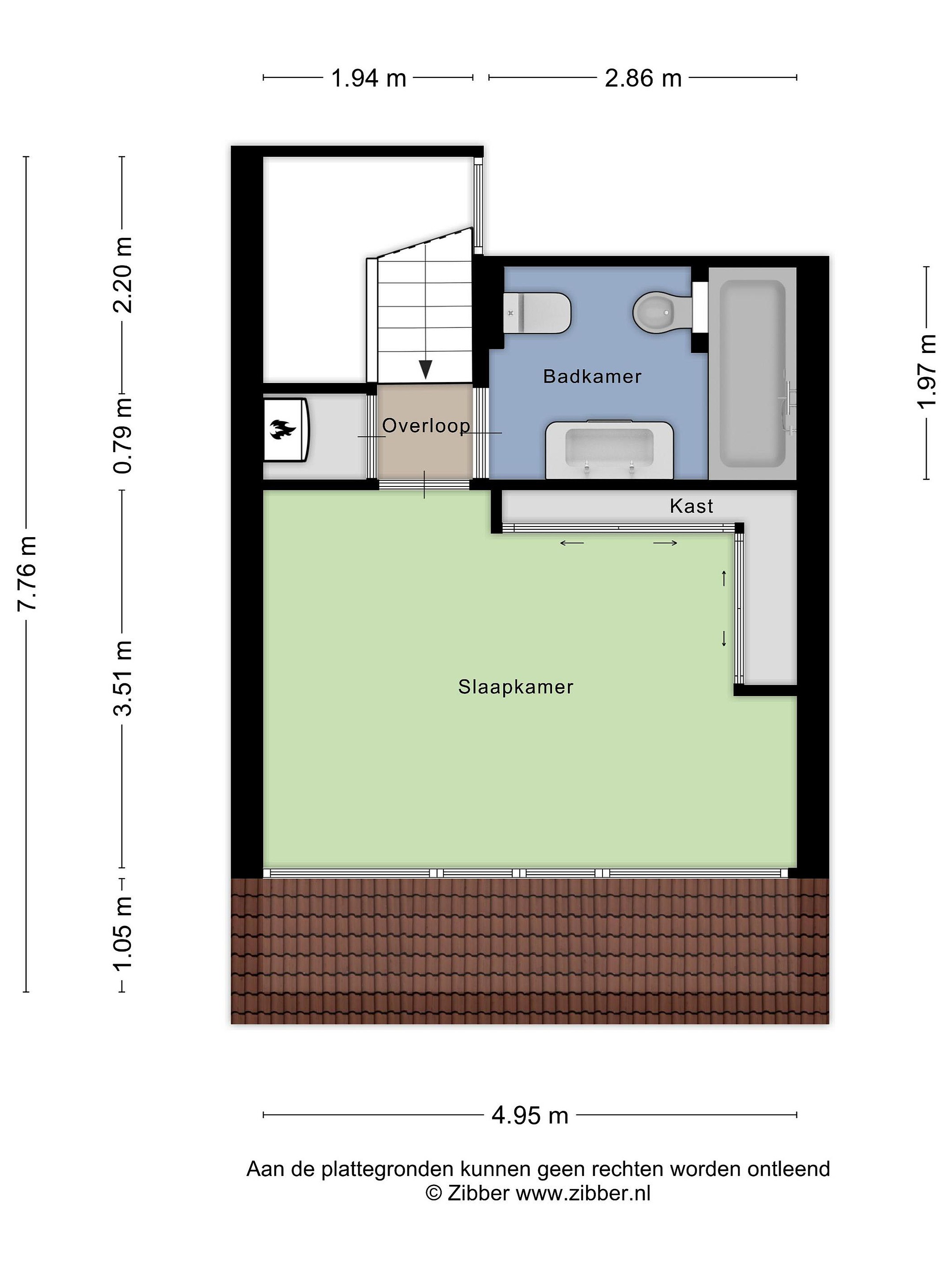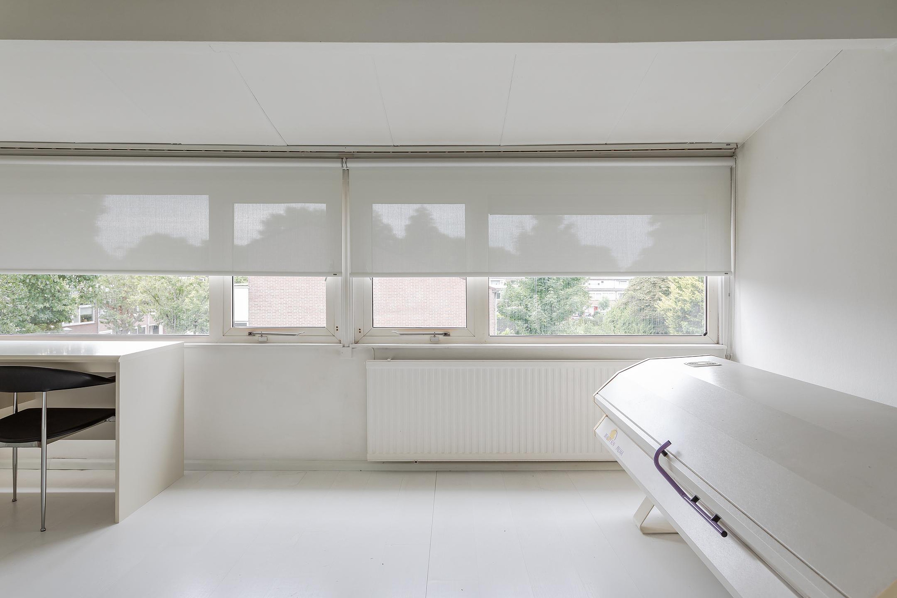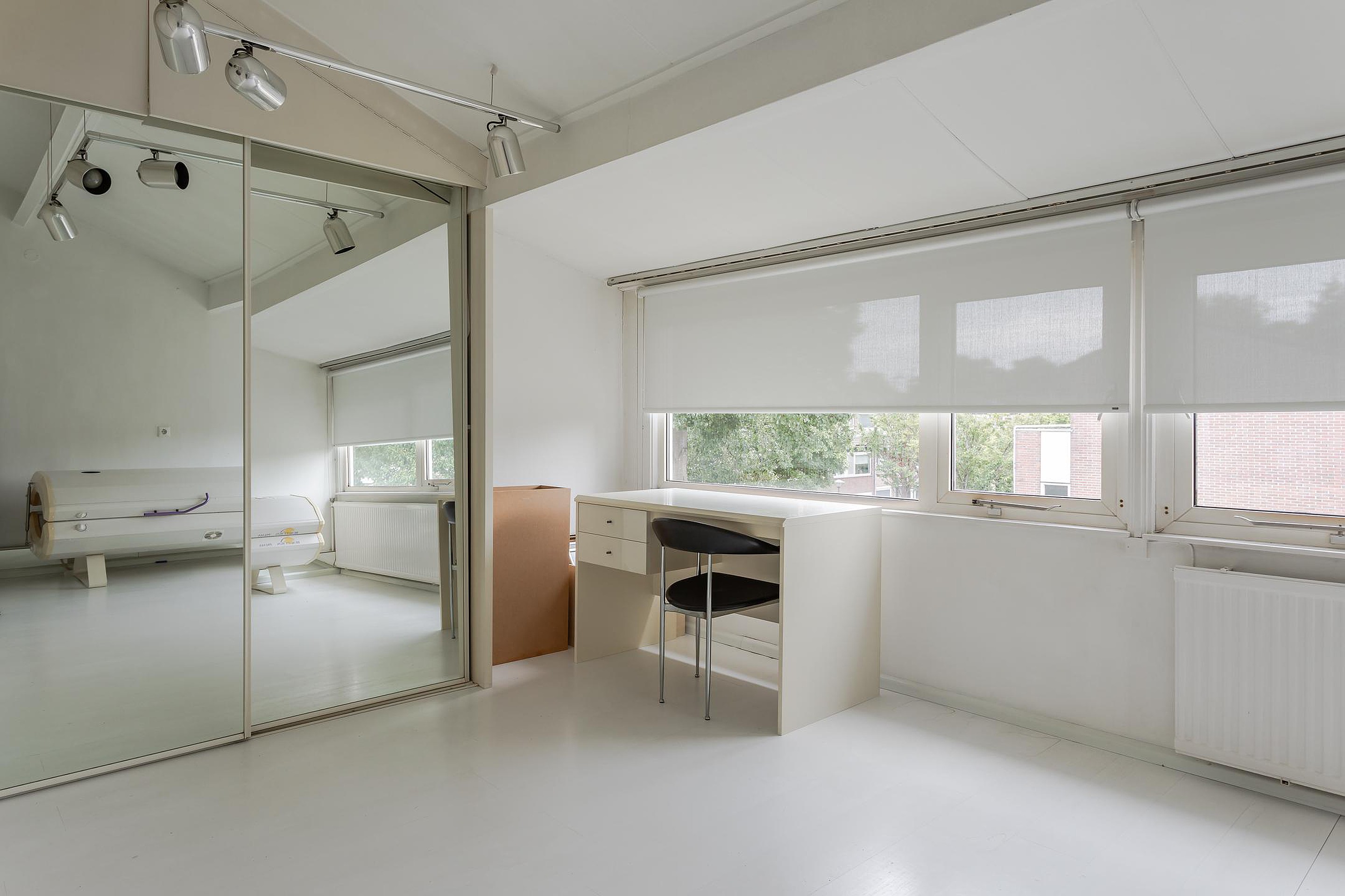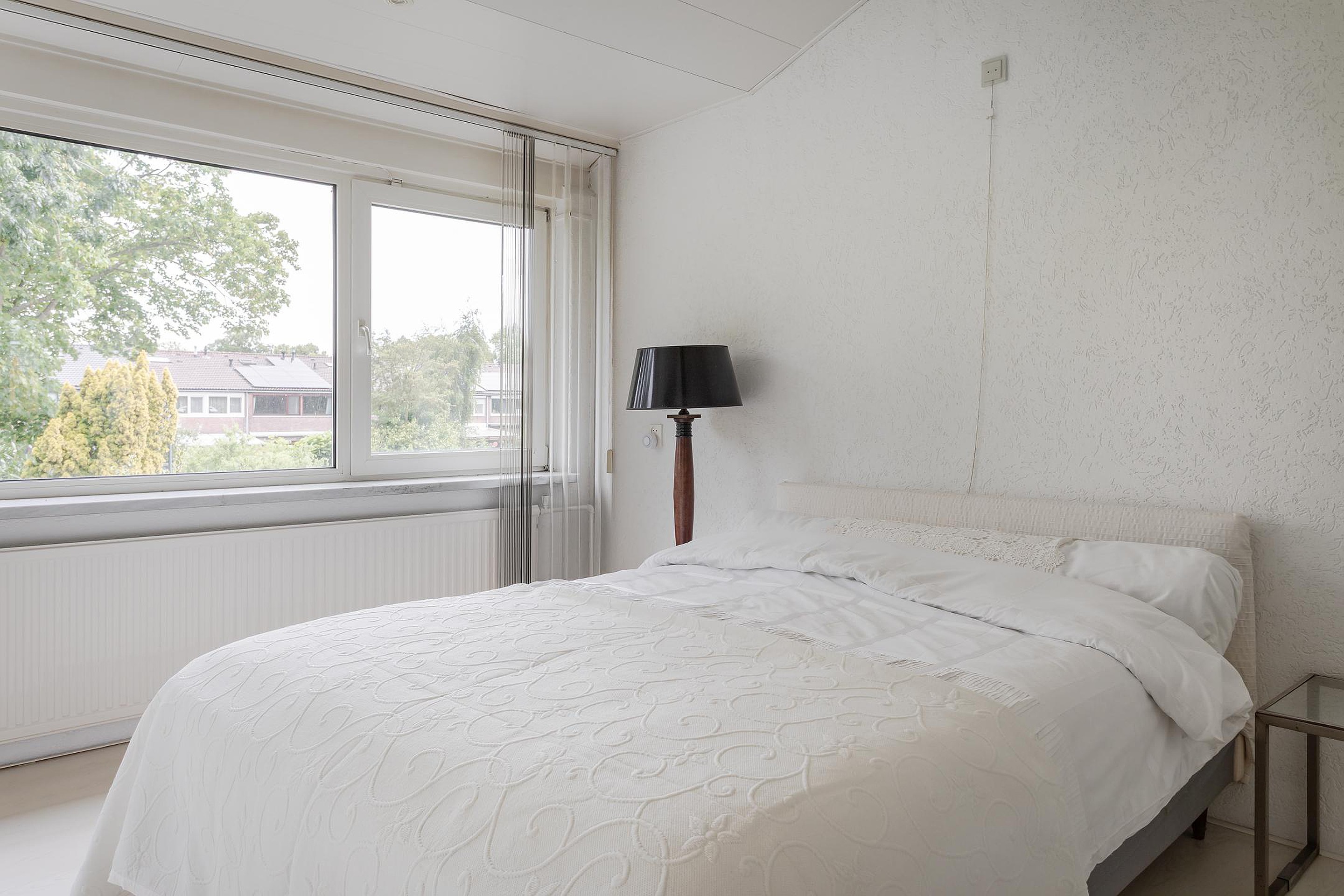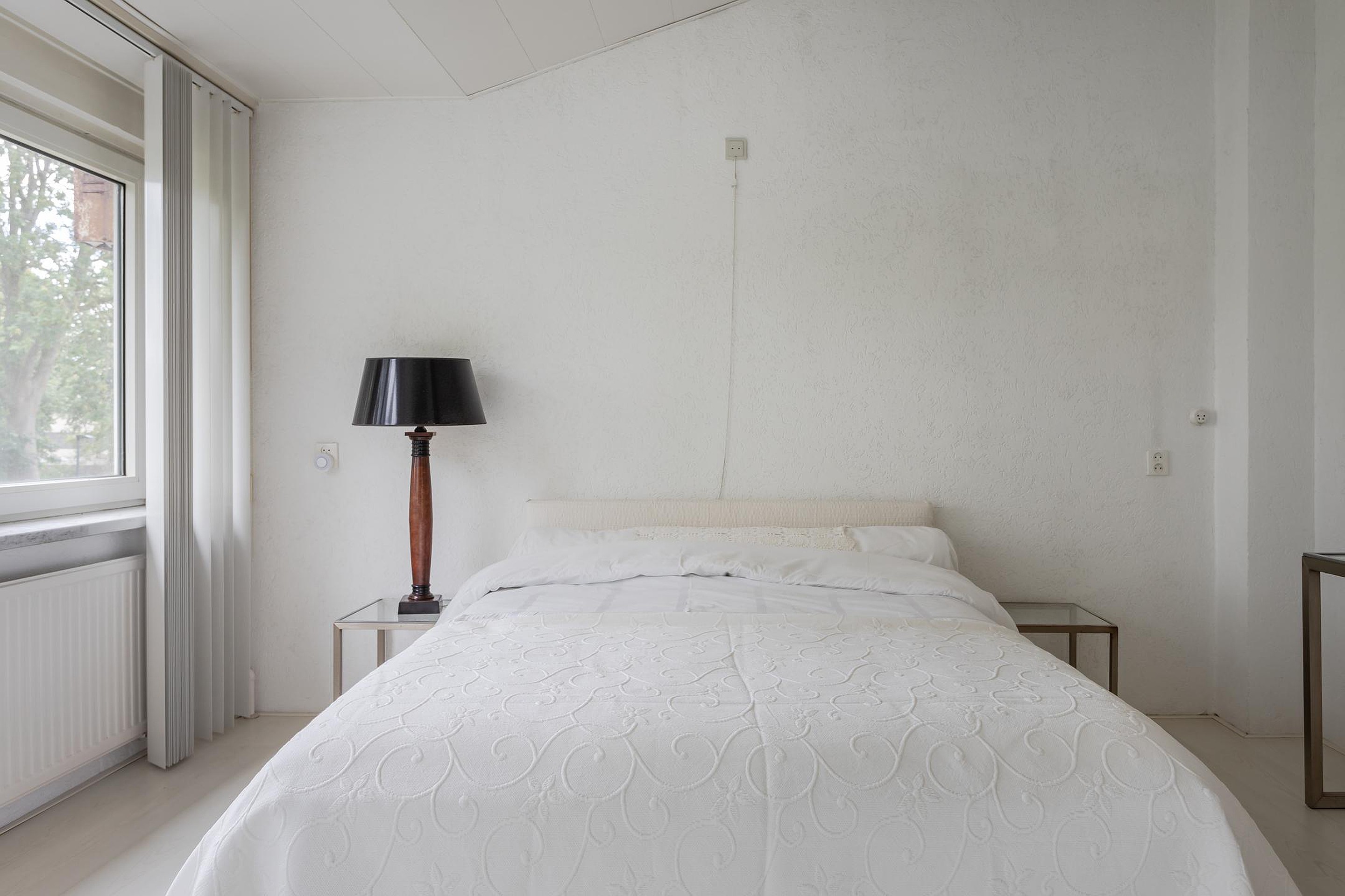 Vanuit de living is de trap naar de overloop met een hoog plafond met inbouwspots en toegang tot de riante slaapkamer, voorheen 2 kamers. Op de houten verdiepingsvloer is ook hier een lichte laminaatvloer gelegd. De slaapkamer voorziet in een kunststof kozijn met dubbel glas, ventilatierooster en draai/kiepraam en een hoogoplopend kunststof plafond met inbouwspots.