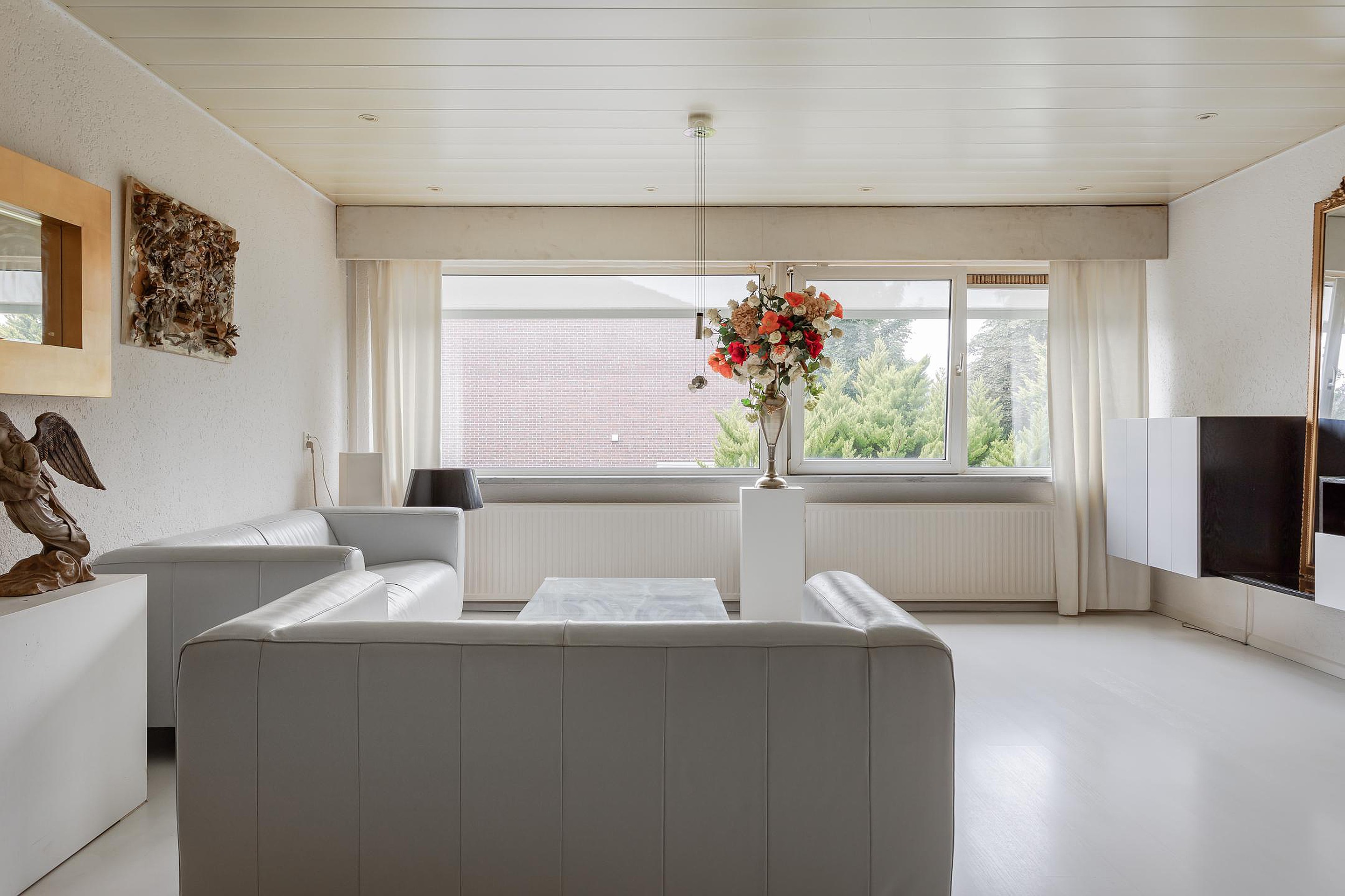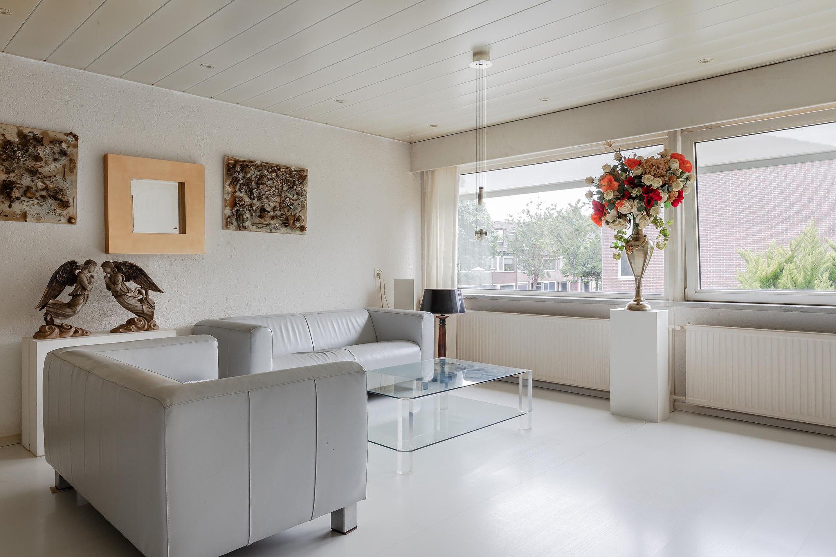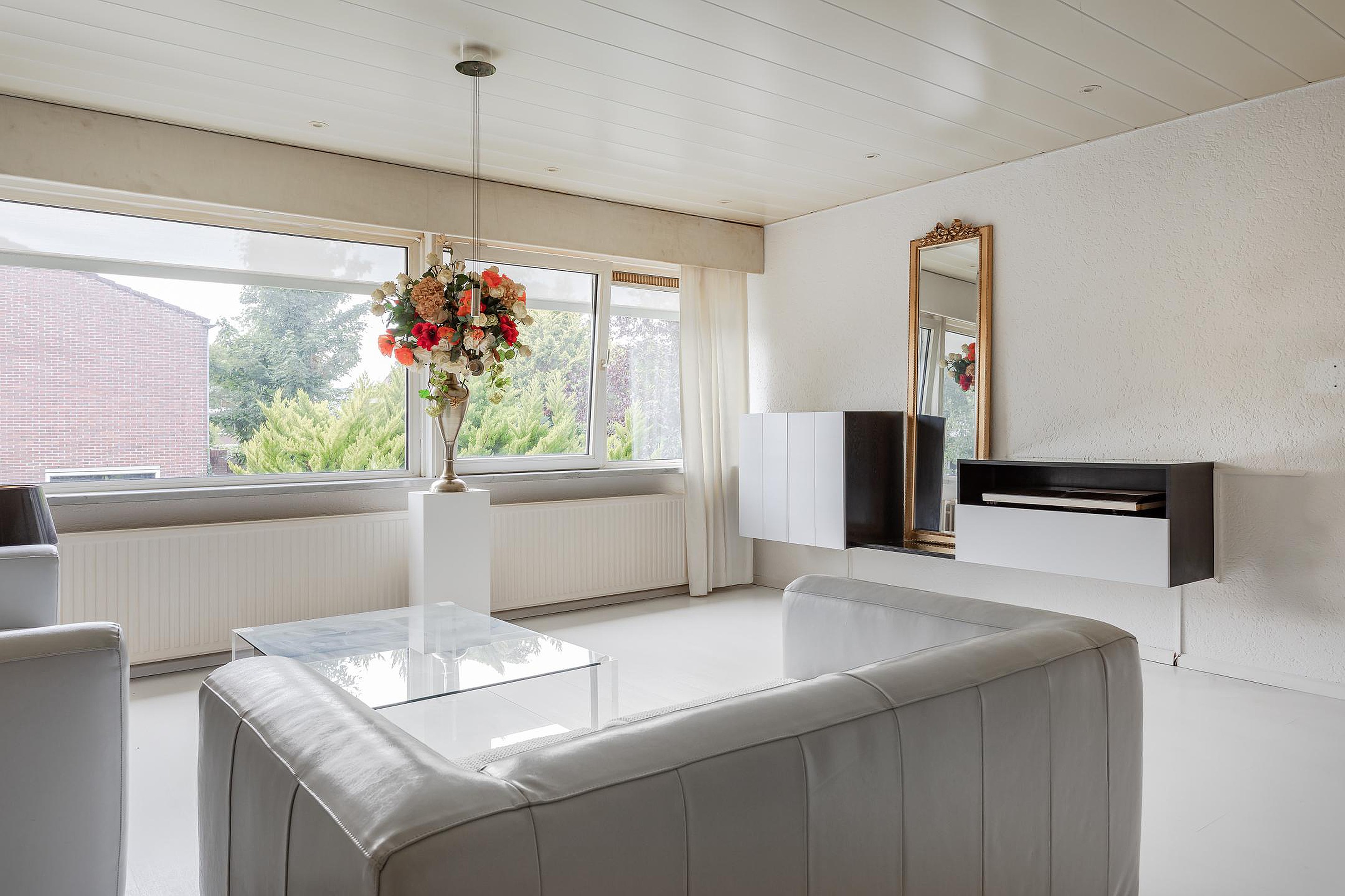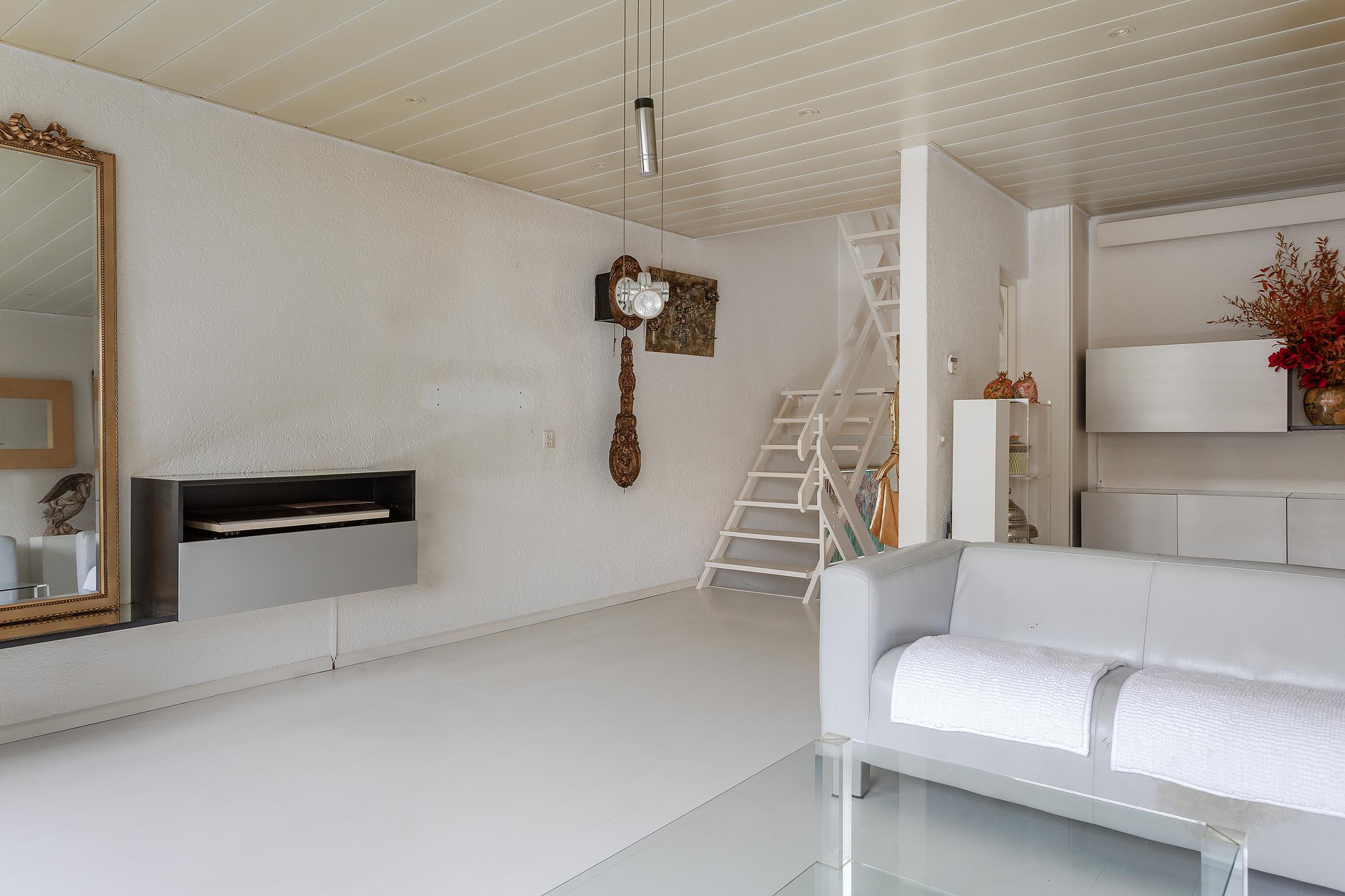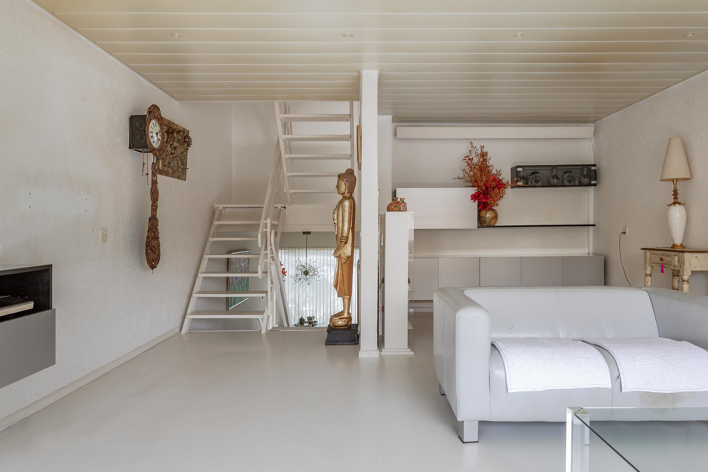Vanuit de keuken geeft een trap toegang tot de royale living met een houten verdiepingsvloer waarover een lichte laminaatvloer is gelegd. Er is veel lichtinval vanwege de brede raampartij met dubbel glas in een kunststof kozijn met dubbel glas, draai/kiepraam, een ventilatierooster en elektrisch te bedienen screen. De wanden zijn granol gestuukt en er zit een kunststof plafond met inbouwspots.