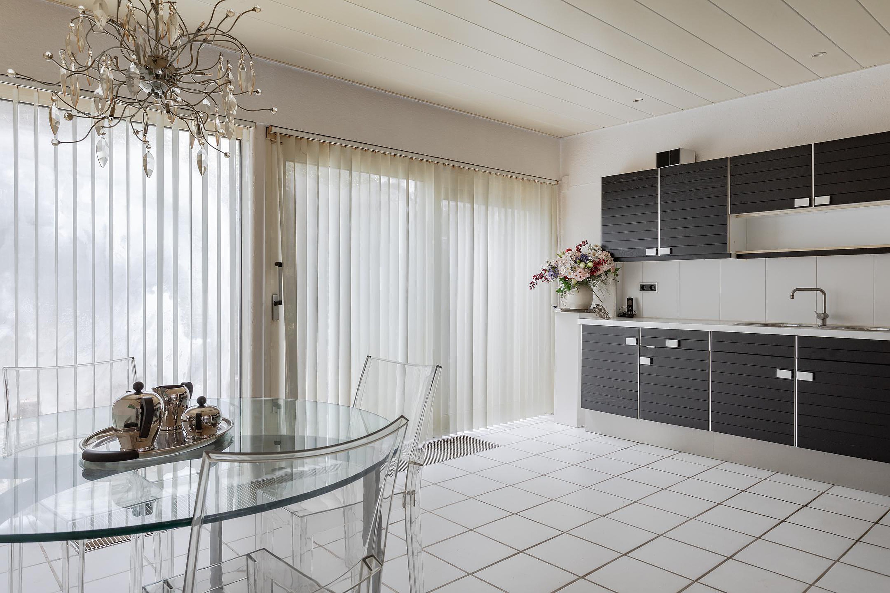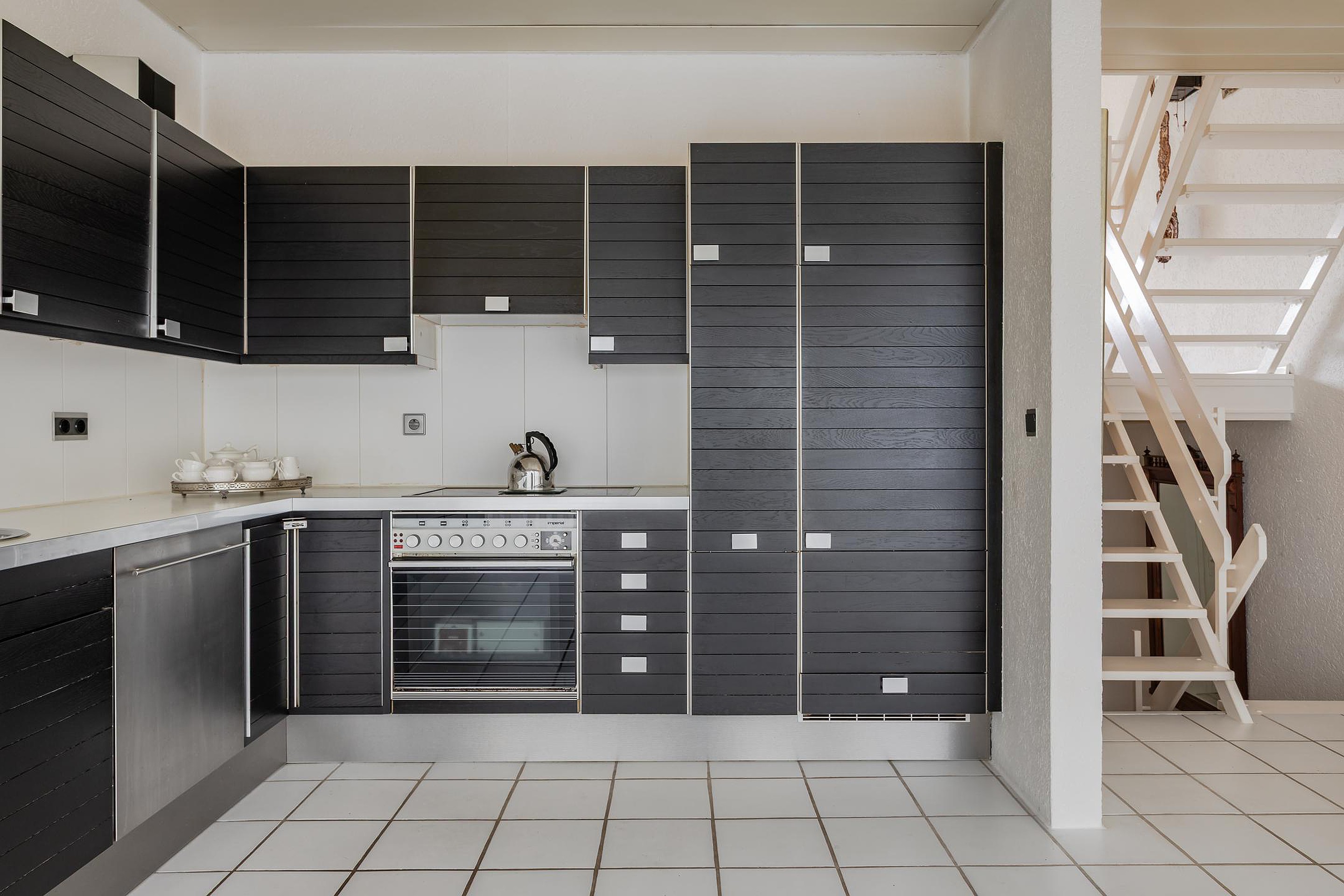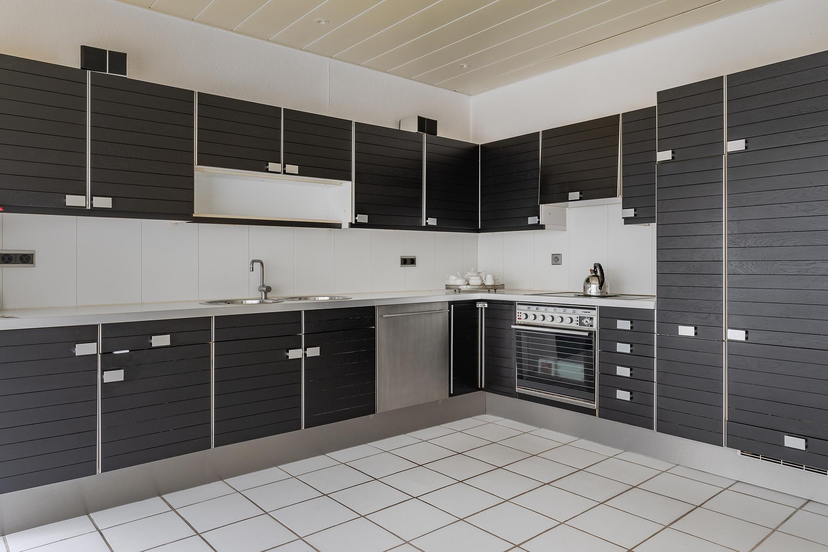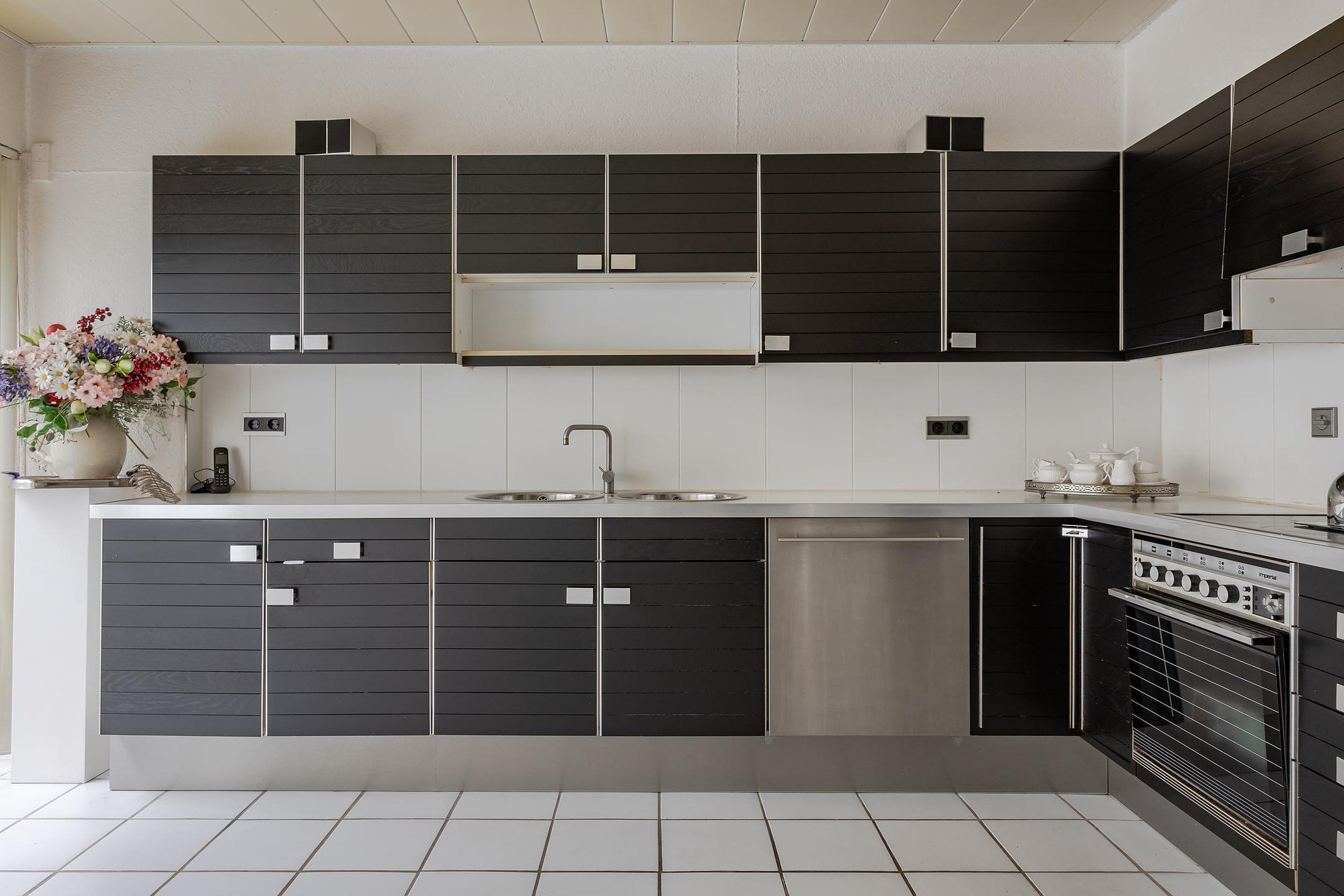 Woonkeuken met grote raampartijen tot aan de vloer met ventilatierooster en een schuifpui in een kunststof kozijn. De ruiten moeten wel vervangen worden vanwege condens. Er is een kunststof plafond met inbouwspots en de keuken is in een L-vorm geplaatst met veel werkblad en dubbele spoelbak, veel kastruimte, apothekerskast, laden en bovenkastjes met bladverlichting. Daarnaast is er diverse inbouwapparatuur, zoals: een grote koelkast met vriesvak, vaatwasser, elektrische kookplaat, wasemkap en elektrische oven. Er zitten lichte wandtegels tegen de achterwand, de knop van het centraal afzuigsysteem en meerdere stopcontacten.