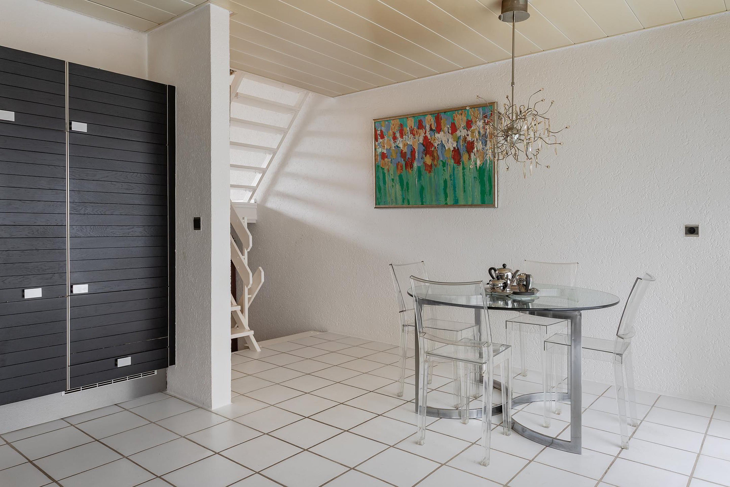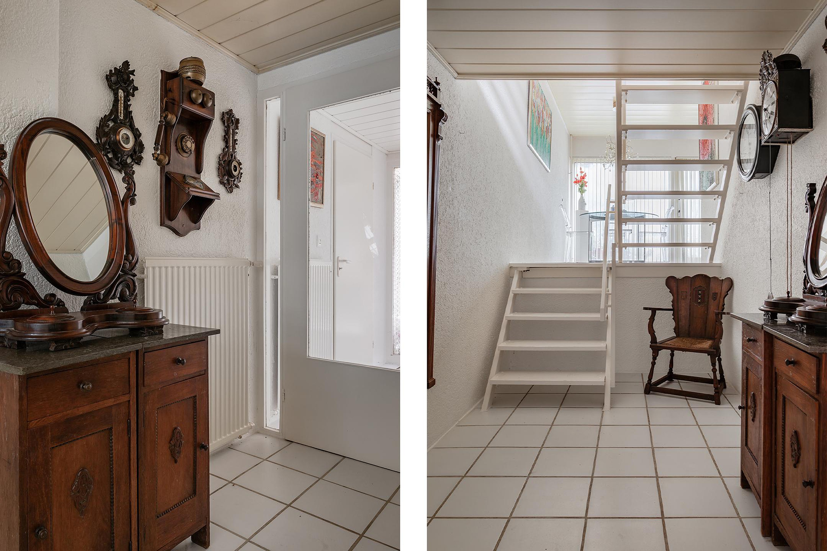 Deur naar de volgende hal met een garderobekast en de trap naar het keukenniveau.