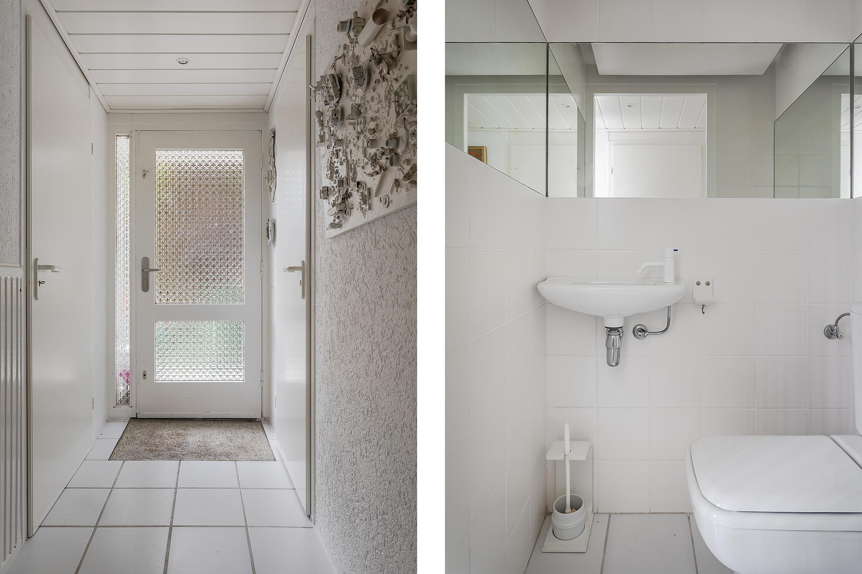 Vanuit de hal heeft u toegang tot de inpandig te bereiken garage en het toilet met licht betegelde wanden en vloer, spiegelwanden, verlaagd plafond met indirecte verlichting, staande toiletpot, fonteintje en natuurlijke ventilatie.