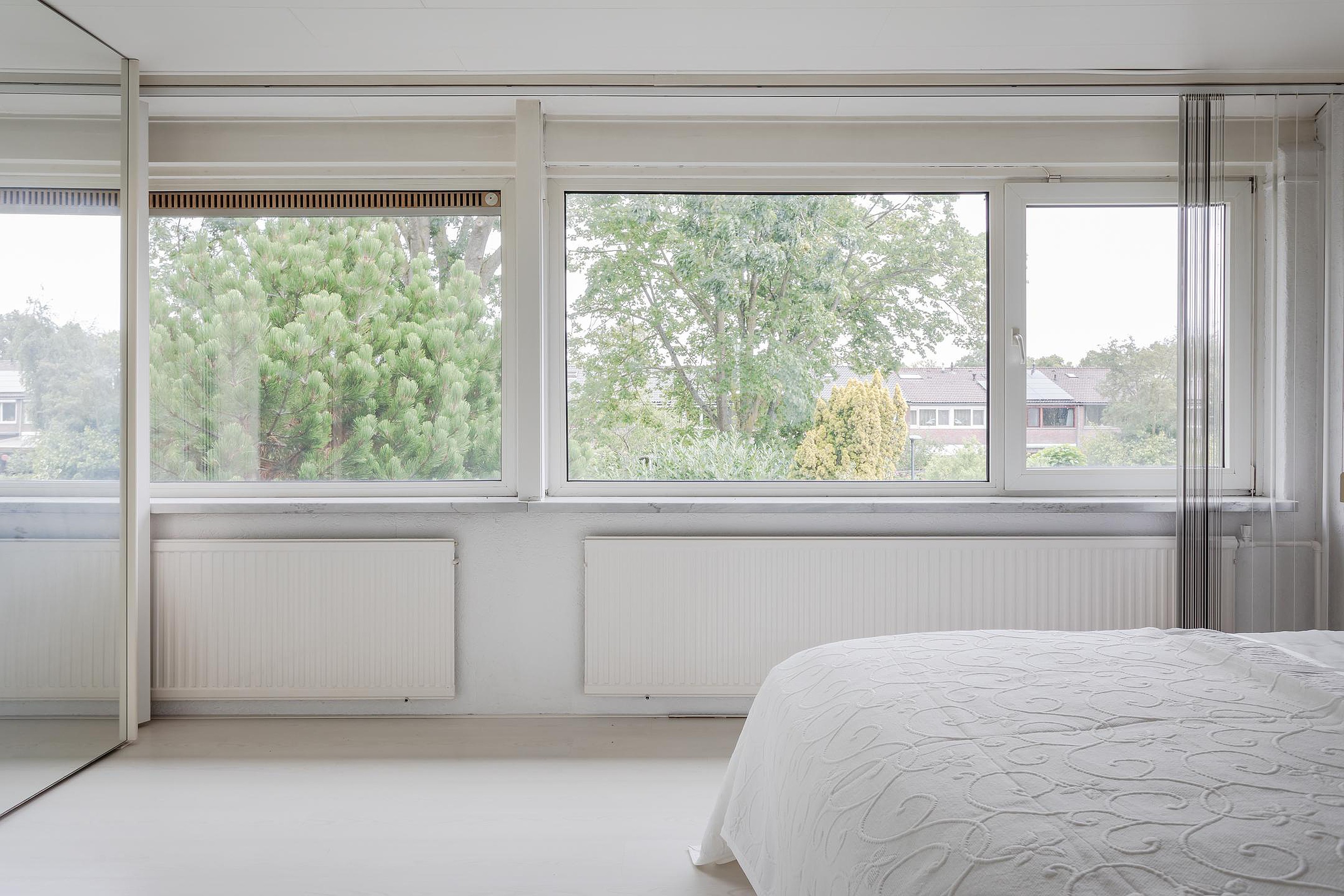 Royale slaapkamer met een lichte laminaatvloer op een houten verdiepingsvloer. Ook in deze kamer zijn kunststof kozijnen geplaatst met dubbel glas en er zijn 2 uitzetramen. De wanden zijn behangen, ook hier een hoog plafond en de kamer heeft vaste kastenwanden met spiegeldeuren.