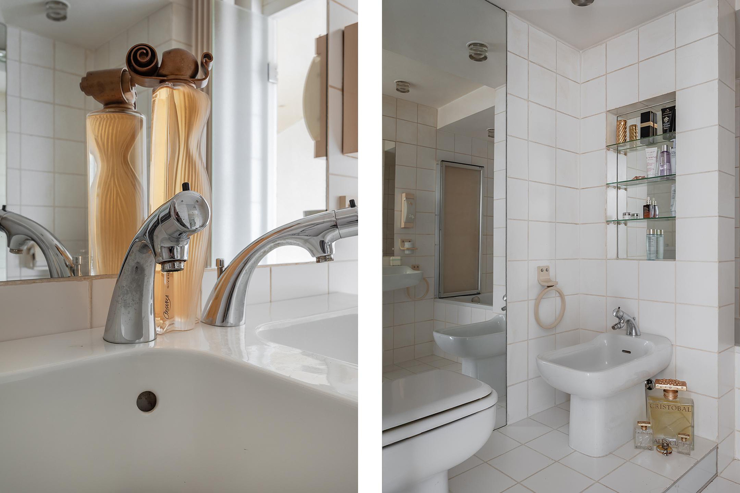 Vanaf de overloop een trap naar de badkamer en de 2e slaapkamer en de cv-kast. Een glazen klapdeur geeft toegang tot de badkamer met licht betegelde wanden en dito plafond. Het is een speelse indeling met op een plateau een 2e toilet en een bidet, een brede wastafel met dubbele wasbak en een grote spiegel en er is een ligbad met douche en spatscherm.