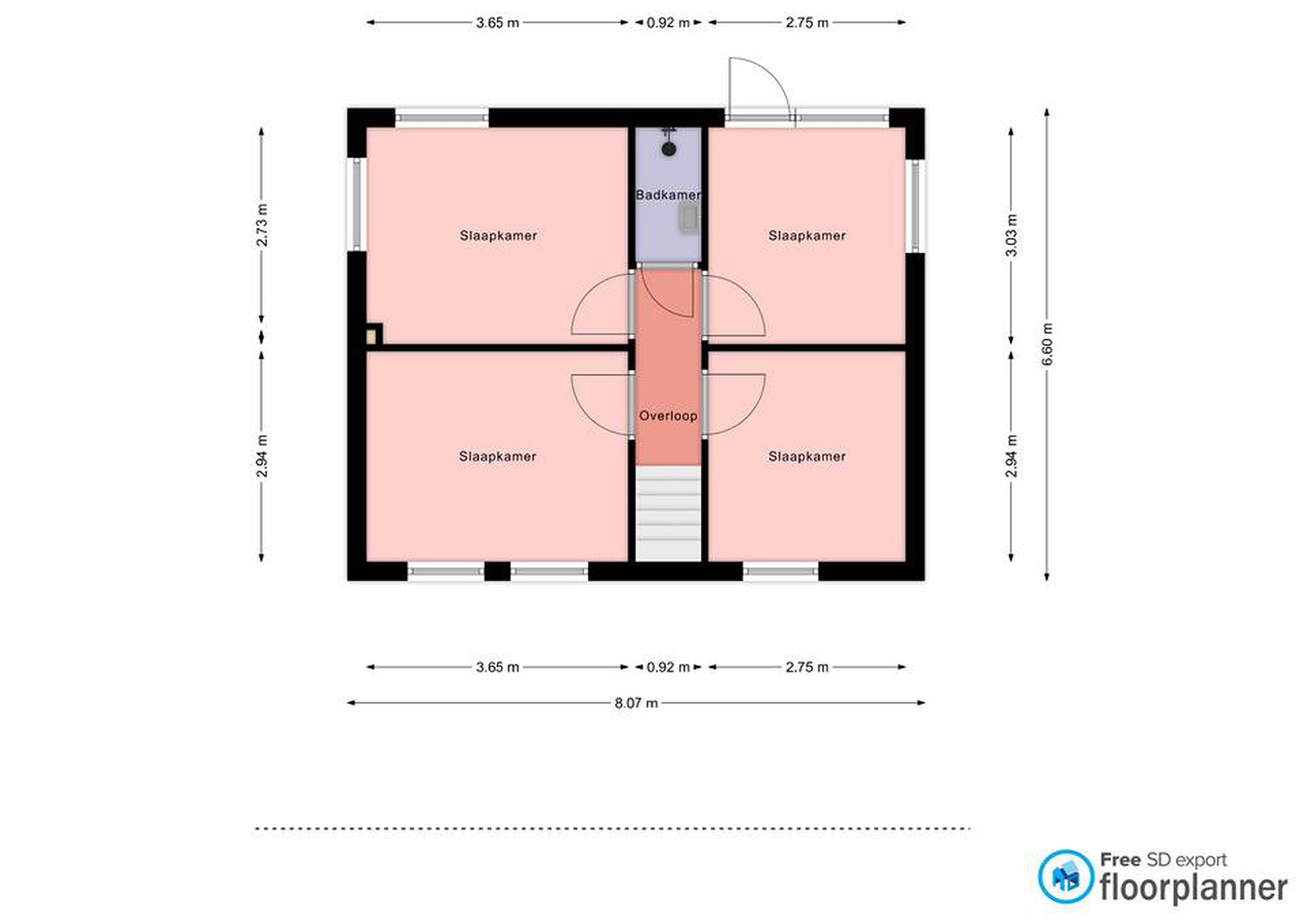 De slaapkamers zijn via de overloop te bereiken. Twee slaapkamers zijn voorzien van een inbouwkast.