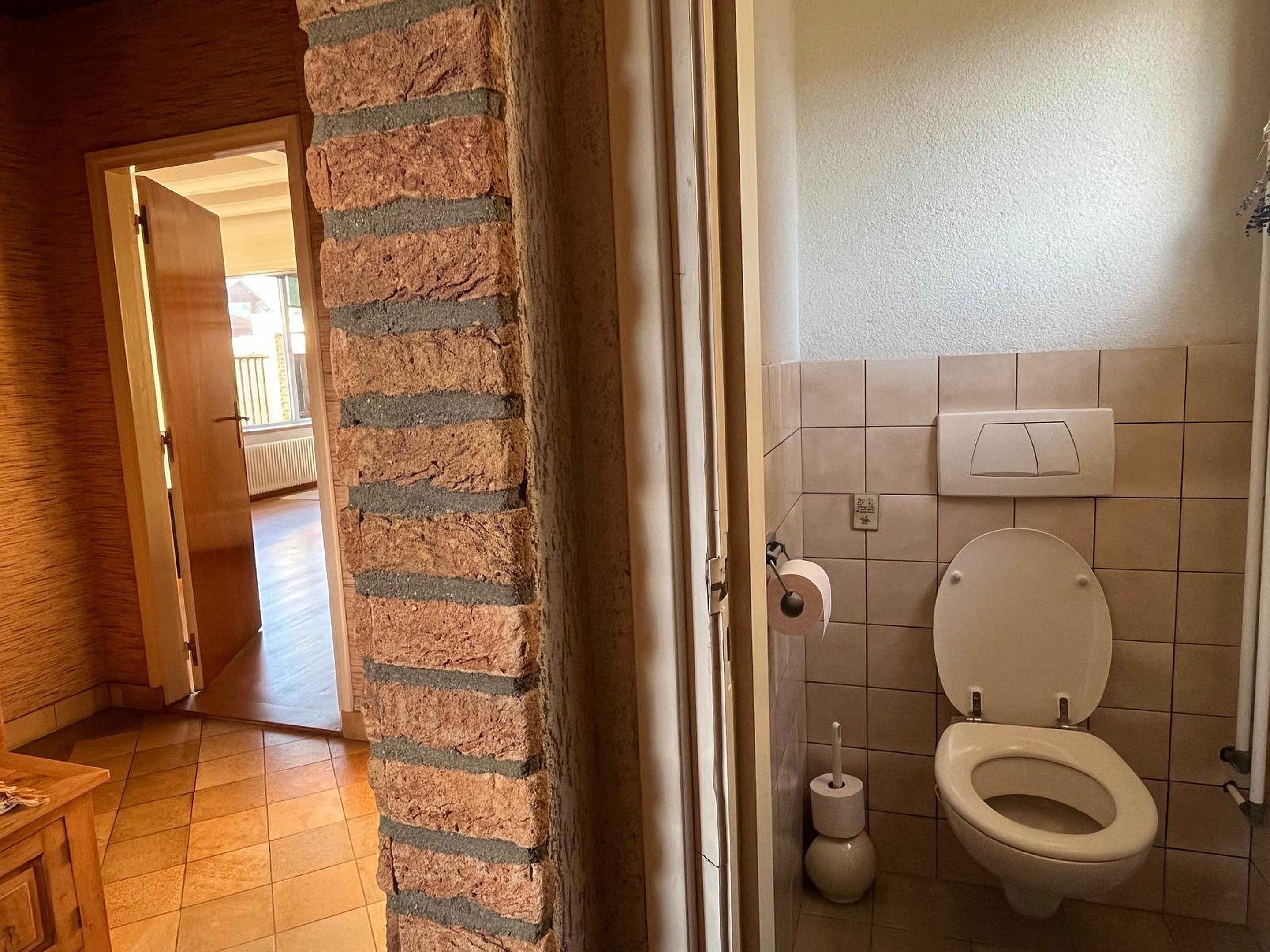 Tevens bevindt zich hier de houten trap naar de verdieping en het toilet.