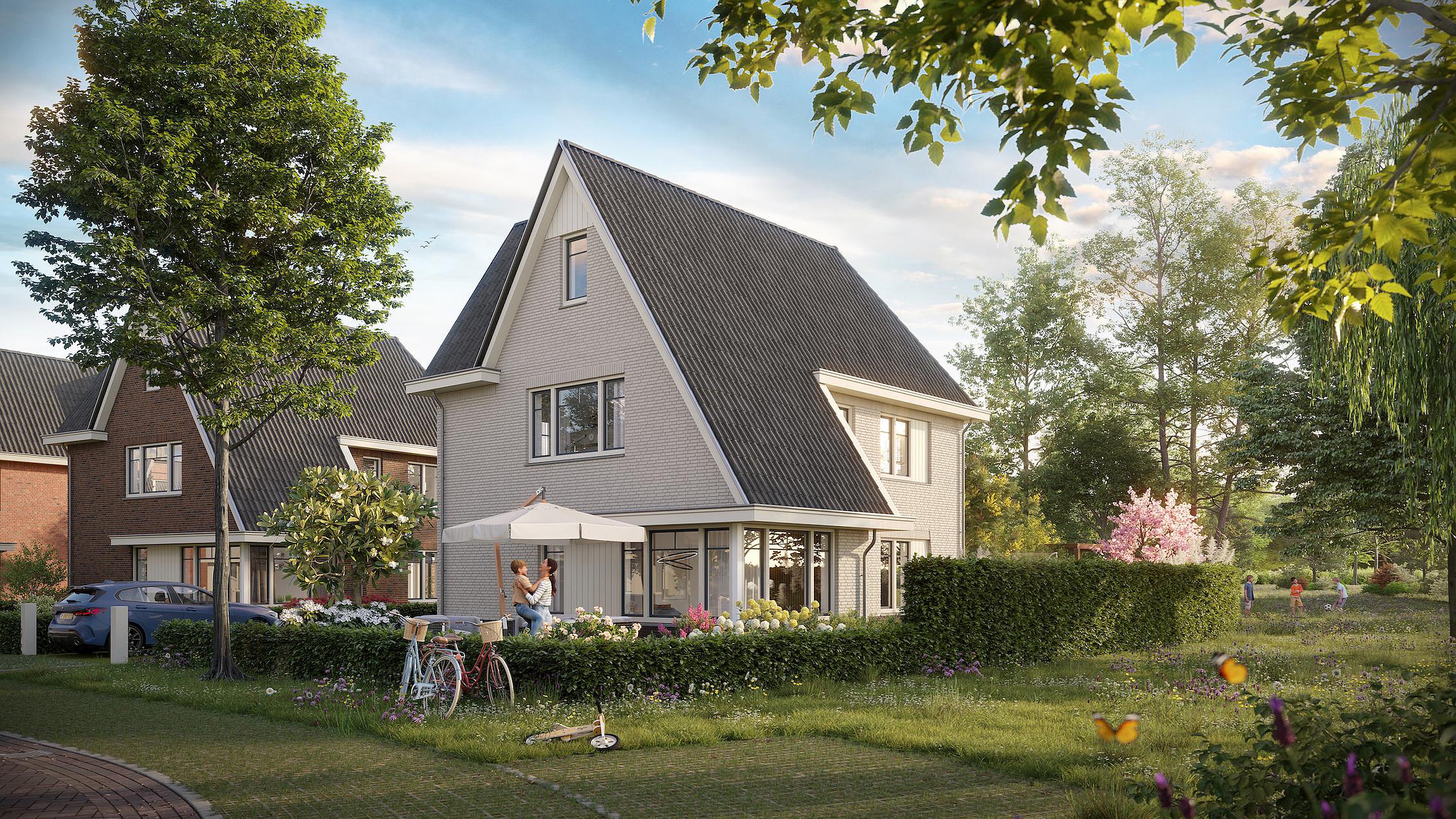 Voor de deur wordt een brede rijloper gerealiseerd, met aan één zijde o.a. ‘groene’ parkeervakken en aan weerszijde een bredere strook van groen. Dit versterkt het gevoel van een landschapspark en zorgt direct voor duurzame wateropvang. Aan het parkeerbeleid is veel aandacht besteed. In de wijk is voldoende openbare parkeergelegenheid.