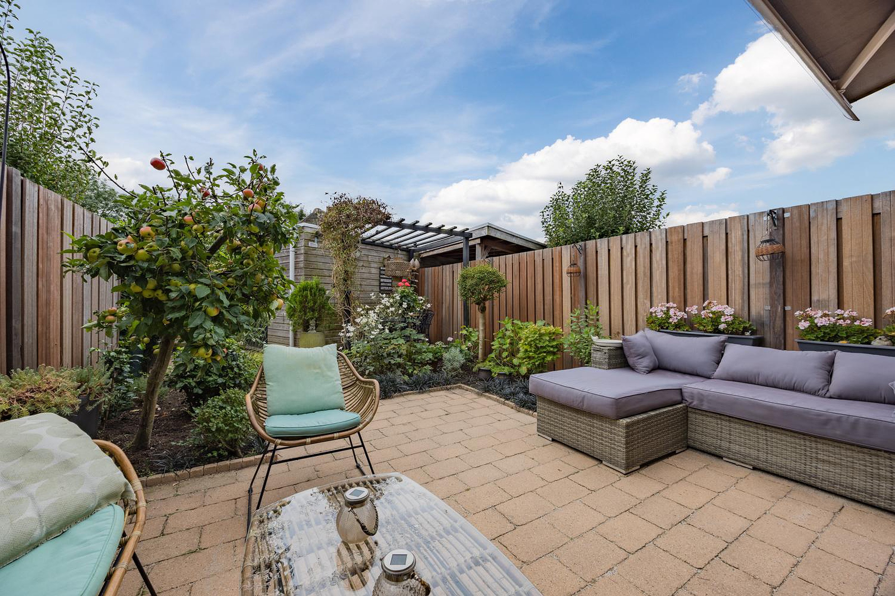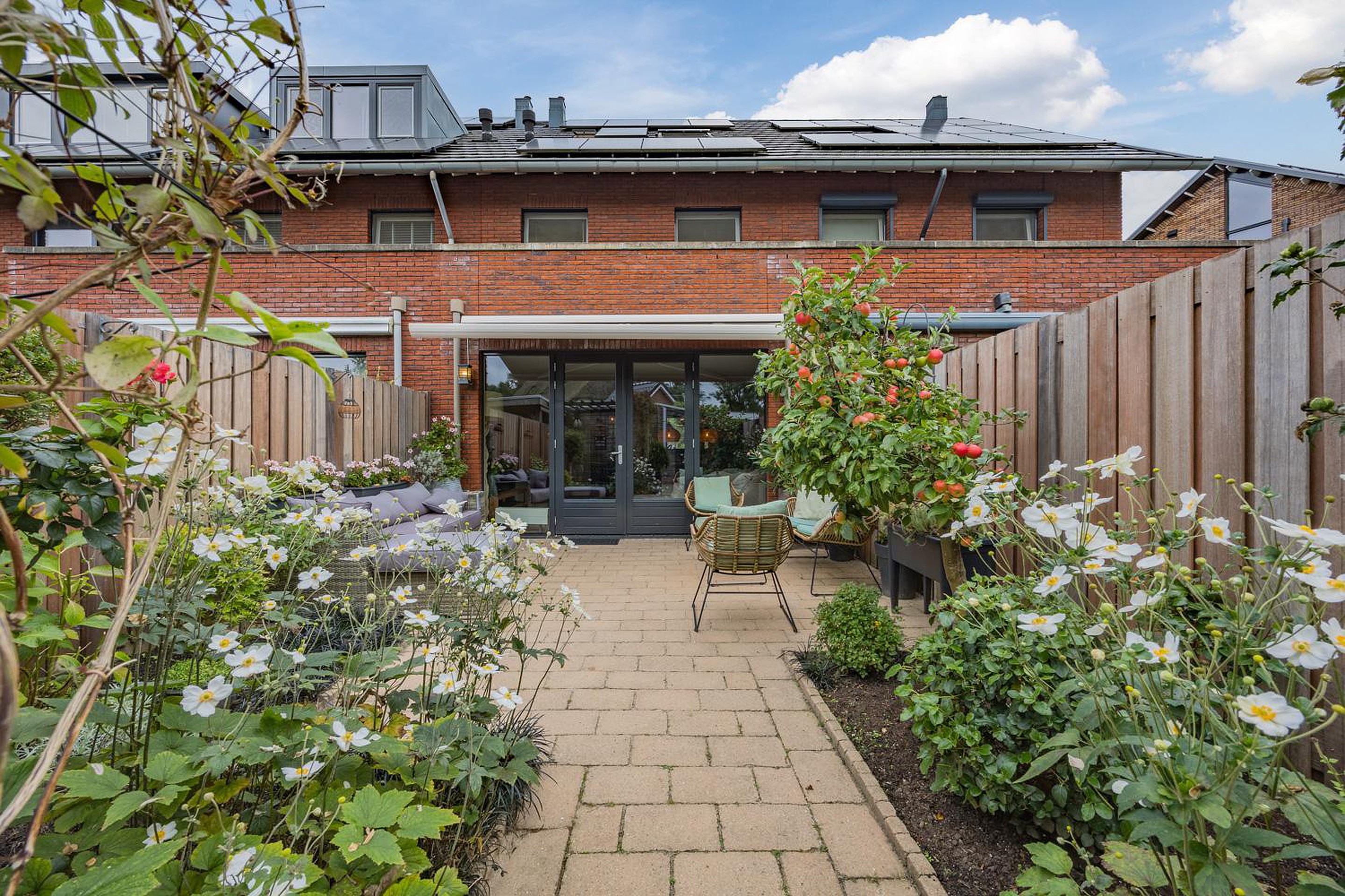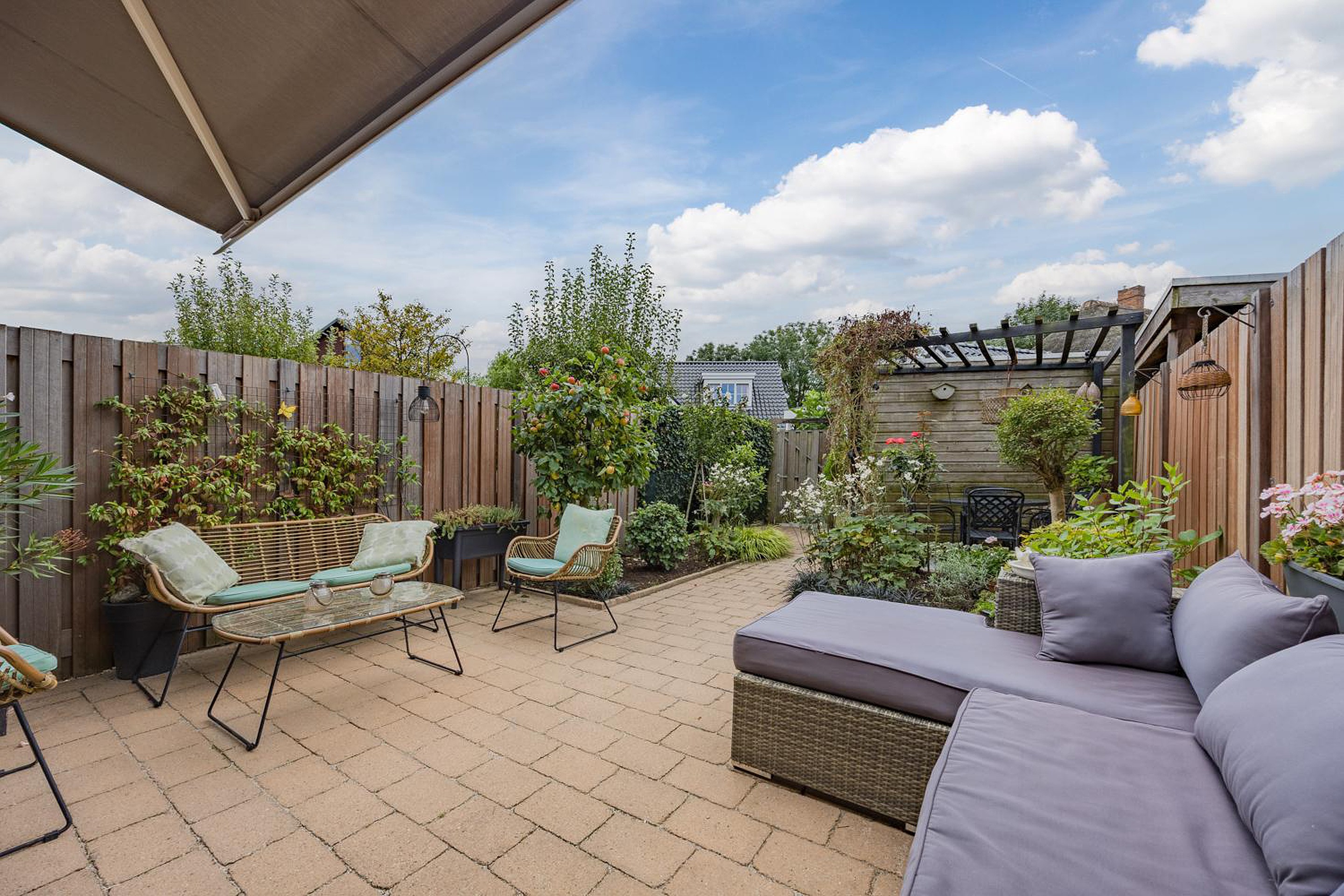 - achtertuin (ZW) fraai aangelegd met achterom, elektrisch bedienbaar zonnescherm, veel zon en privacy;