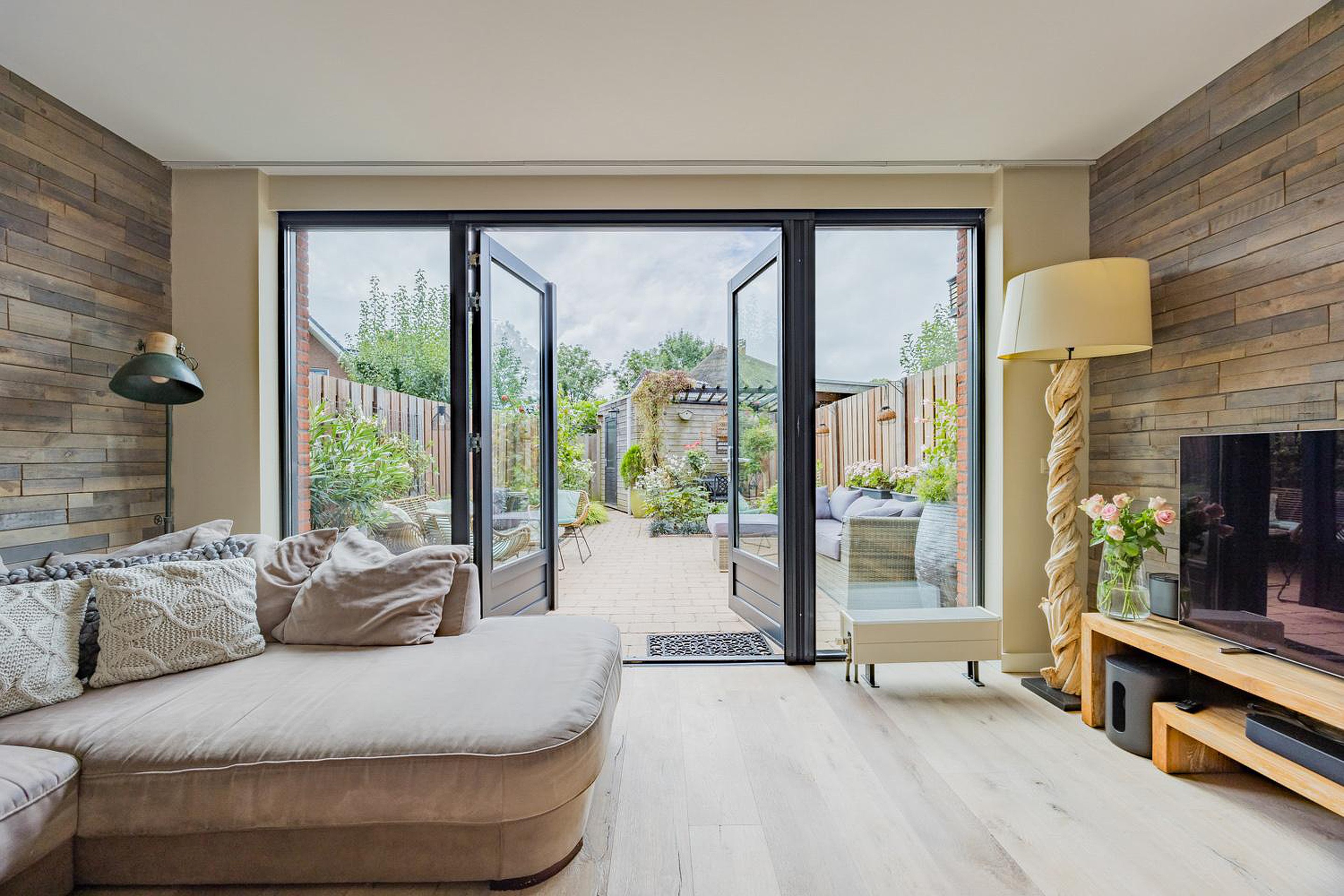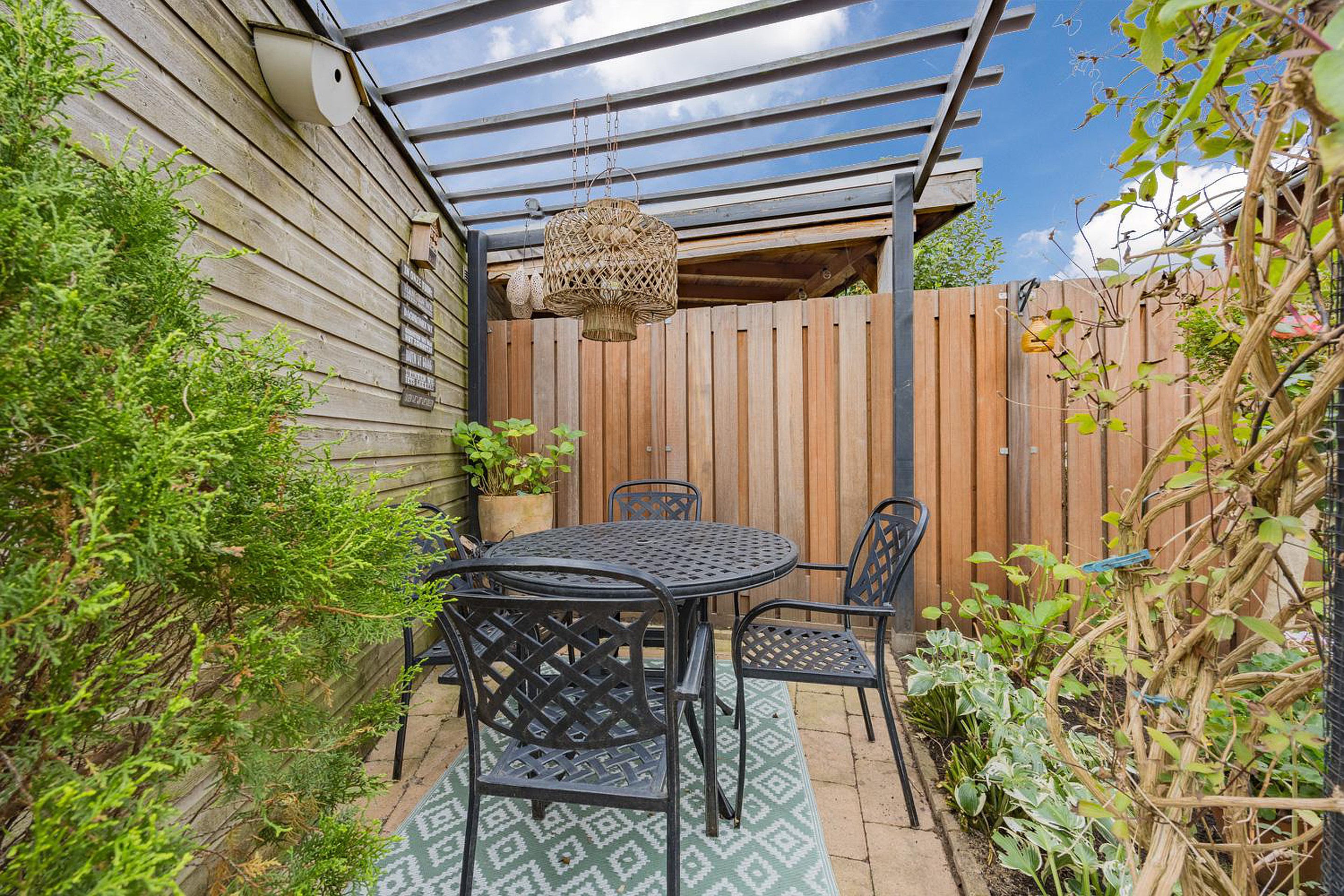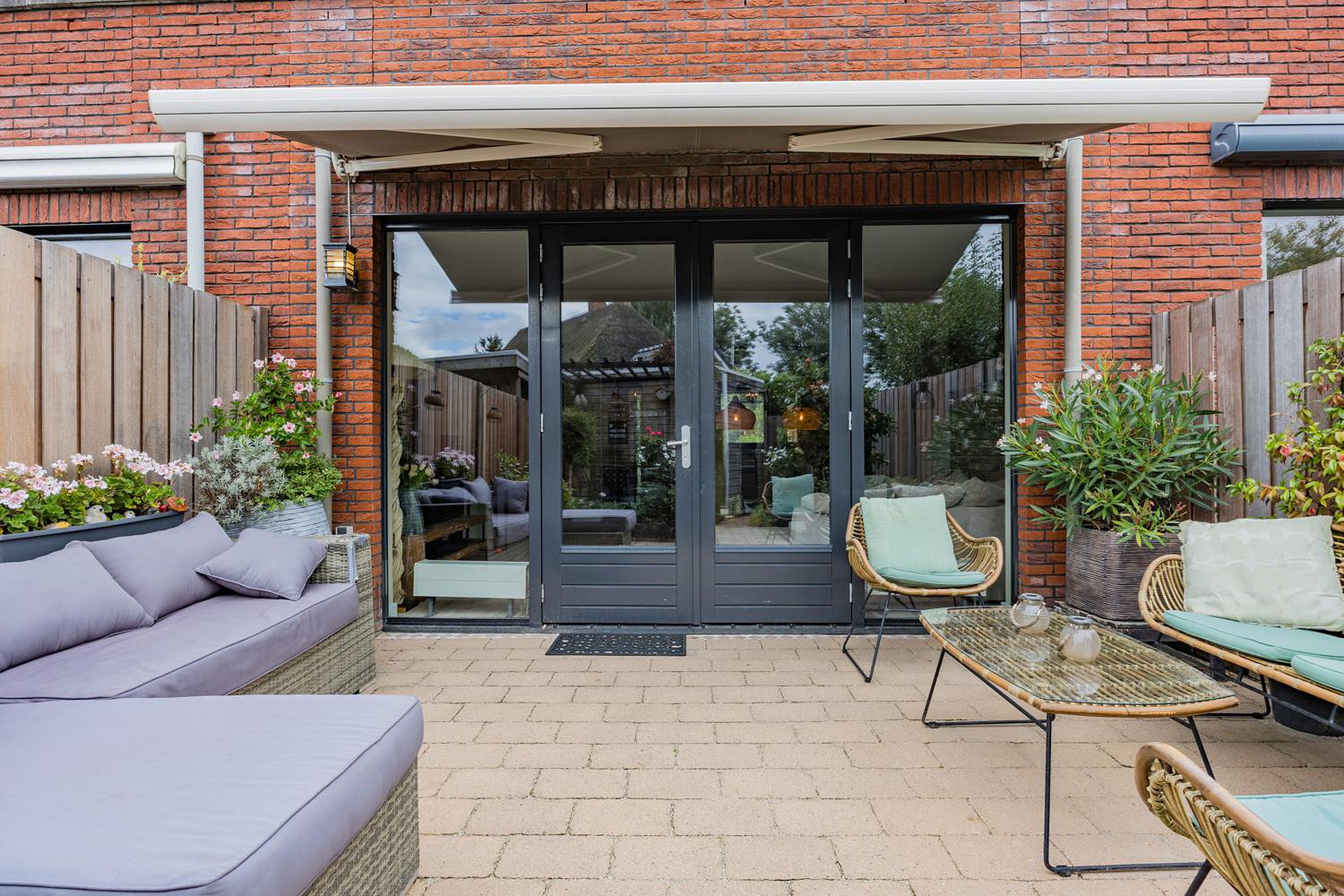 - achtertuin (ZW) fraai aangelegd met achterom, elektrisch bedienbaar zonnescherm, veel zon en privacy;