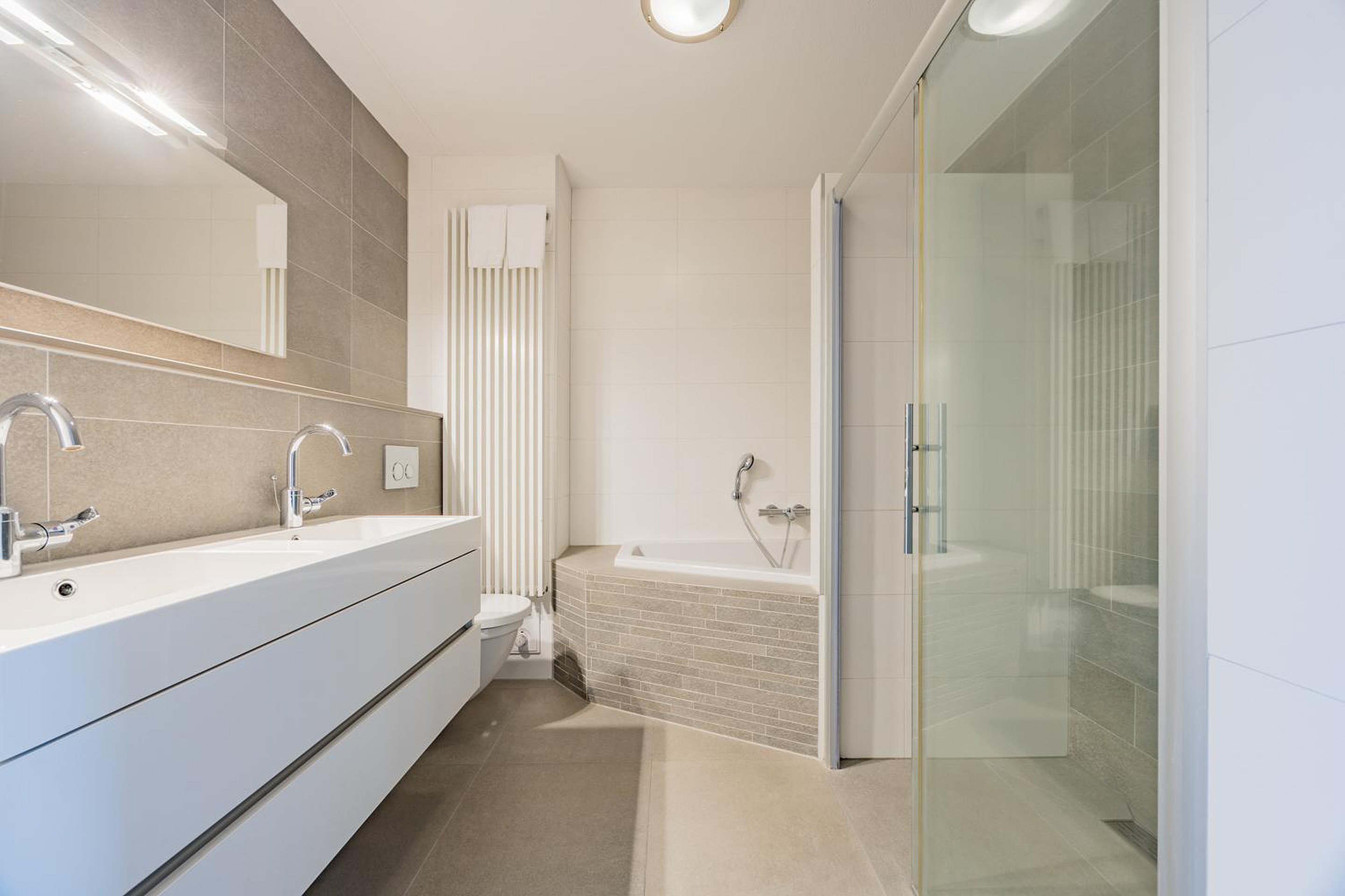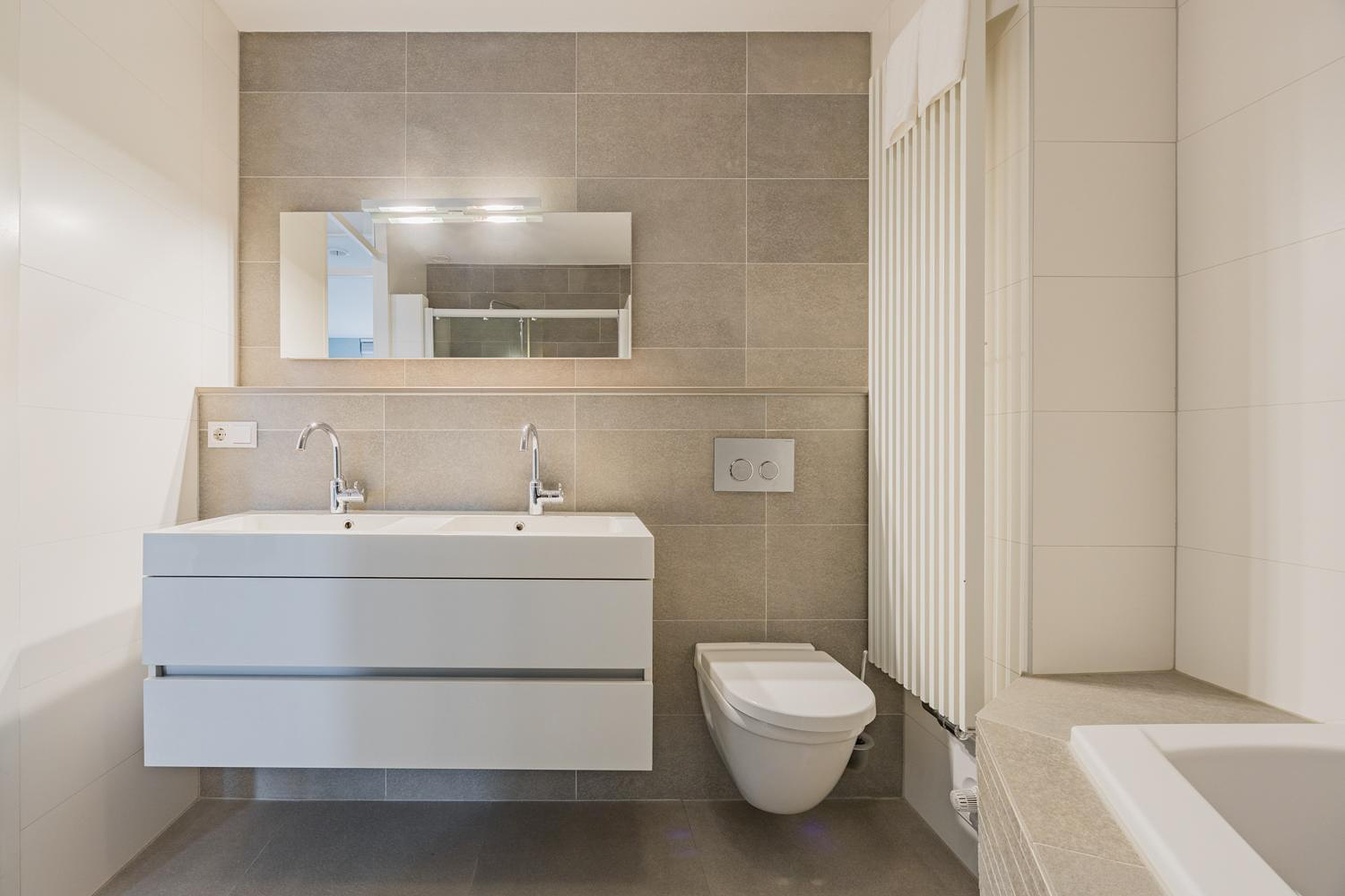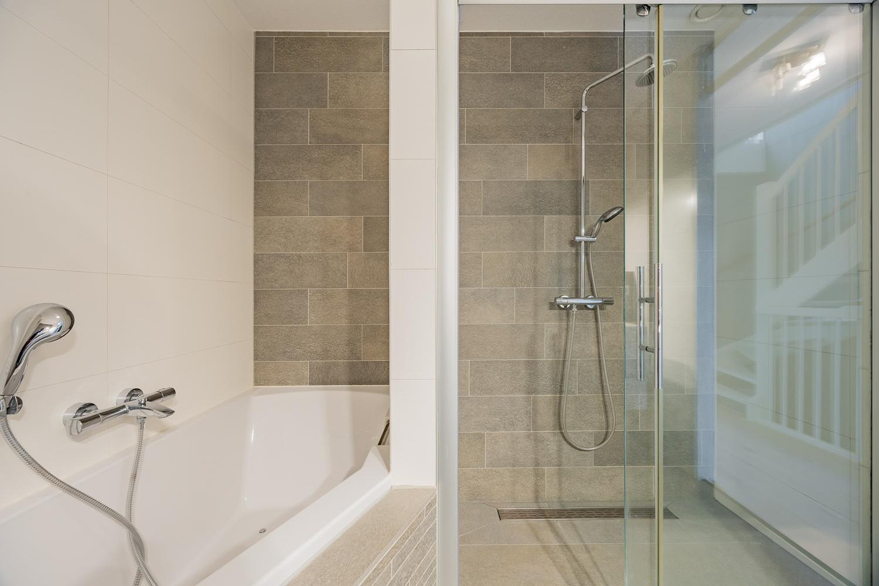 1e verdieping: overloop, 3 slaapkamers, moderne badkamer voorzien van ligbad, inloopdouche, radiator, wastafelmeubel en 2e toilet.