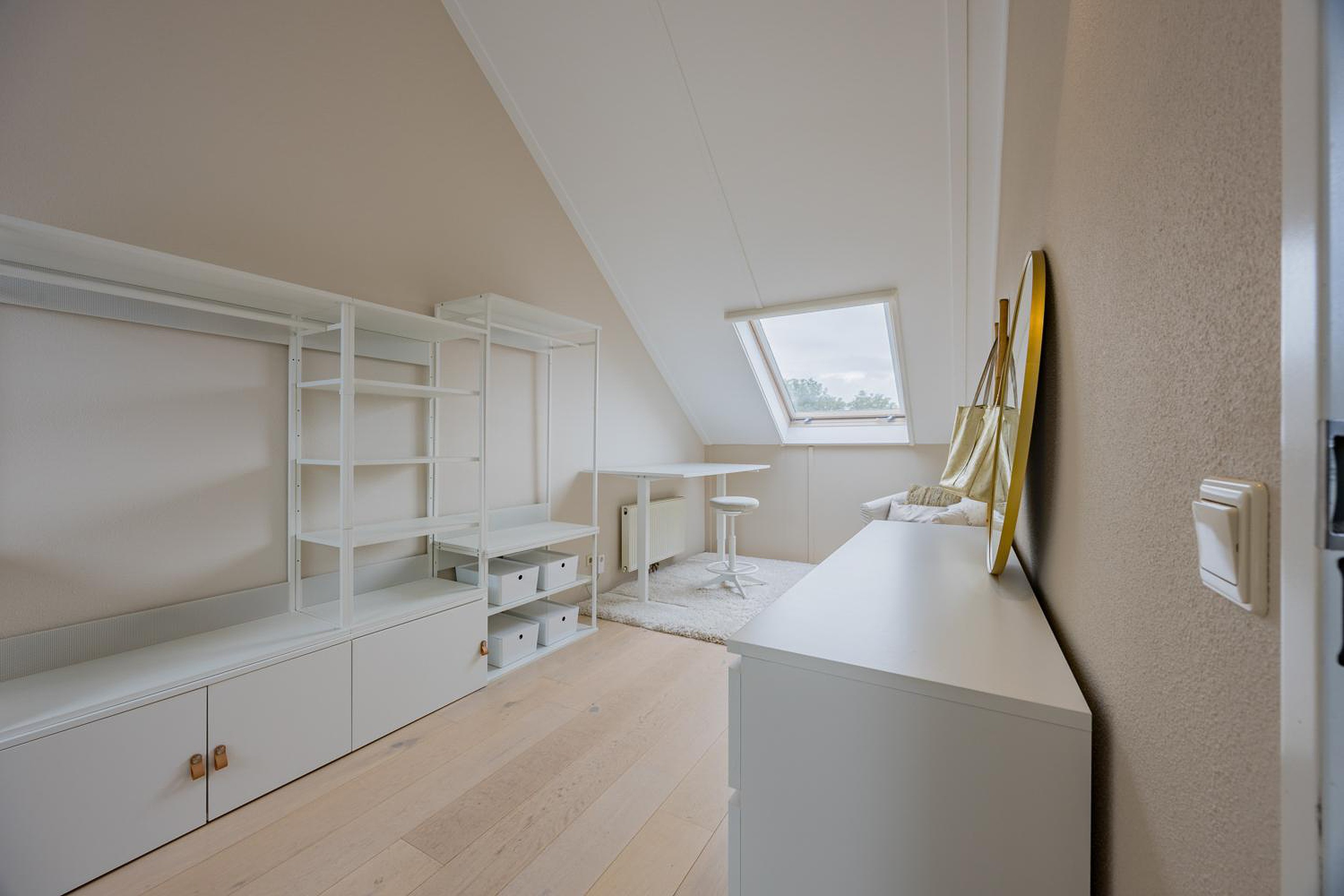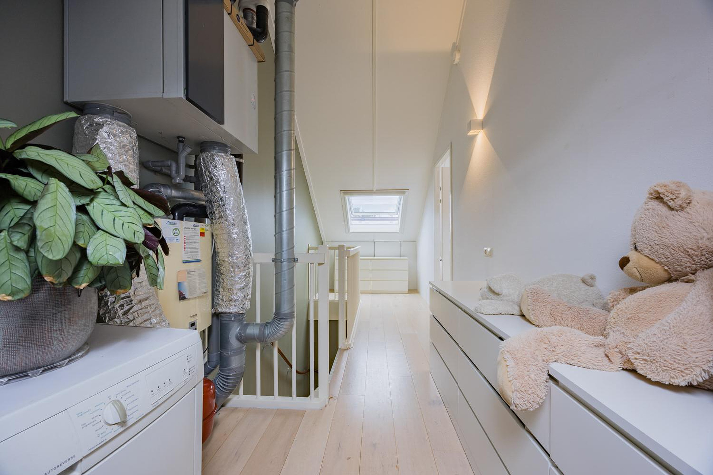 2e verdieping: via vaste trap bereikbare verdieping, voorzolder voorzien van twee dakramen hier is nog mogelijkheid om een kantoor/thuiswerkplek te creëren, wasmachineaansluiting en cv-opstelling, aansluitend royale 4e slaapkamer voorzien van dakraam. Voorts veel bergruimte aan voor- en achterzijde achter knieschotten.