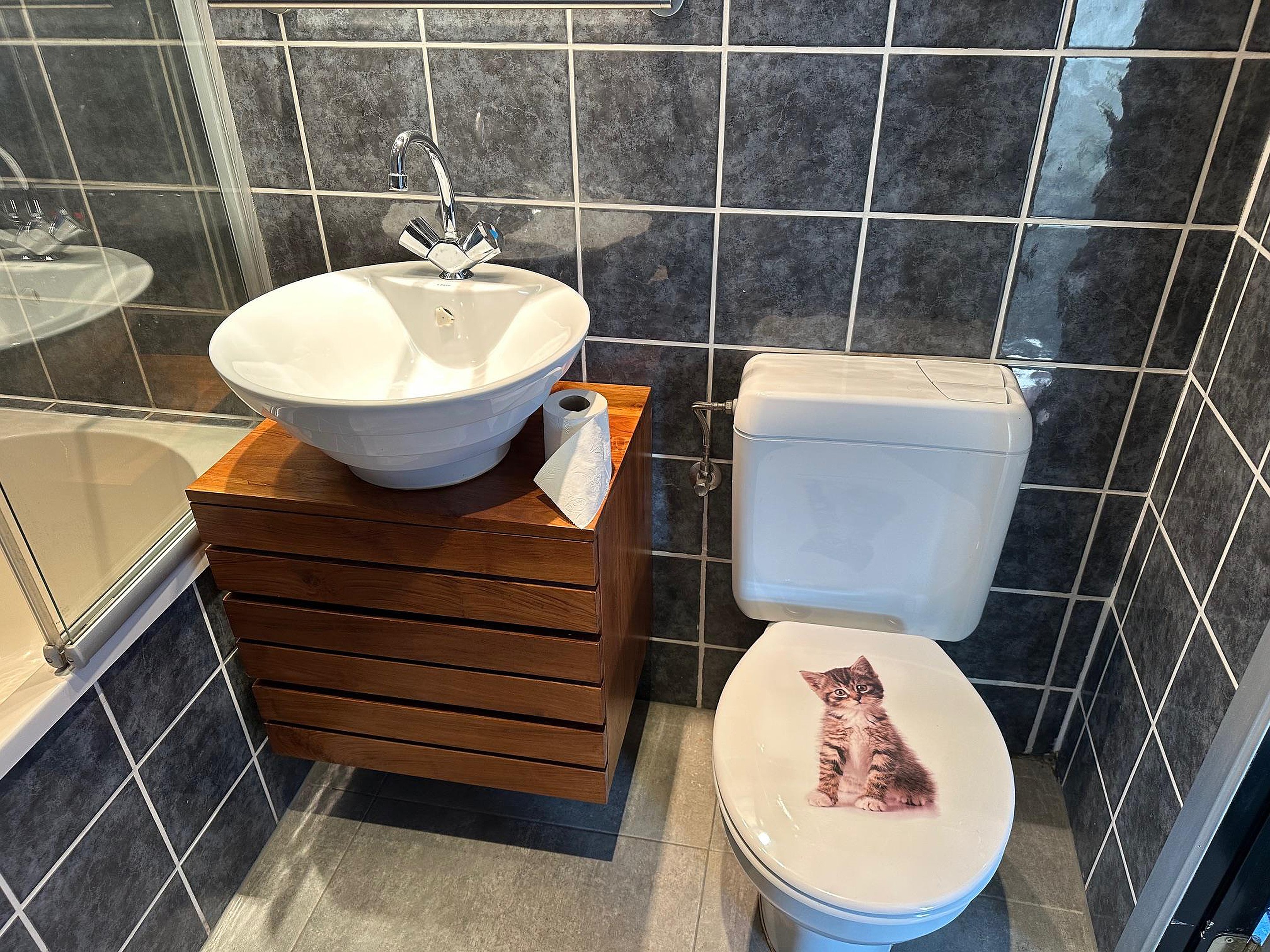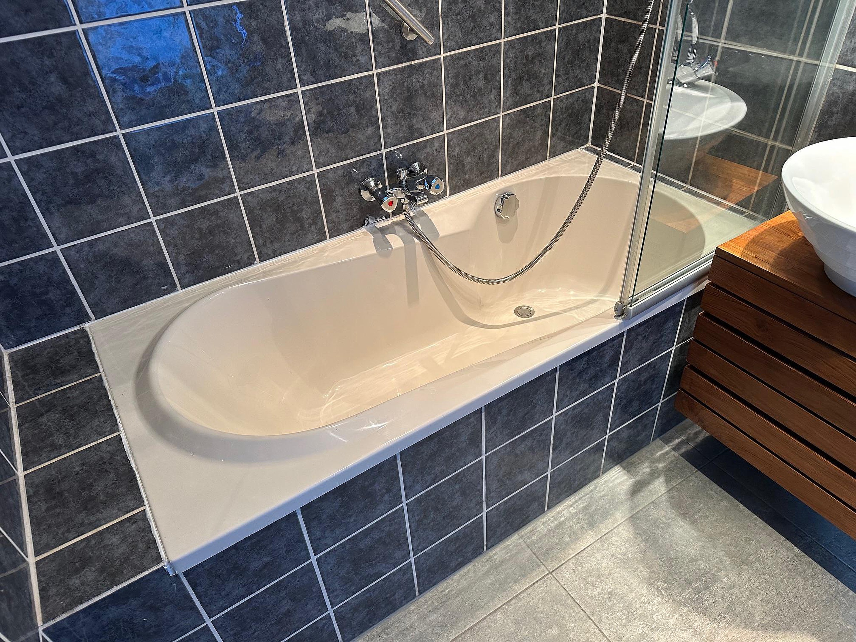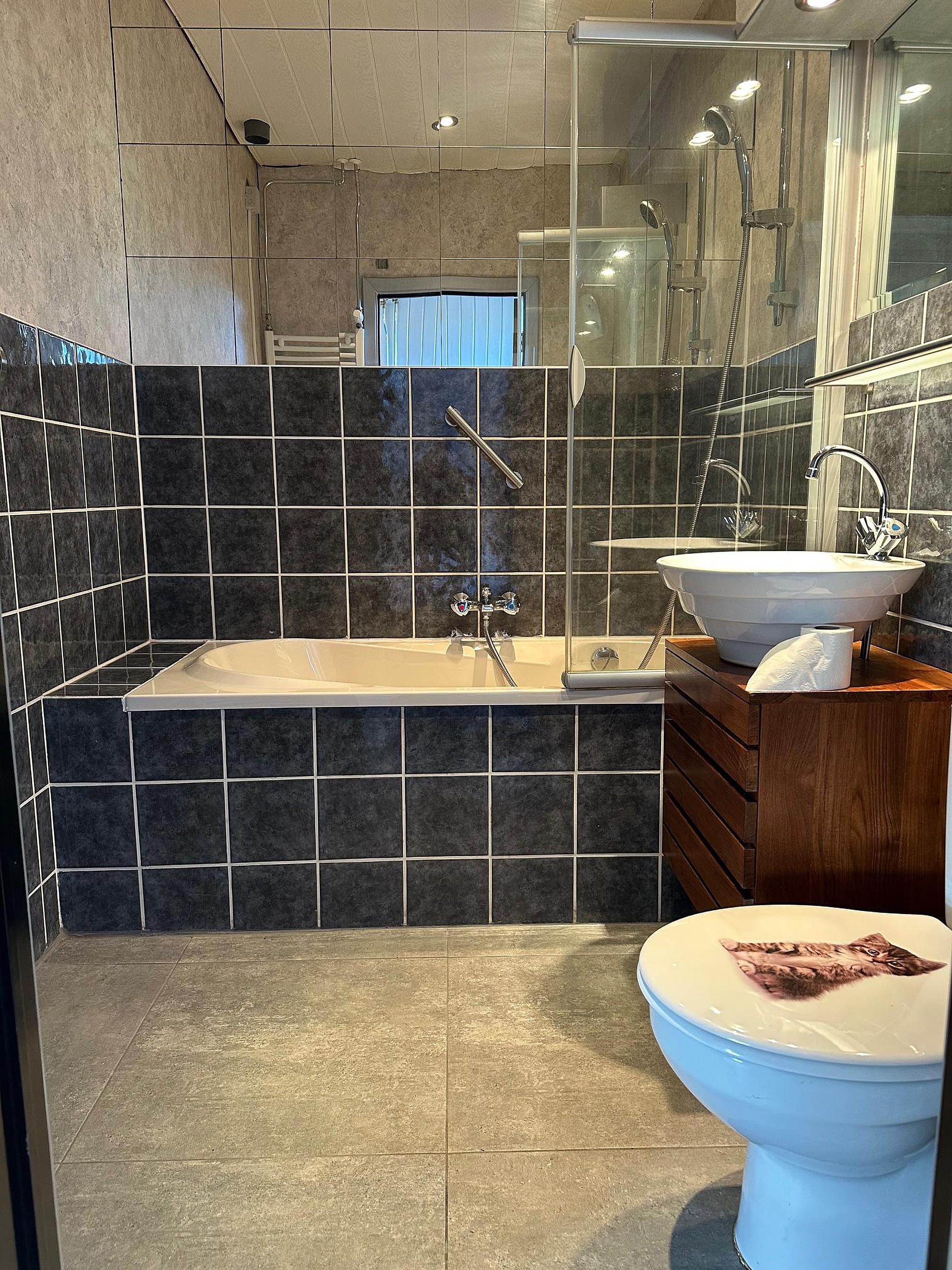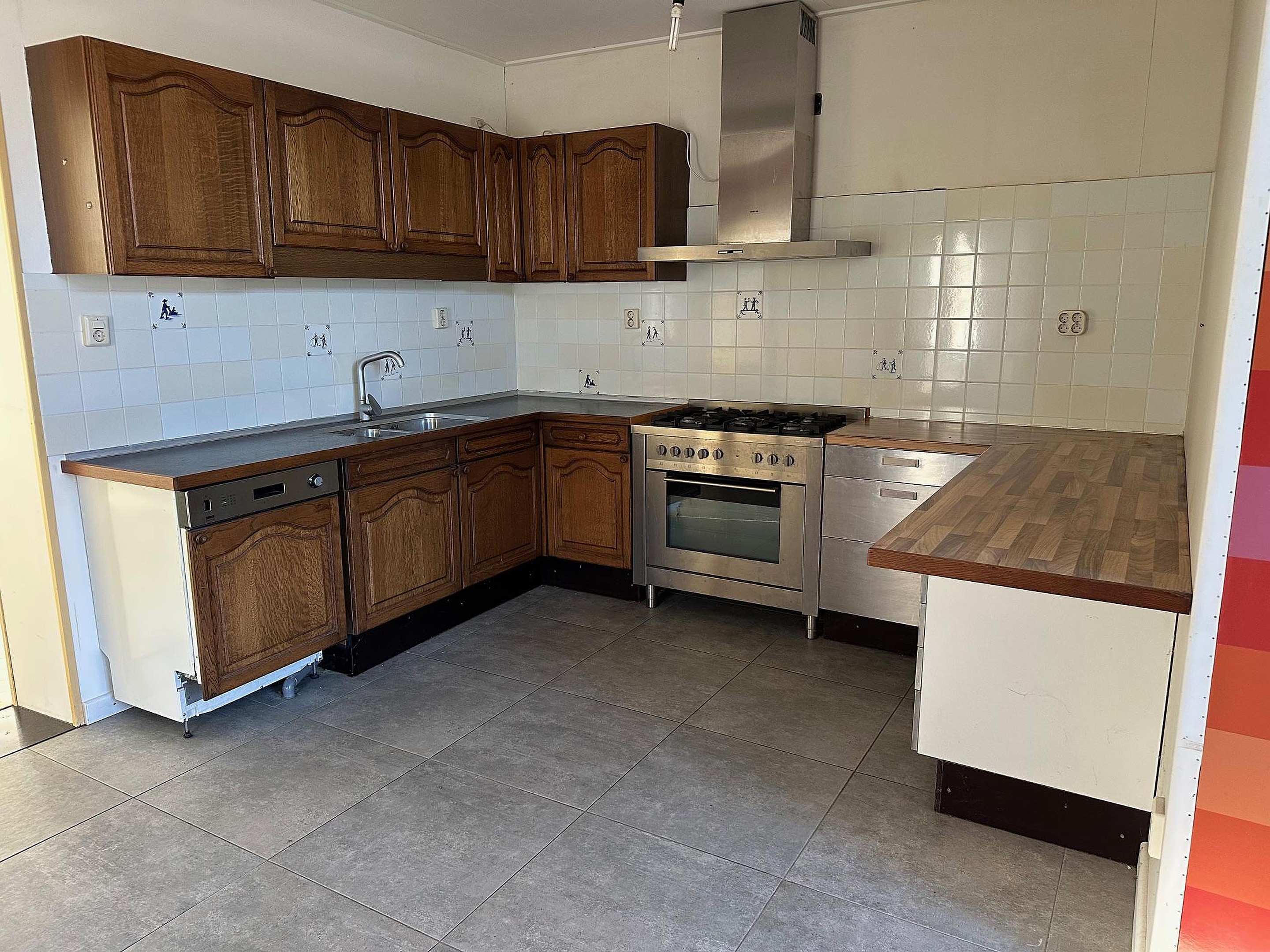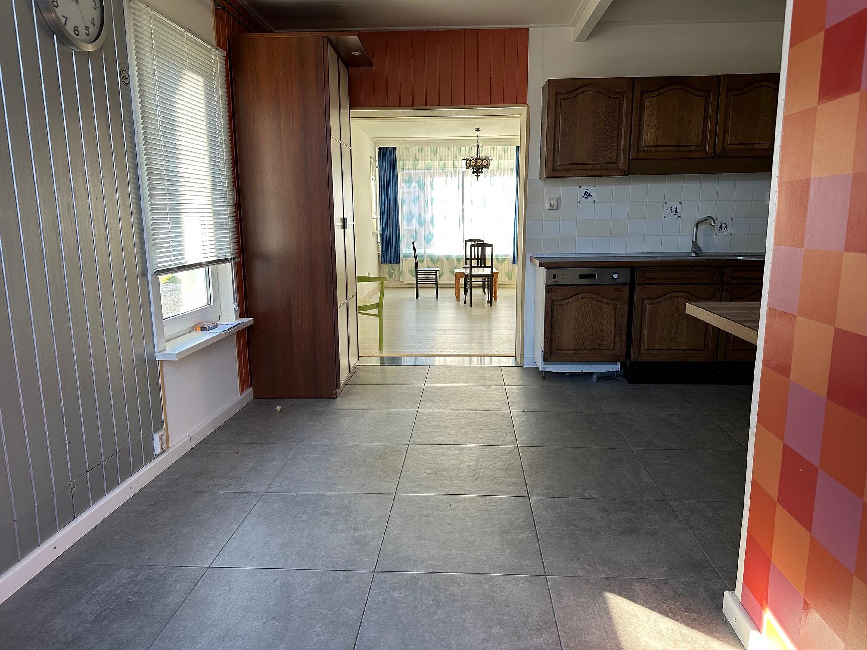Woonkamer met meterkast (12 groepen en aardlekschakelaars) en aanbouw aan de achterzijde. Hier is een tweede keuken met gaskooktoestel met oven en wasemkap, vaatwasser en dubbele spoelbak. Achter de keuken is de tweede, nette badkamer met ligbad/douche, wastafelmeubel en toilet.