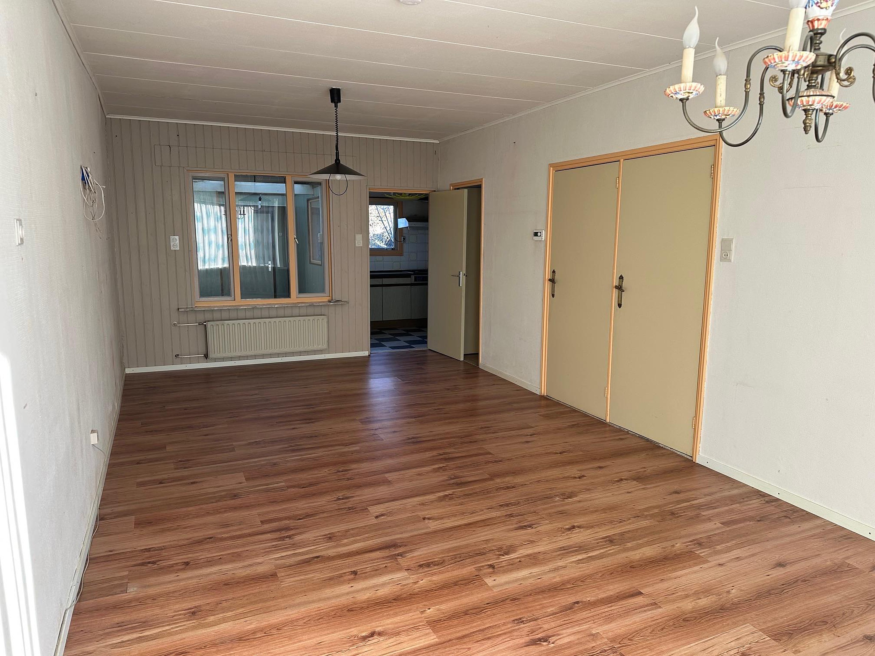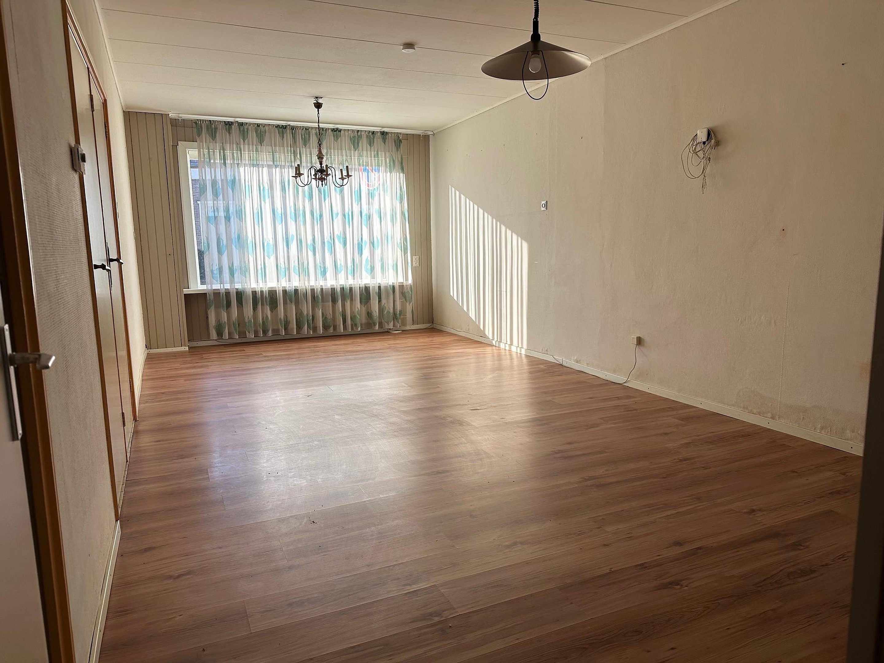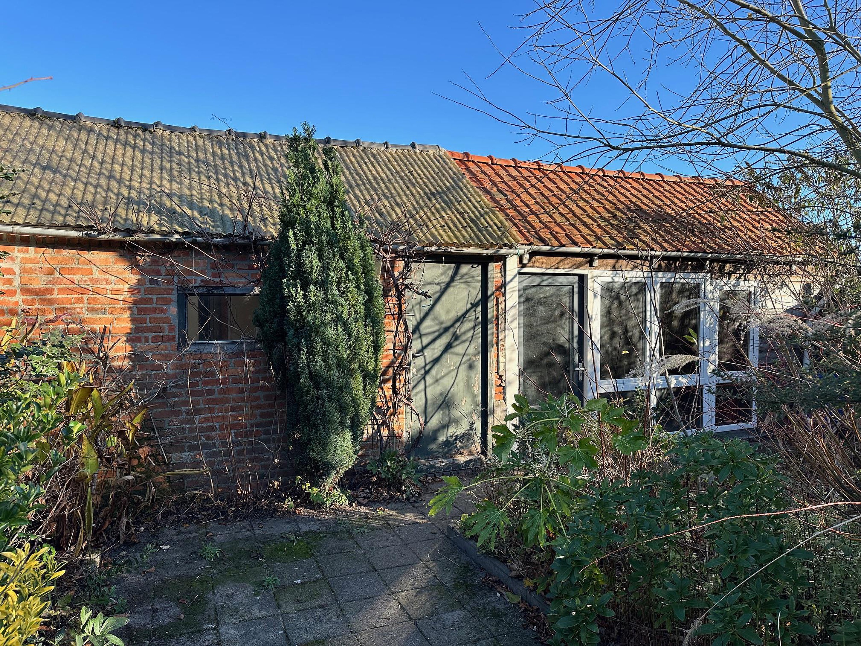 Dubbele, te renoveren woning met aanbouw aan de achterzijde en 2 bergingen. Met 2 woonkamers, 2 keukens, 2 badkamers en 3 slaapkamers.