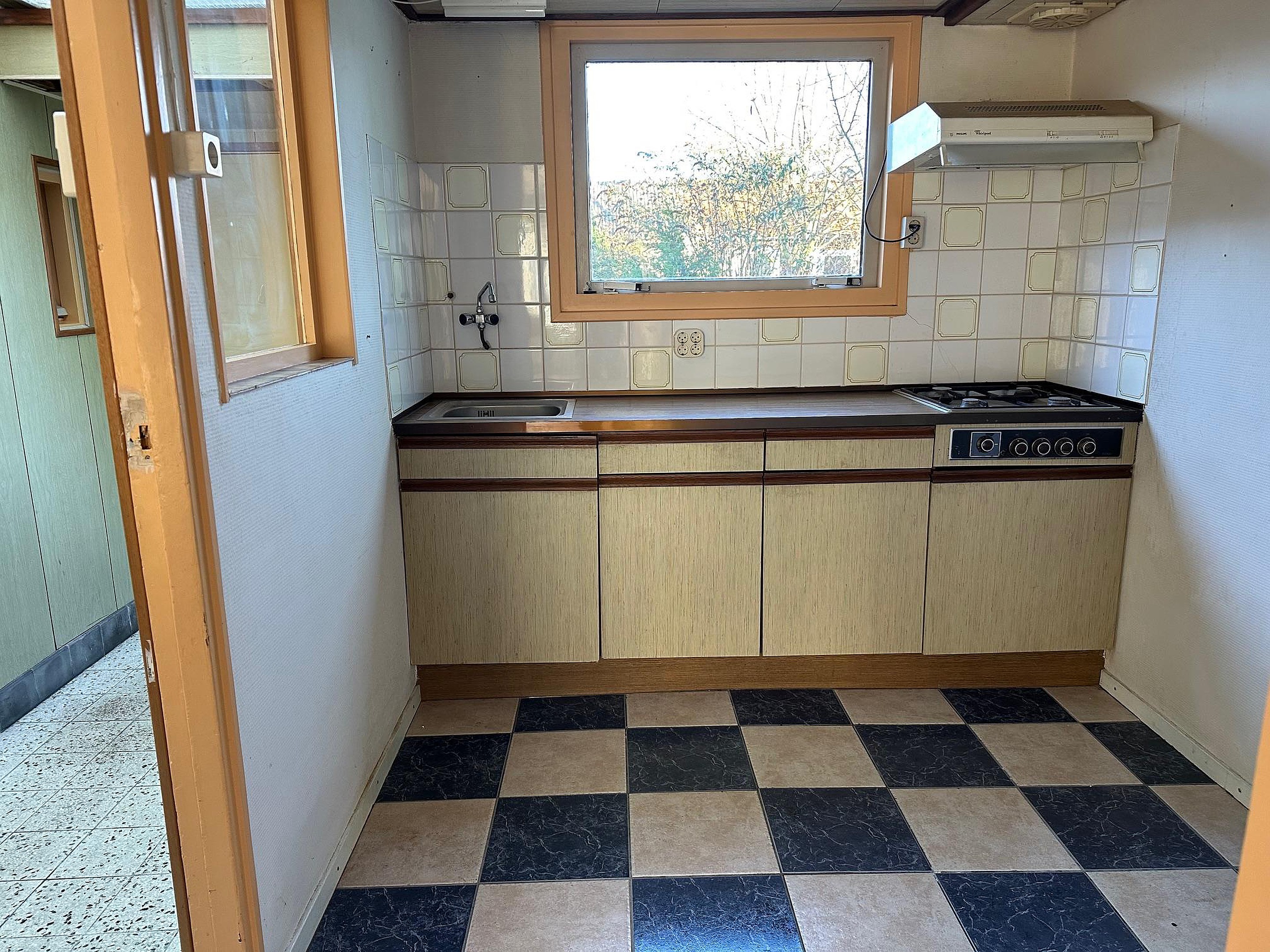 Woonkamer met meterkast (4 groepen en aardlekschakelaar) en kelderkast en aan de achterzijde een aangebouwde keuken met gaskookplaat, wasemkap en spoelbak. Naast de keuken is een bijkeuken met kunststof serre-dak en toegang tot het toilet en een badkamer met wastafel en inloopdouche.