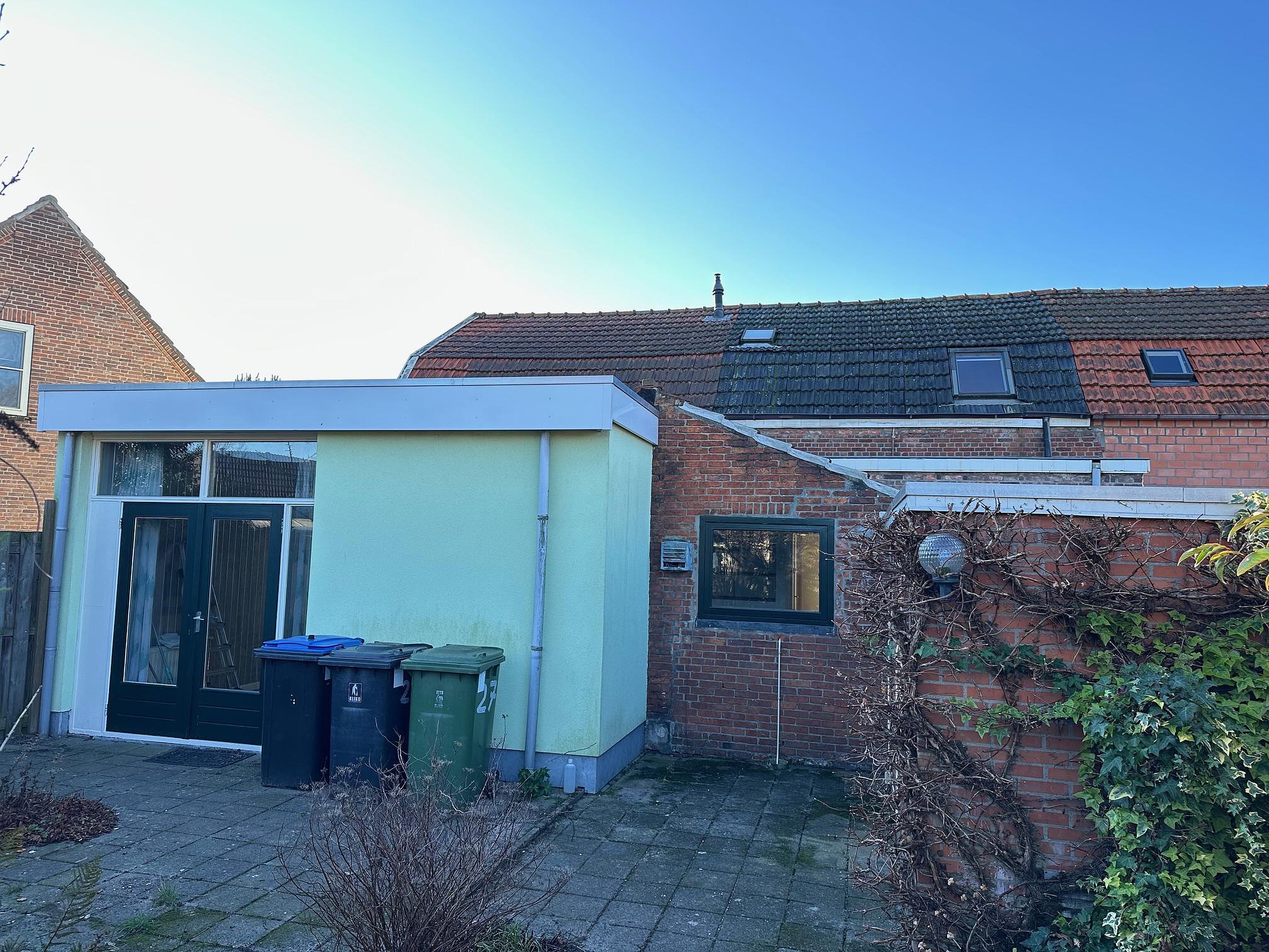 De muren aan voor- en zijkant en een deel van de achterzijde van de woning zijn voorzien van isolatie en stucwerk