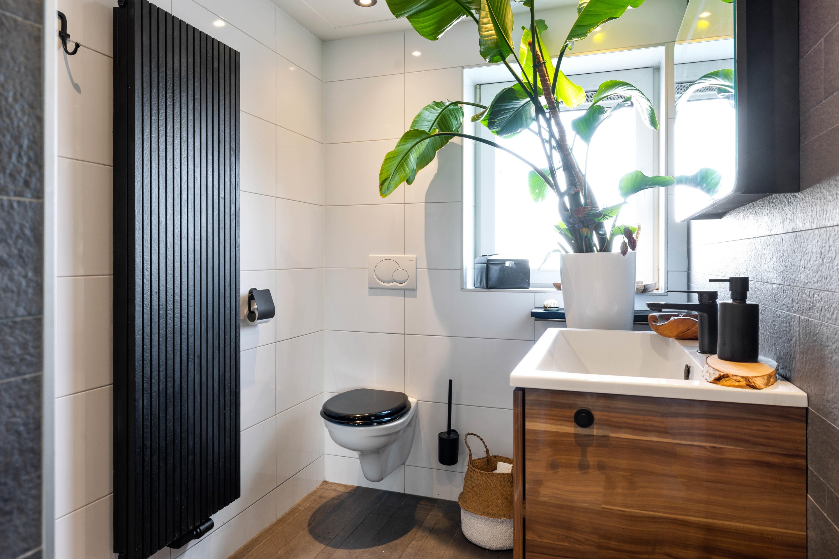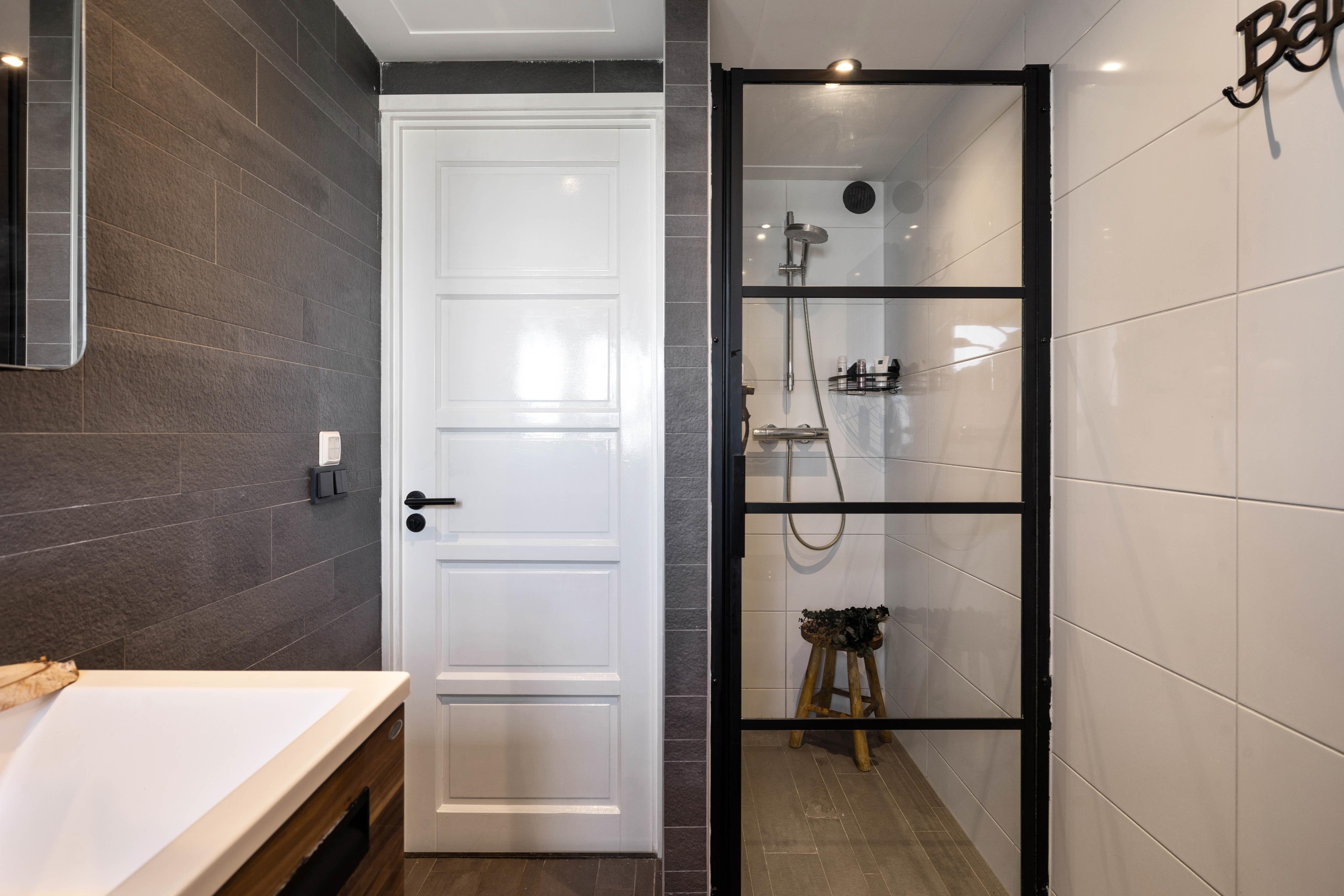 Op de eerste verdieping bevinden zich twee slaapkamers van goed formaat, een moderne badkamer met inloopdouche, wastafelmeubel en toilet, en een aparte waskamer/berging met aansluiting voor wasmachine en droger.