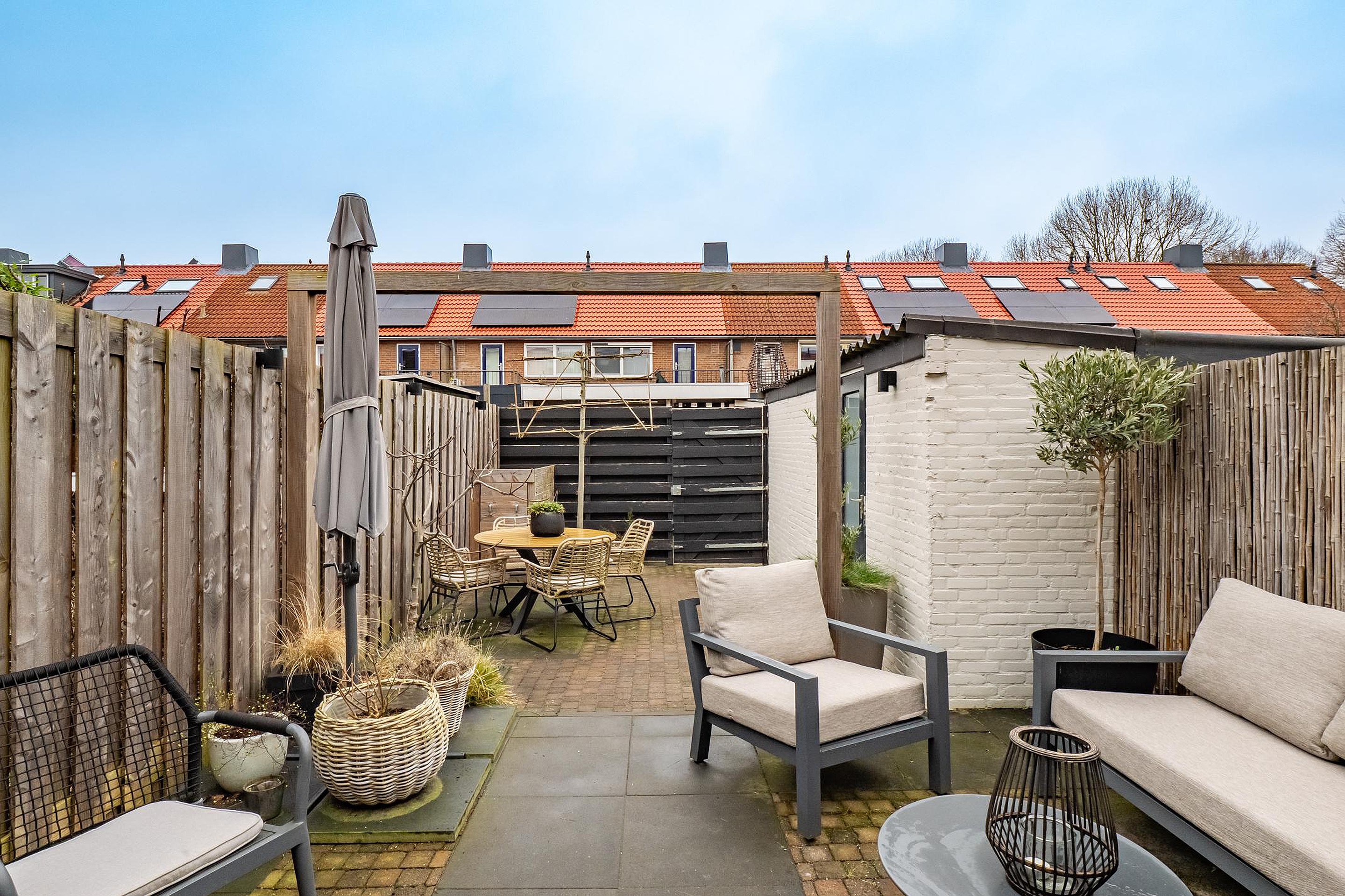 De tuin ligt op het noordwesten, maar door de lengte geniet je de hele dag heerlijk van de zon. Na een lange werkdag schuif je hier aan voor een barbecue of plof je neer met een boek terwijl de zon langzaam zakt.