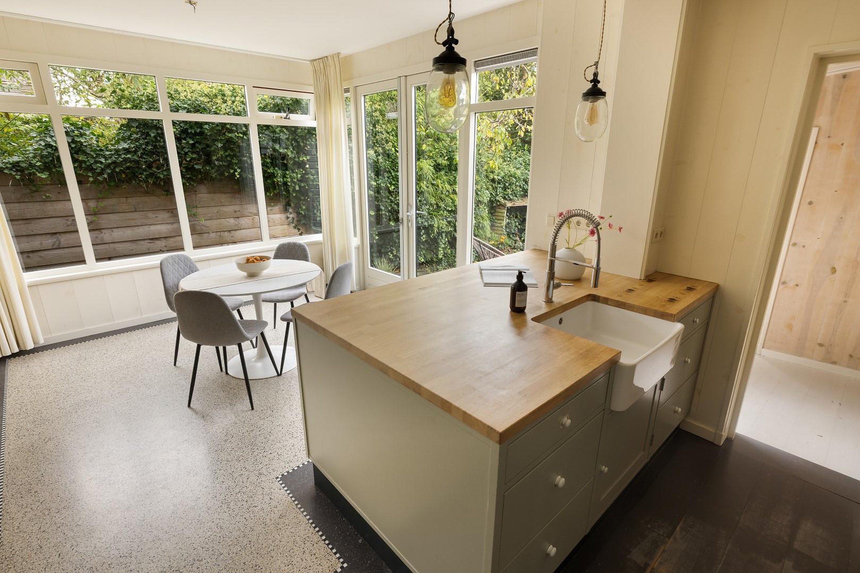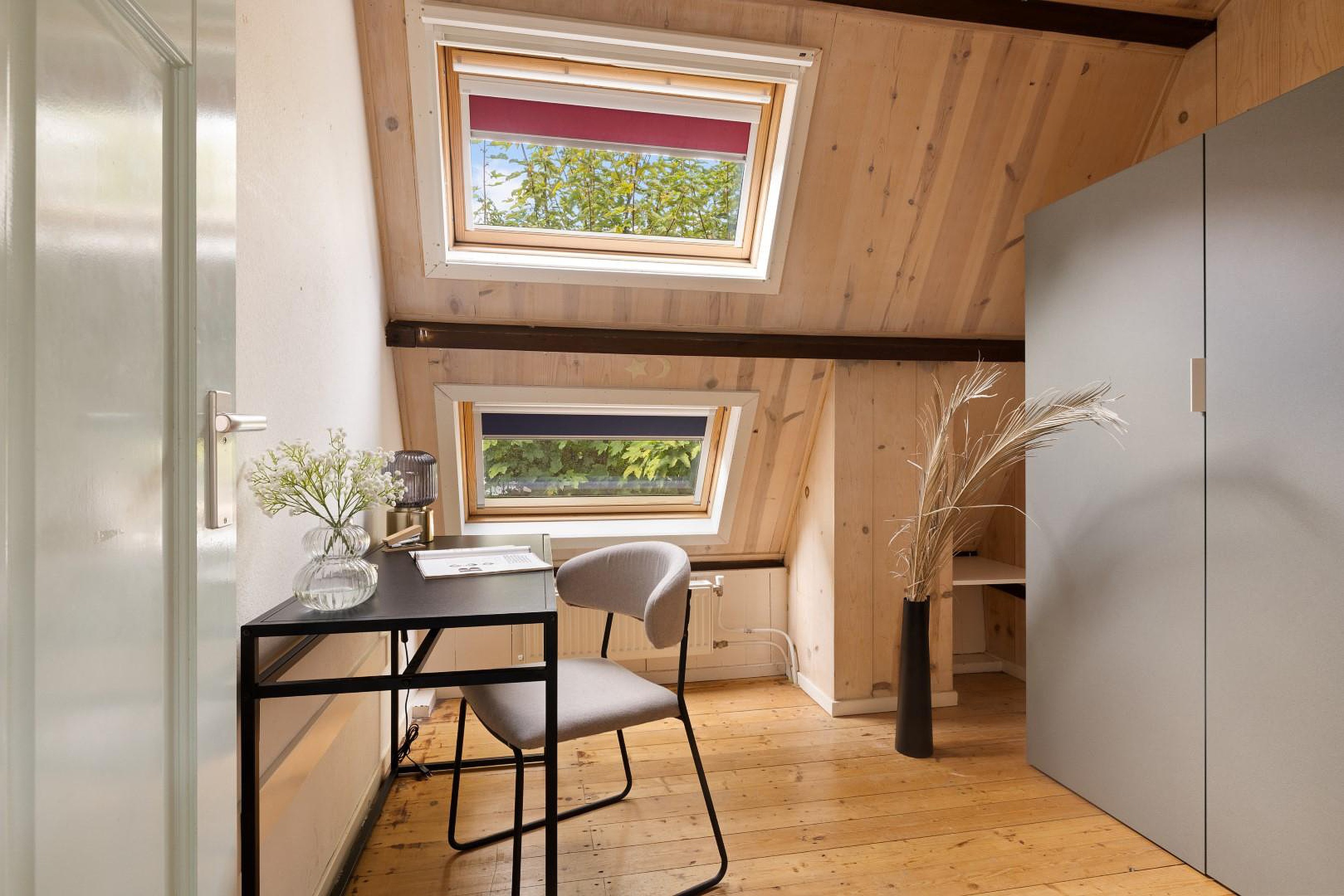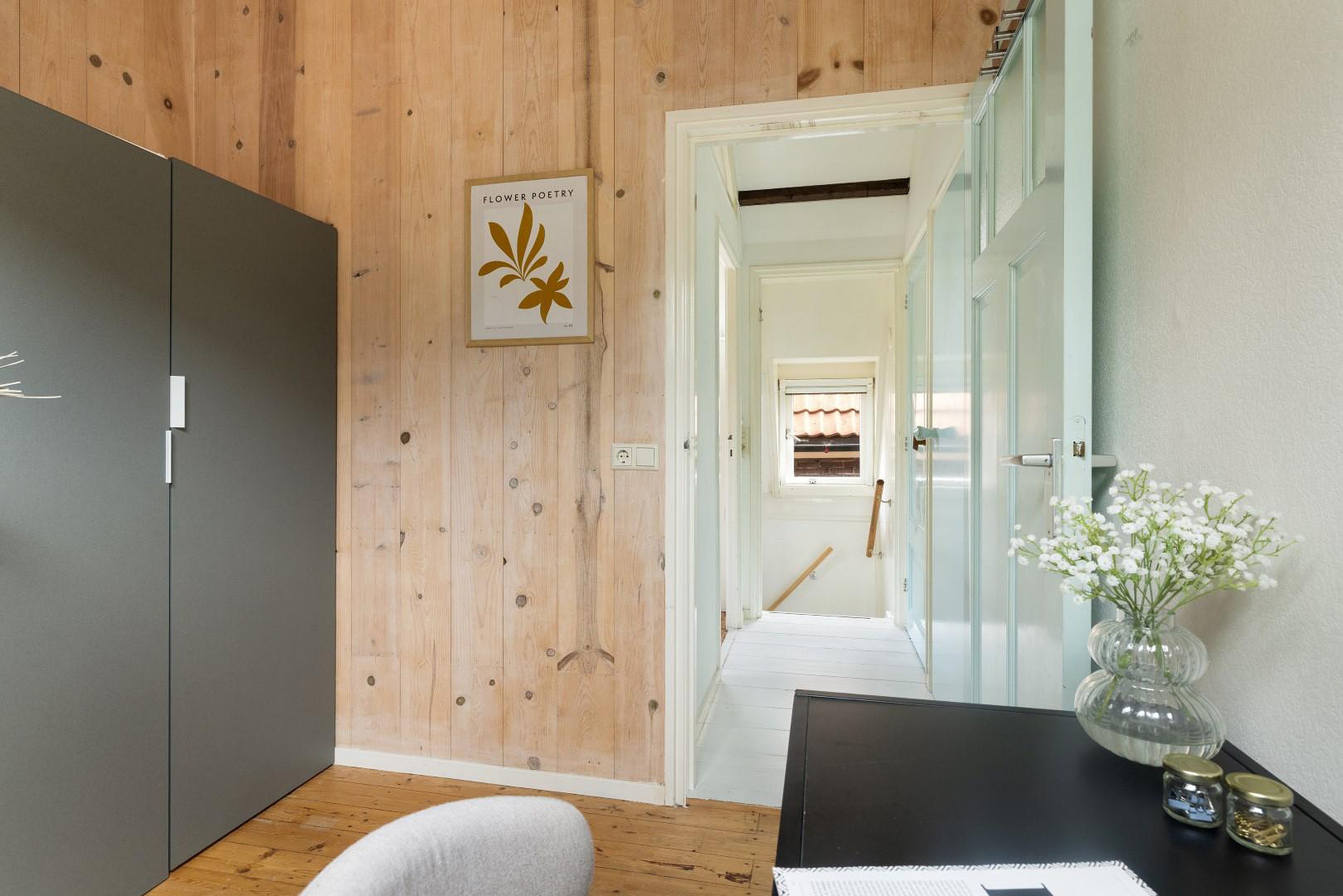 Aansluitend vindt u de praktische bijkeuken van ca. 6 m2, die eveneens toegang geeft tot de achtertuin. Vanuit de bijkeuken bereikt u de eerste slaapkamer, ideaal als kantoor aan huis, praktijkruimte of logeerkamer.