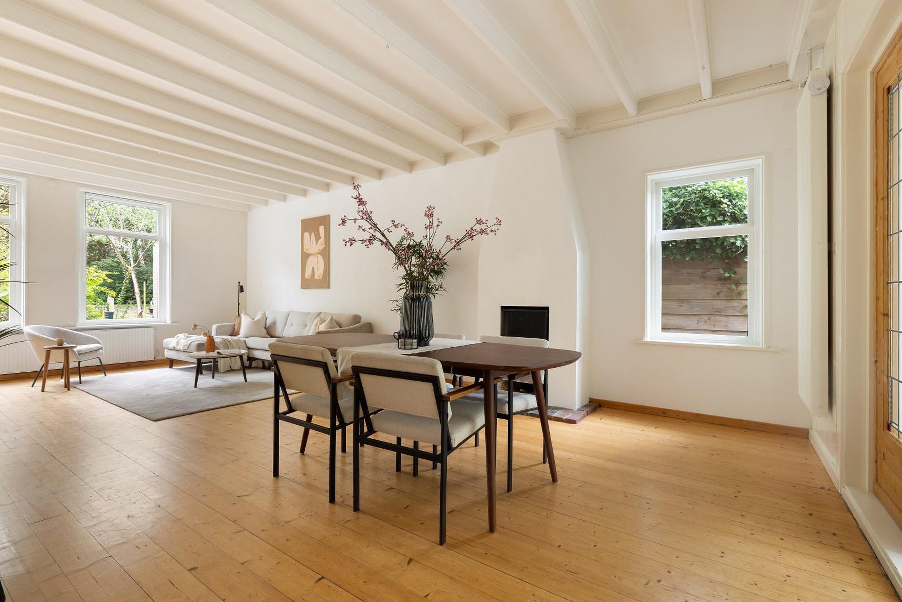 De ruime hal geeft toegang tot een badkamer voorzien van douche, toilet, radiator en de aansluitingen voor de wasmachine en droger. De lichte woonkamer van ca. 35 m2 is voorzien van een sfeervolle houthaard en en-suite deuren naar de karaktervolle woonkeuken.