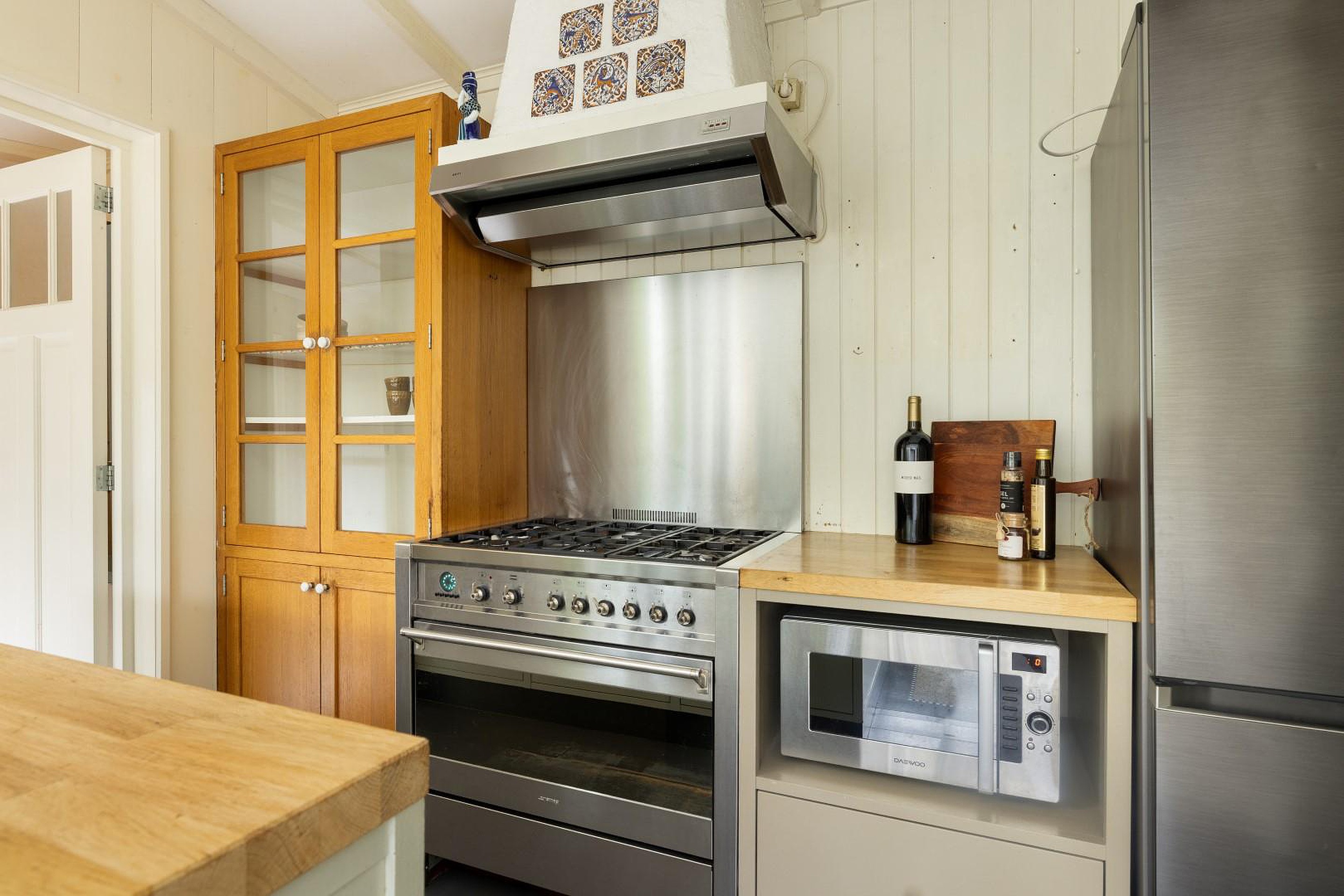 Deze prachtige woonkeuken is voorzien van een granito vloer voorzien van vloerverwarming, openslaande deuren naar de tuin en een riant kookeiland. De keuken is uitgerust met onder meer een 6-pits Smeg gasfornuis met oven, een koelkast en een vriezer, een droom voor de kookliefhebber!