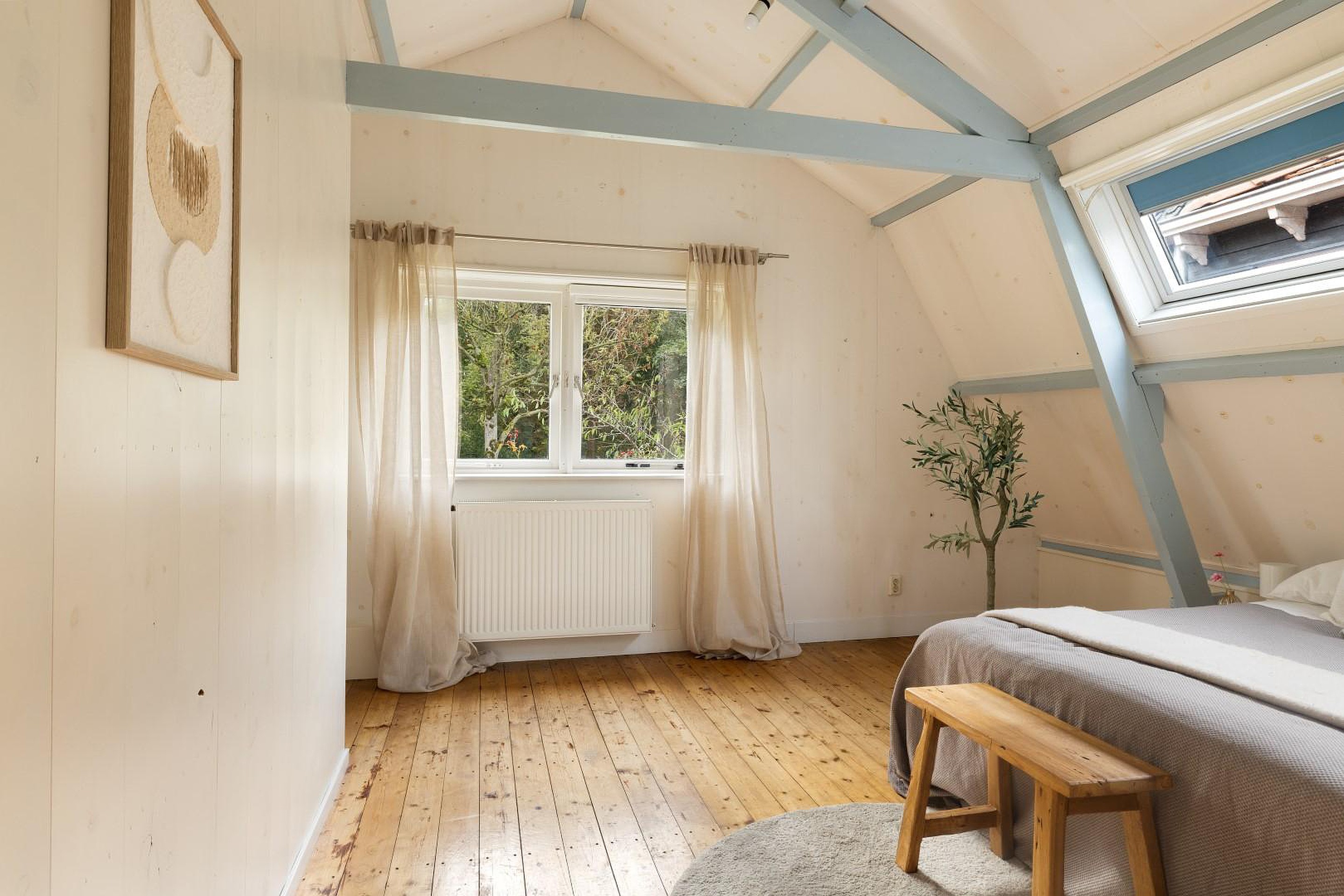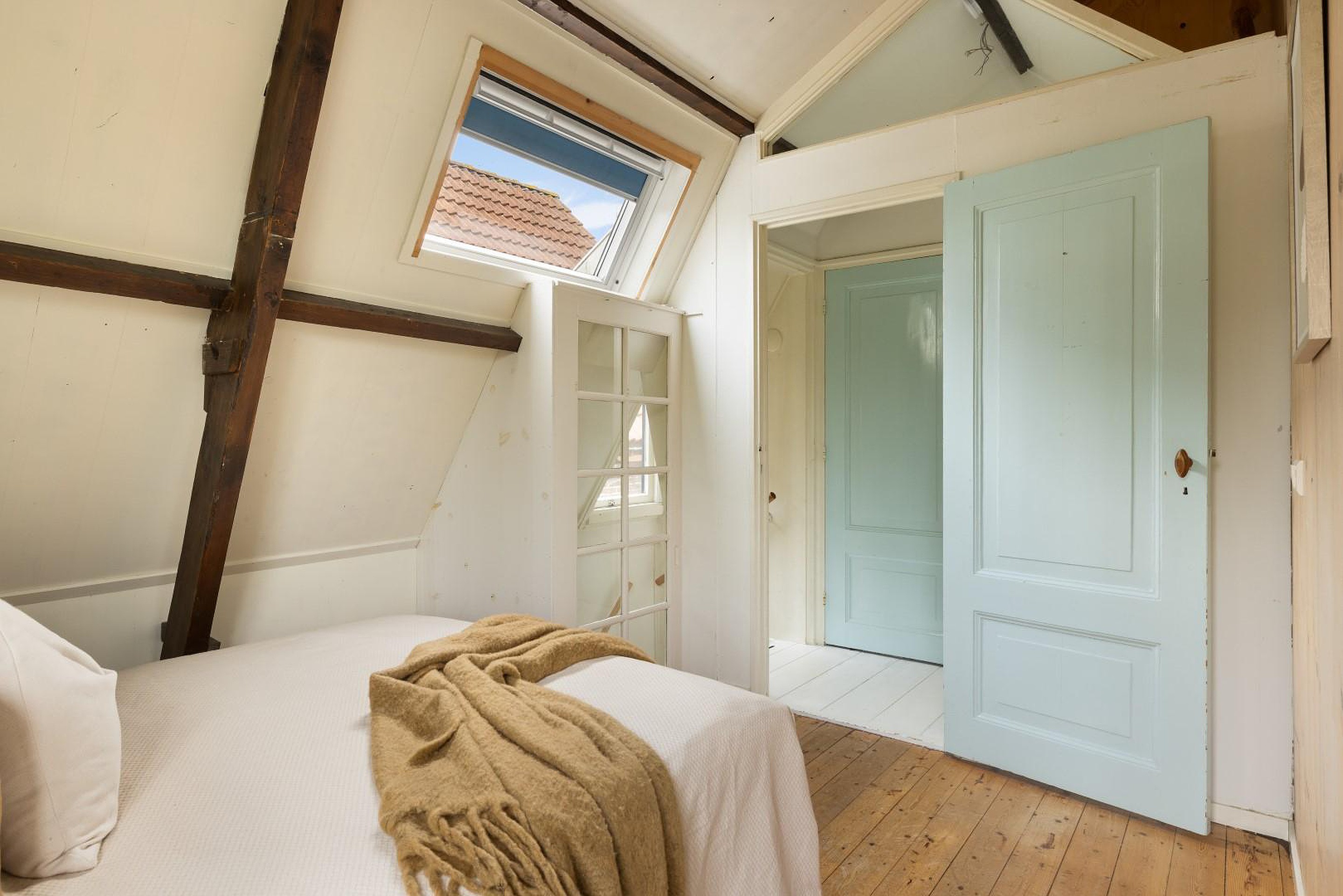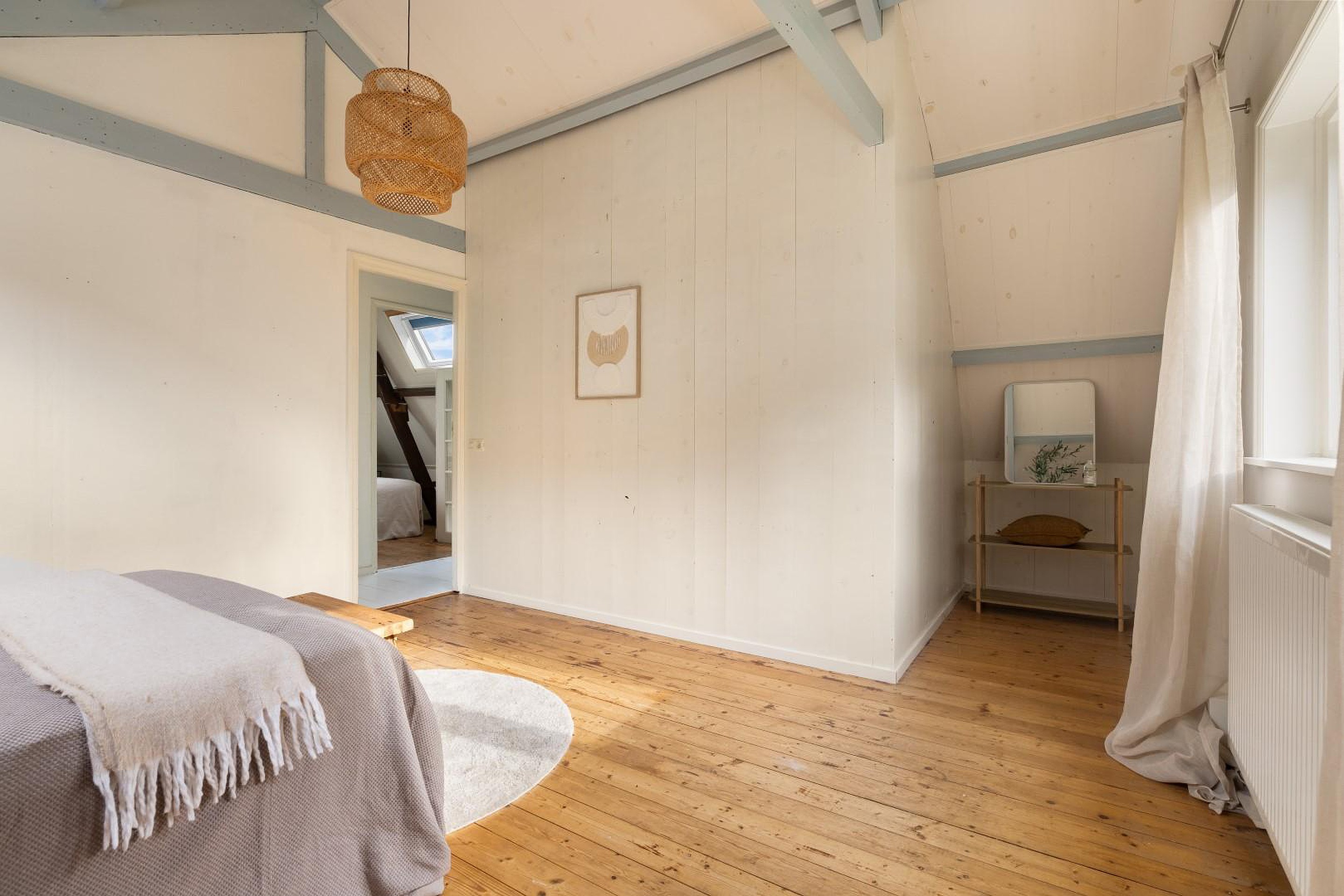 Via de trap bereikt u de overloop op de eerste verdieping. Hier bevinden zich nog drie ruime slaapkamers, elk met een speelse indeling en fraaie zichtbare balken tot in de nok (nokhoogte ca. 3.35 m).