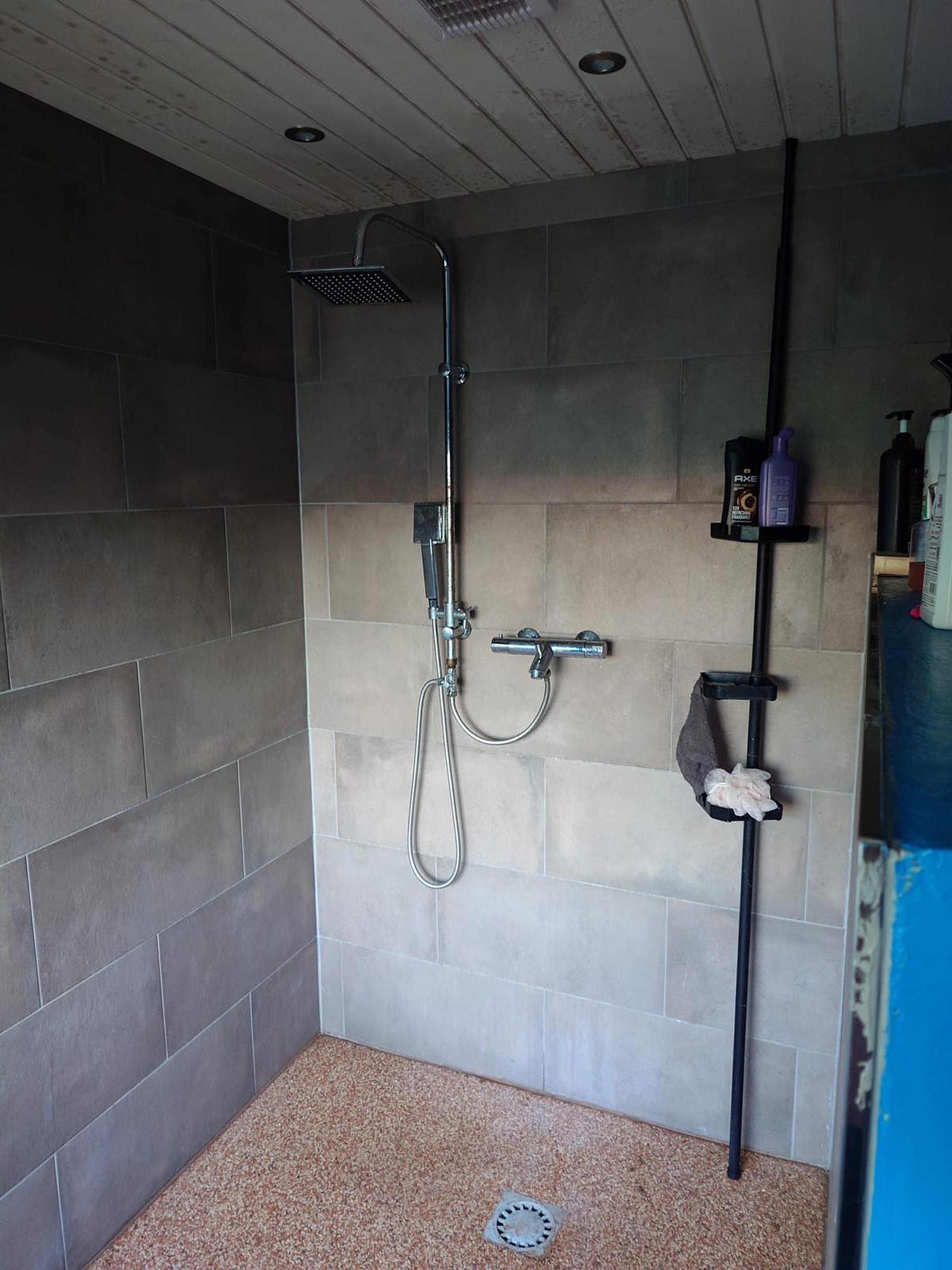 -Badkamer met toilet, wastafel en douche en royaal dakkapel, vloerverwarming, tegelwerk.