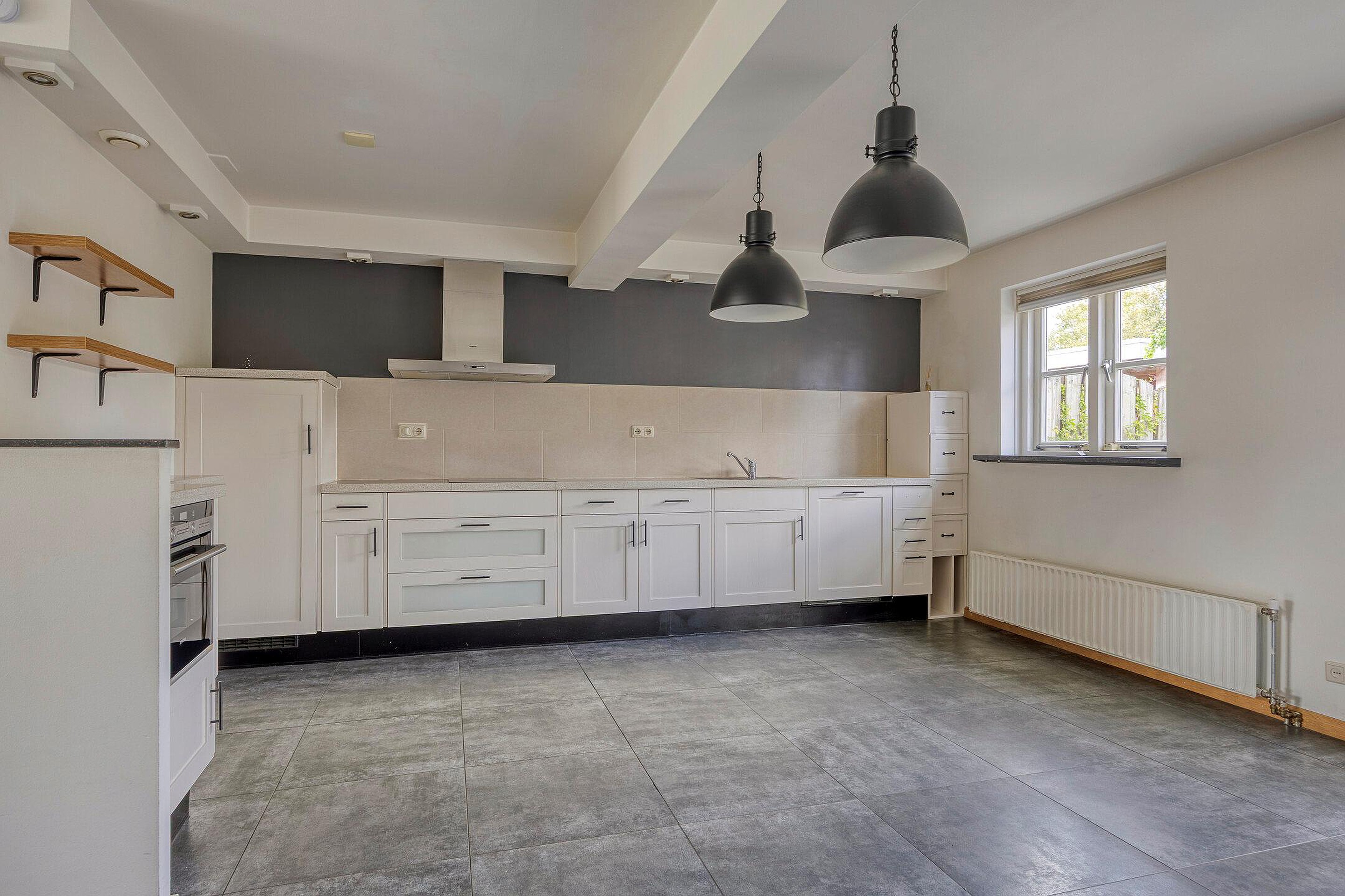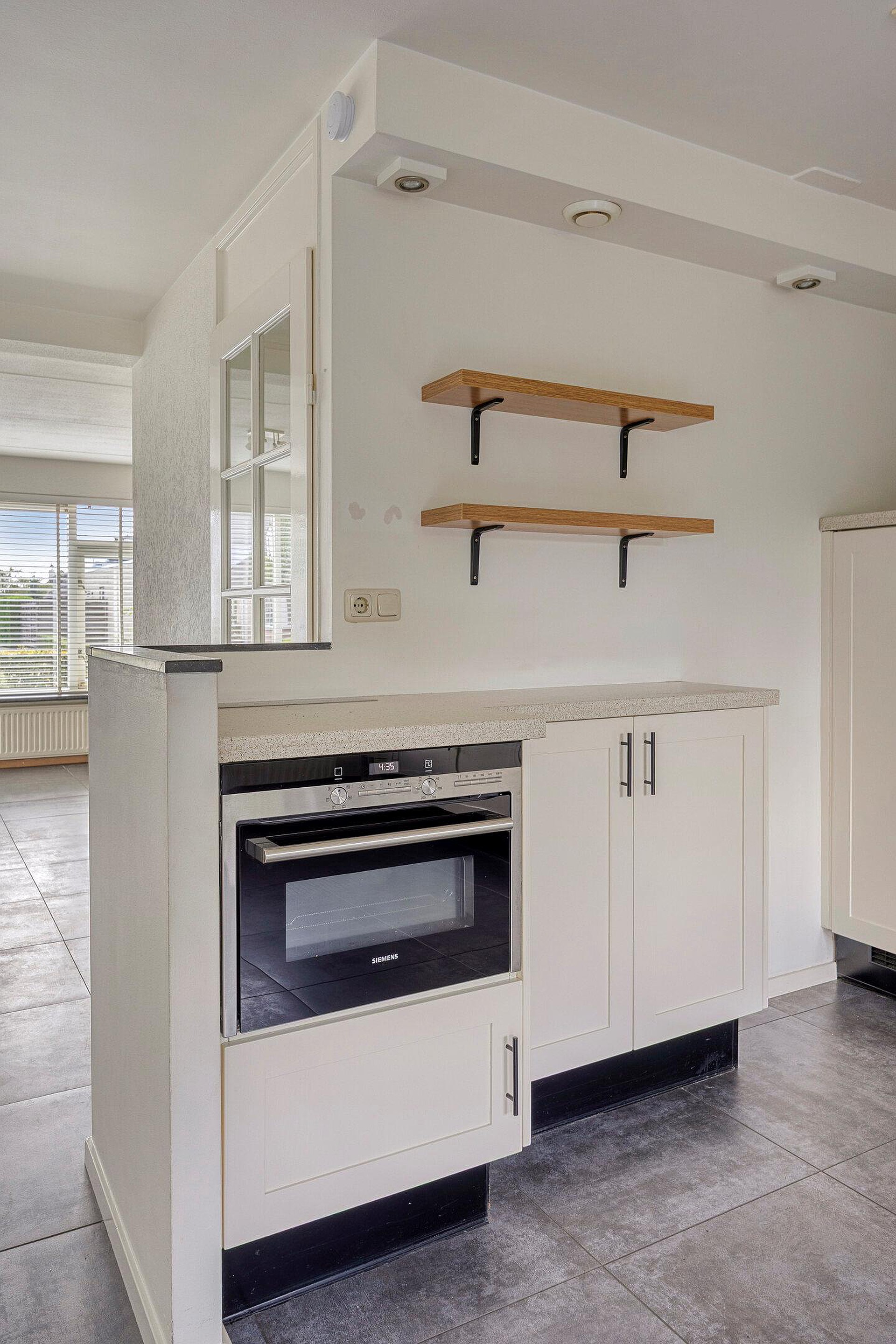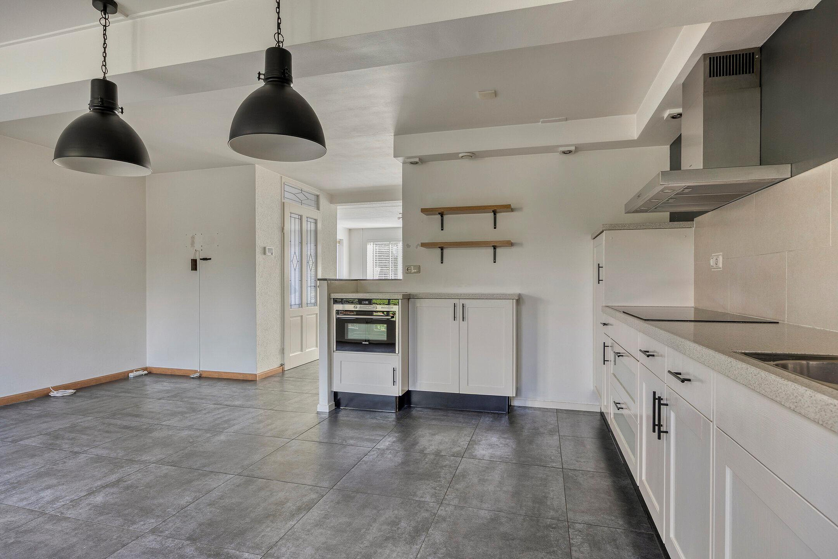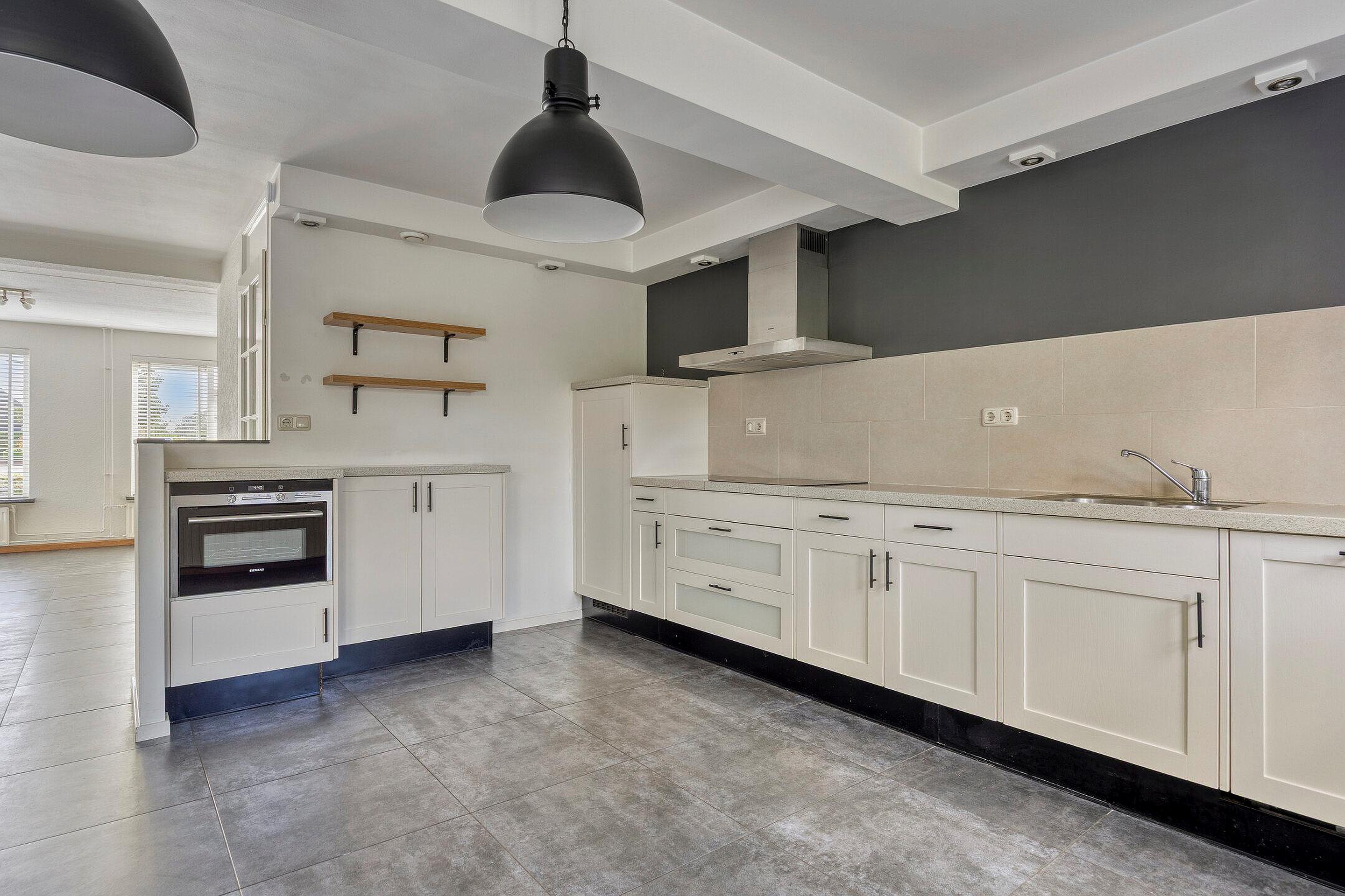 Aan de achterzijde van de woning treft u de open keuken, voorzien van een langwerpig aanrechtblad en diverse ingebouwde apparatuur, waaronder een inductiekookplaat, koelkast, ovencombinatie, vaatwasmachine en spoelbak. De keuken is goed onderhouden en is door de ruimte een grote woonkeuken. Via de openslaande deuren bereikt u de tuin, waardoor binnen en buiten naadloos met elkaar verbonden zijn.