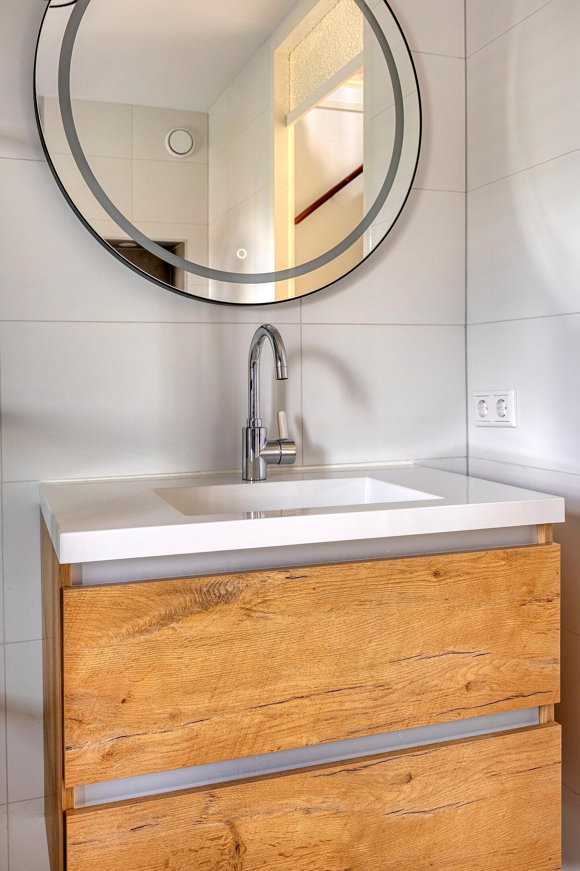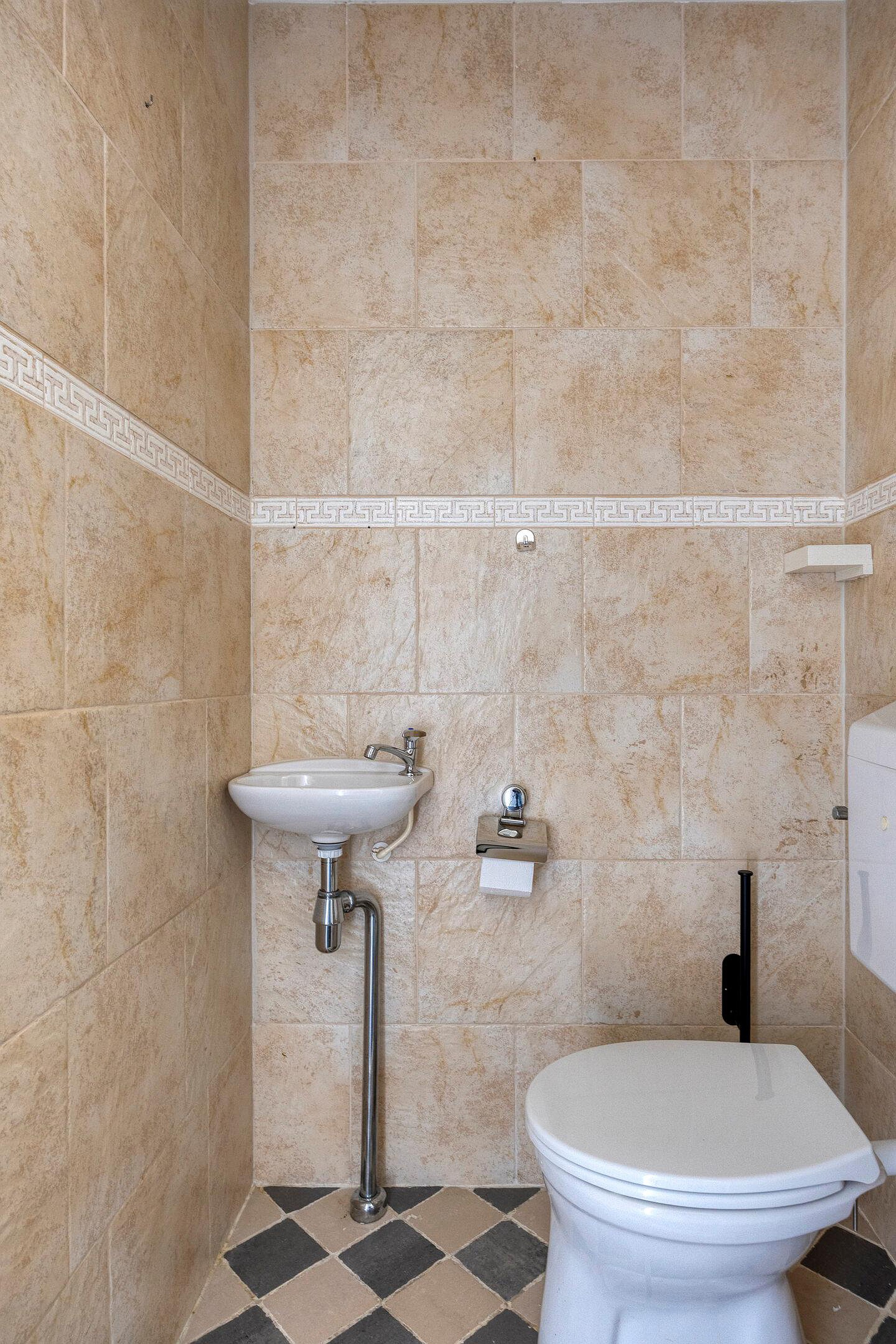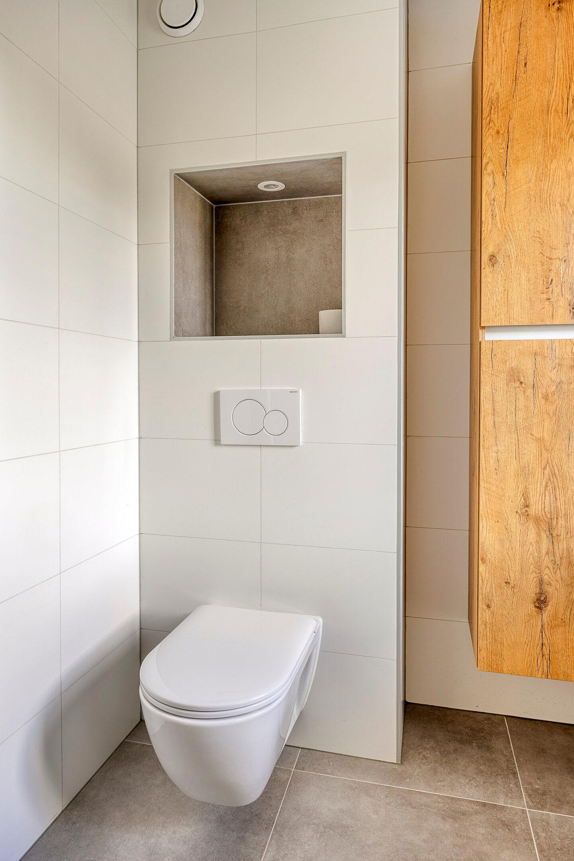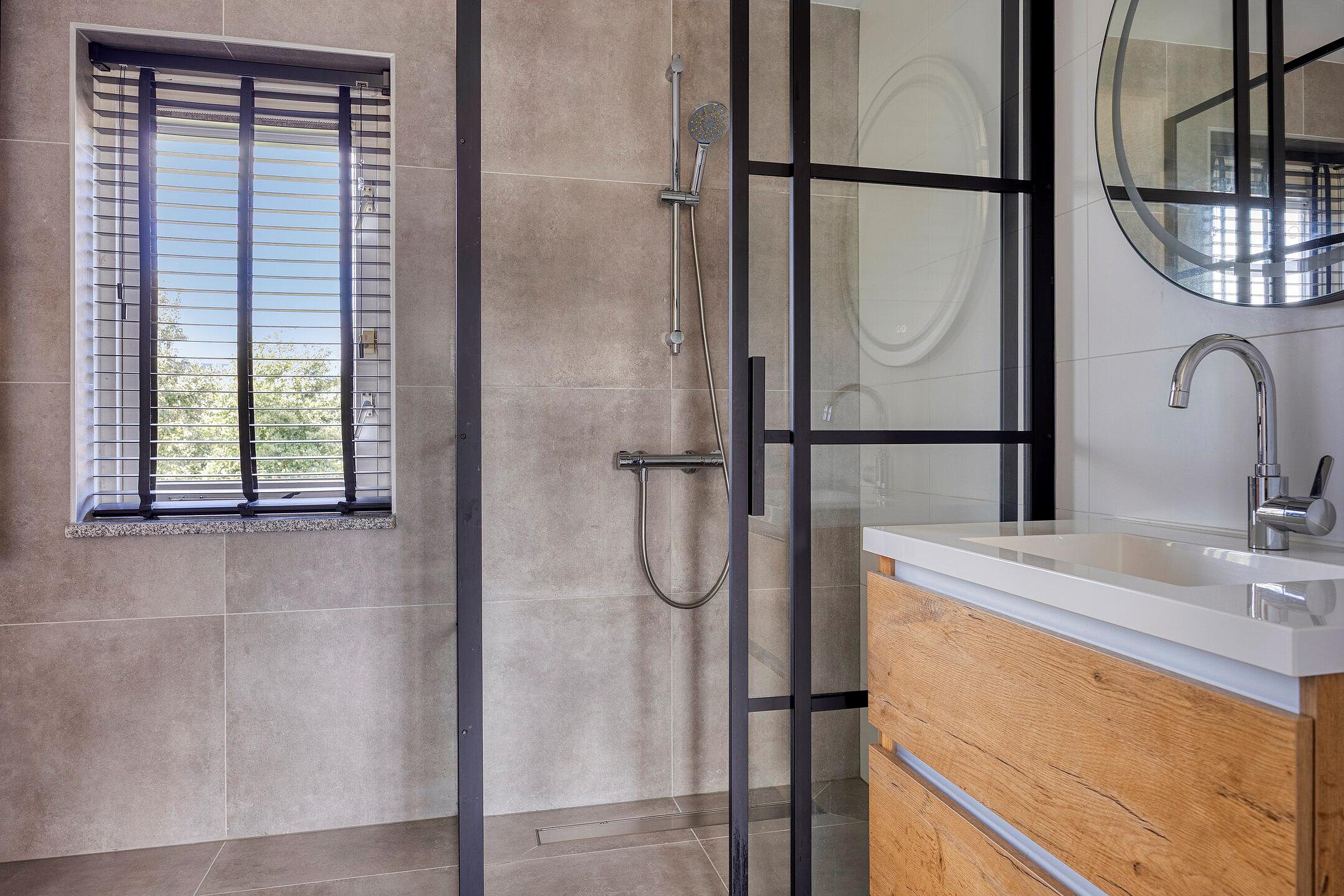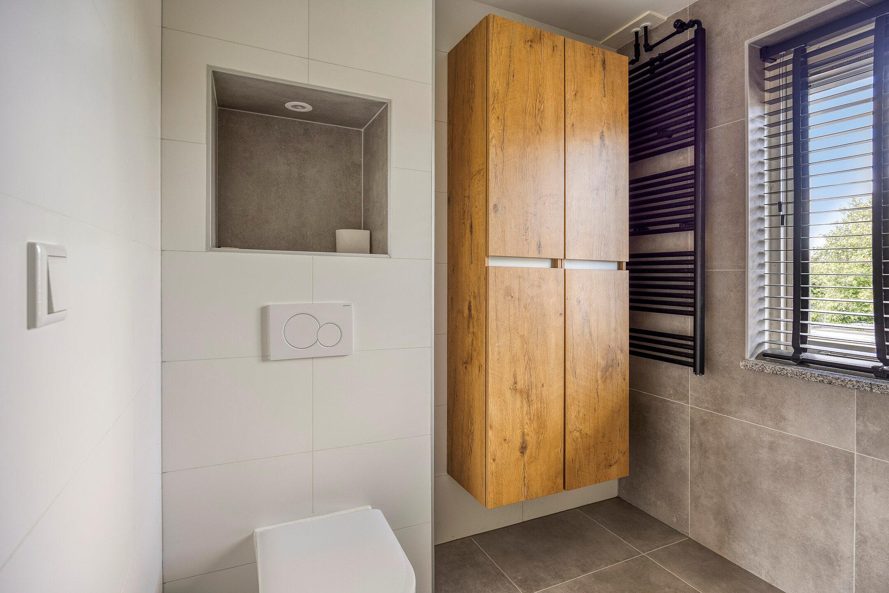 Grenzend aan de overloop bevindt zich de moderne badkamer. Deze is volledig betegeld en beschikt over een ruime douche met schuifdeur, een zwevend toilet, een handdoekradiator en een wastafel. De badkamer is goed onderhouden en biedt een prettige ruimte om de dag te beginnen of af te sluiten.