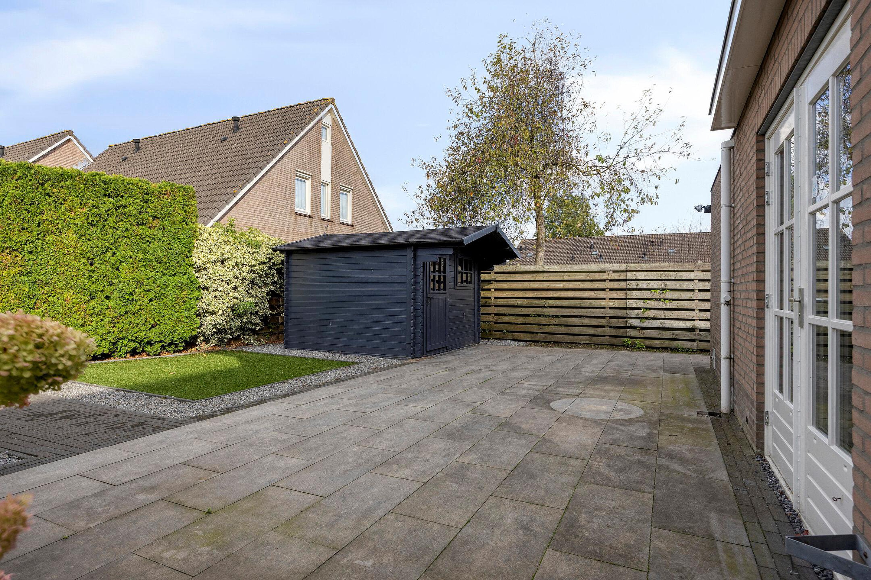 De zonnige tuin is grotendeels bestraat met enkele groene accenten en biedt volop ruimte voor een terras of loungehoek. Achterin de tuin bevindt zich een berging, ideaal voor tuinspullen. De tuin is een prettige plek om te ontspannen en van de zon te genieten.