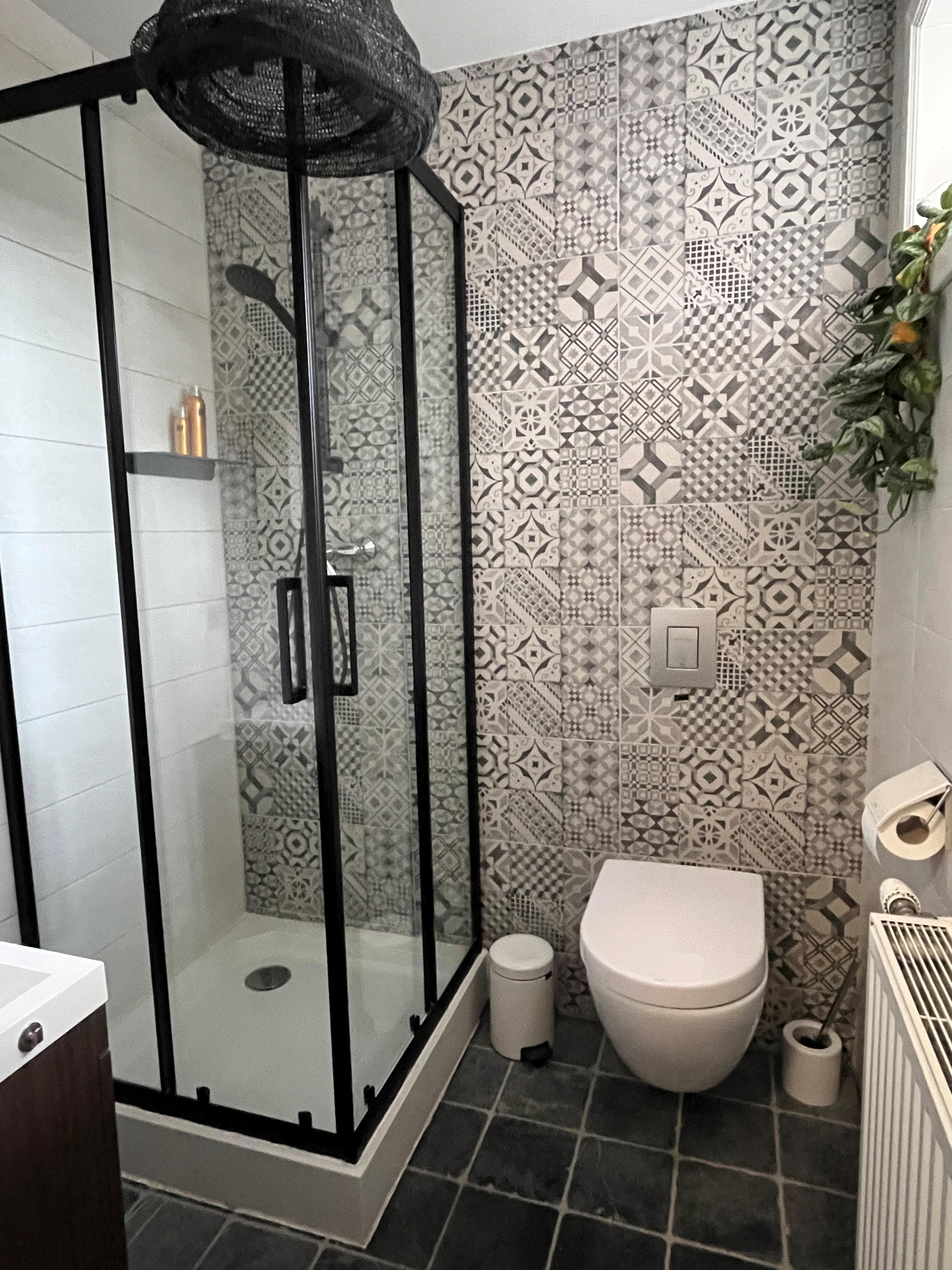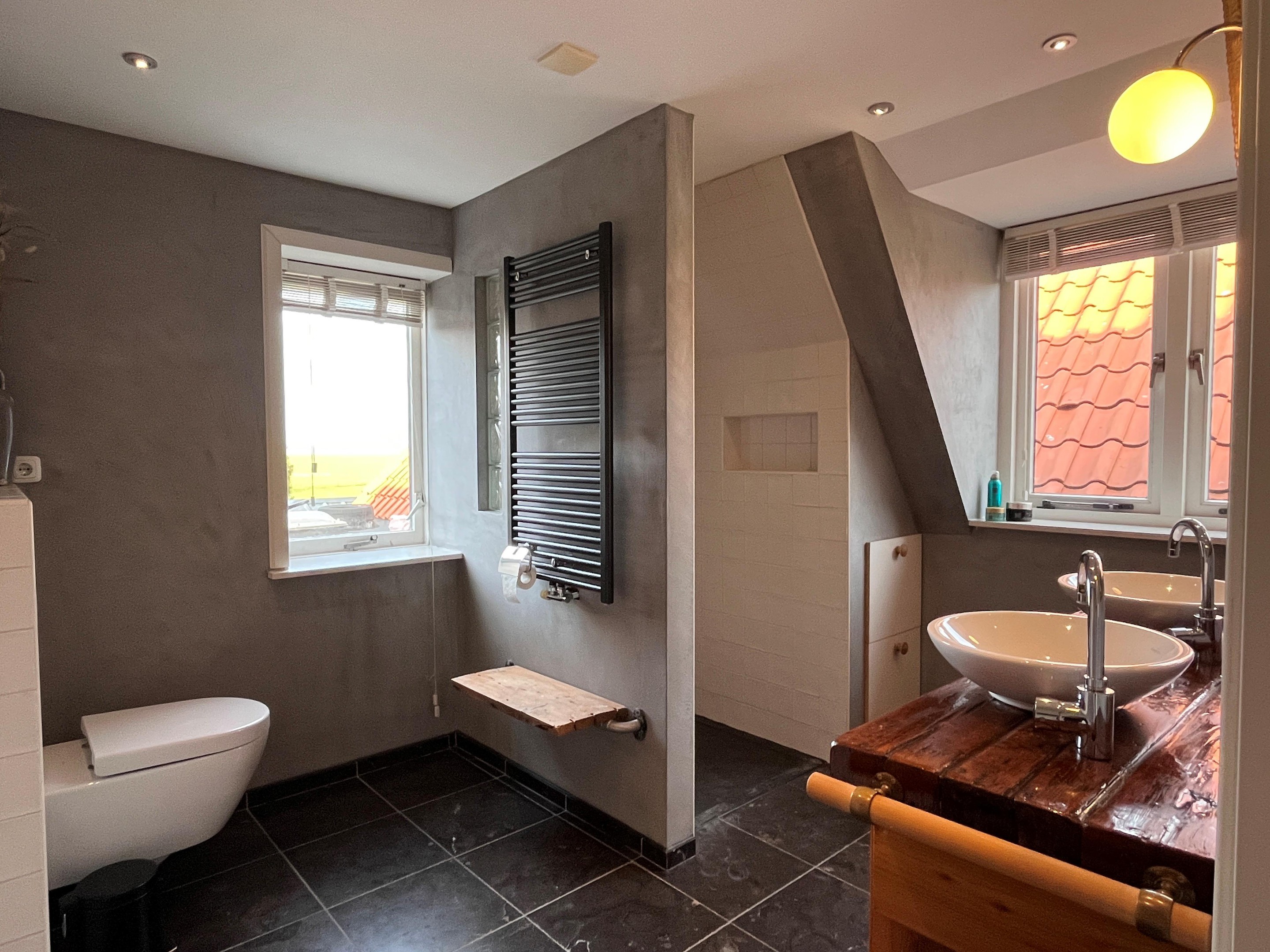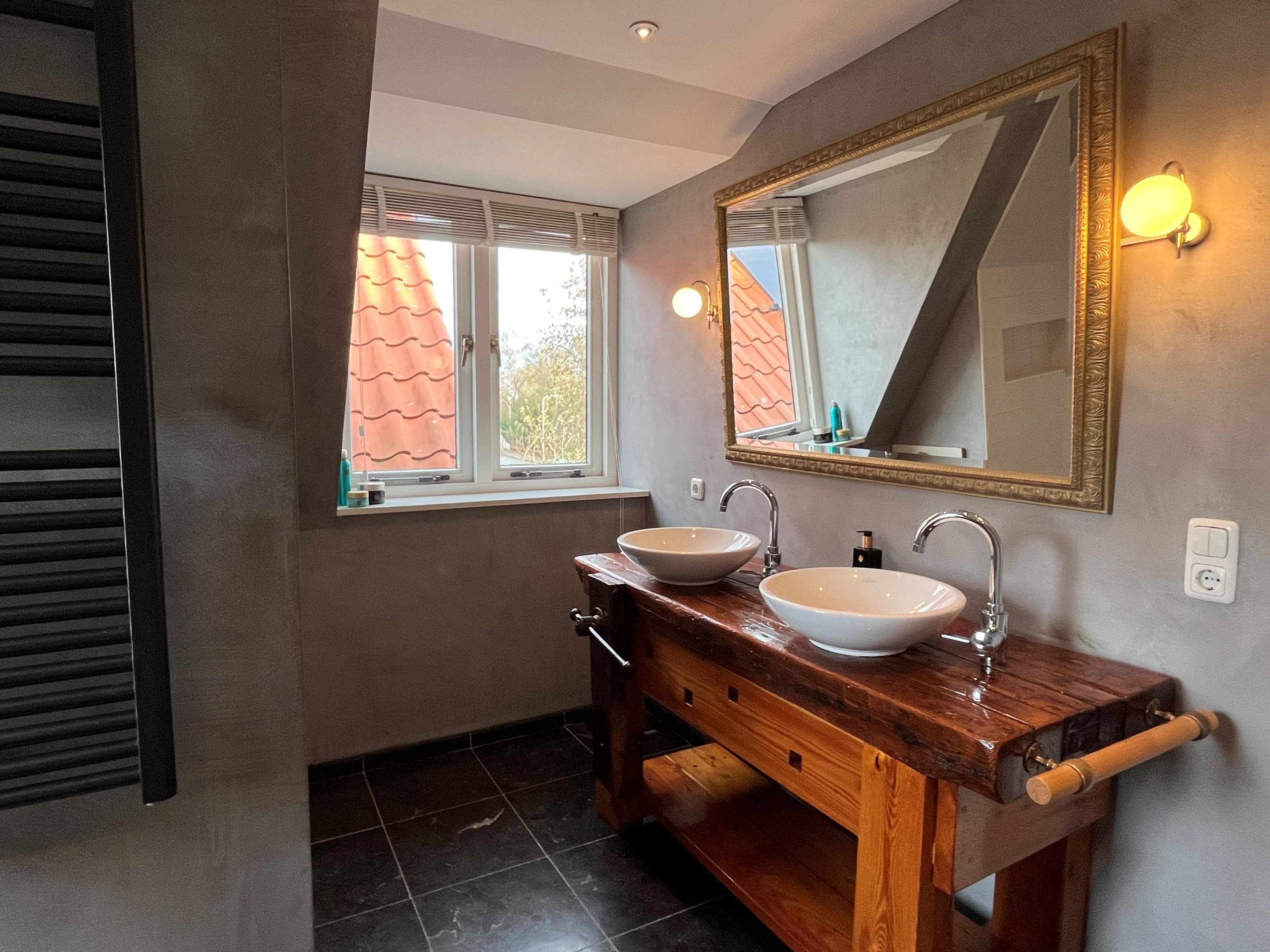 - Ruime badkamer met inloopdouche, dubbele wastafel en toilet;