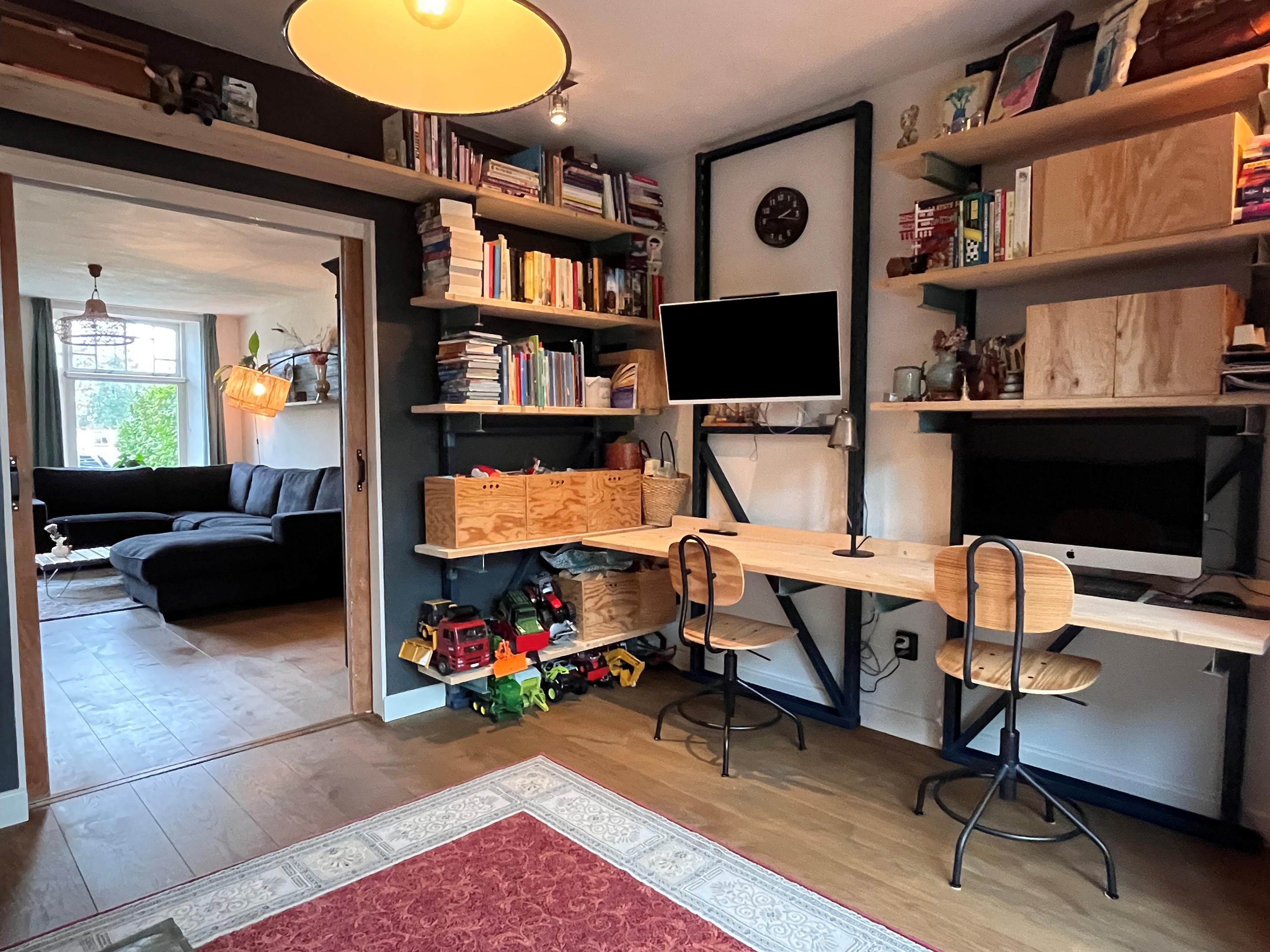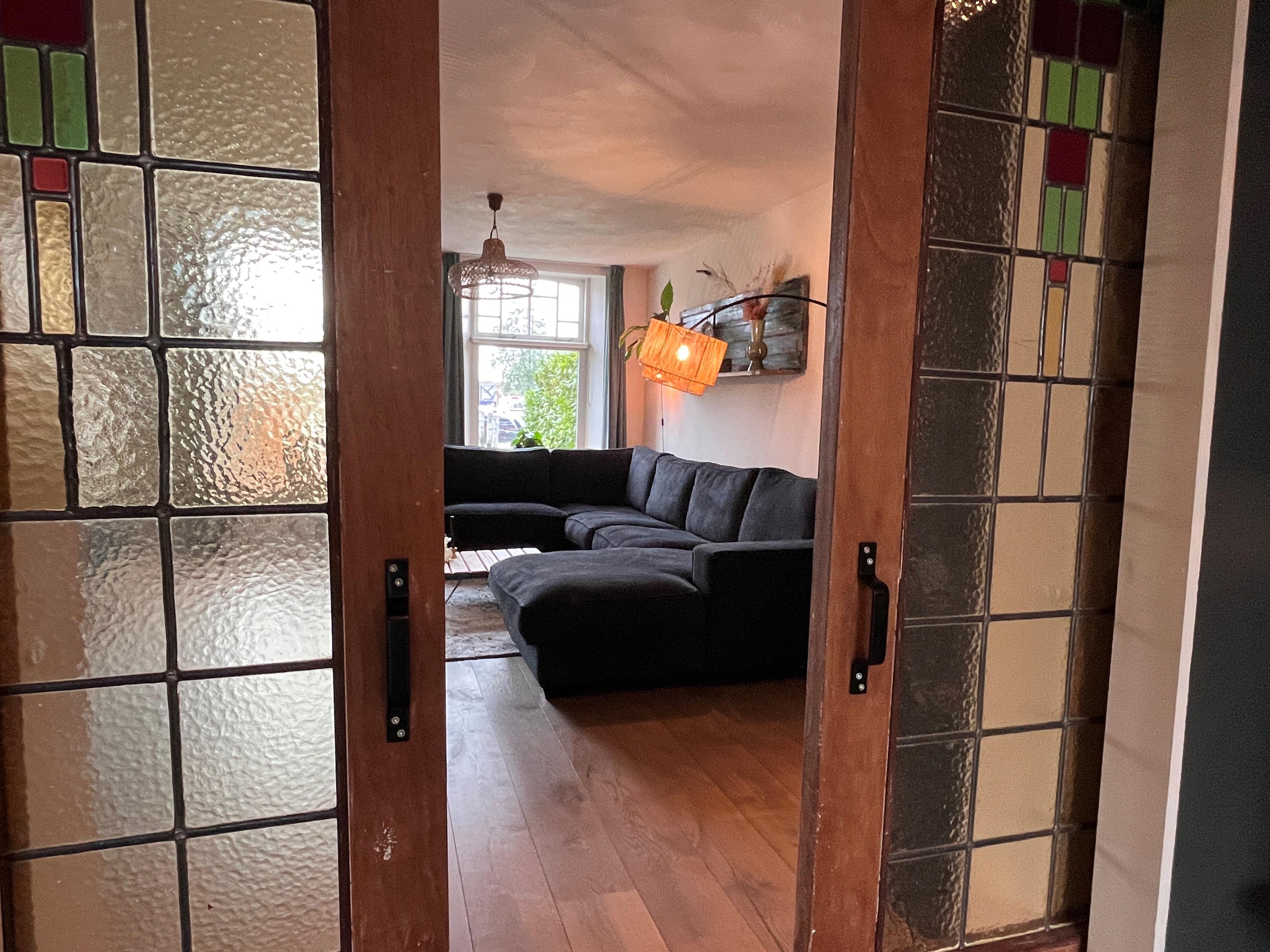 Aan de achterzijde van de woonkamer bevindt zich een extra kamer met karakteristieke en-suite deuren. Dit geeft het geheel extra sfeer en biedt een fijne overgang naar de tuin. Aan de voorzijde van de woonkamer bevindt zich de hal met de voordeur en de trapopgang naar de verdieping.