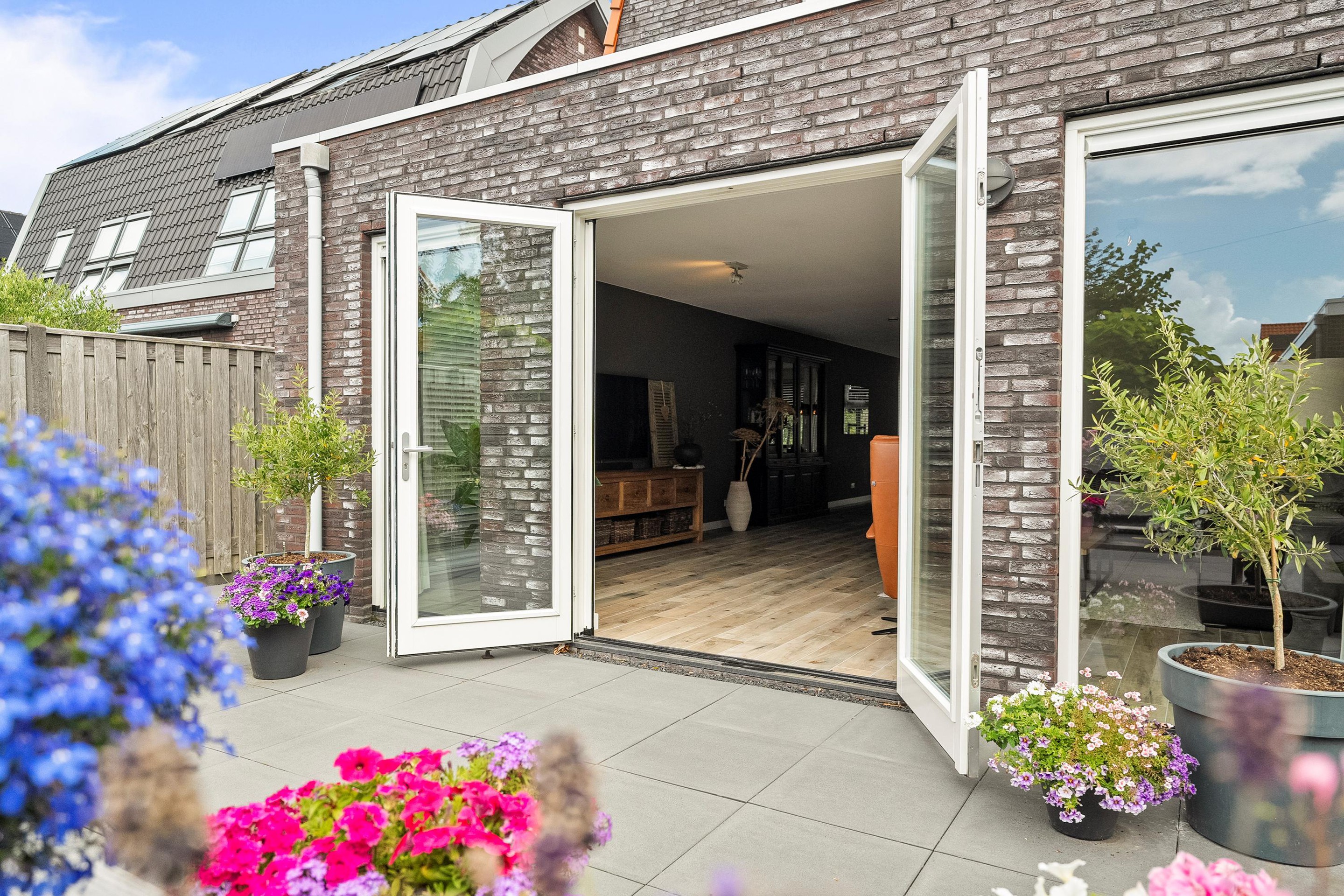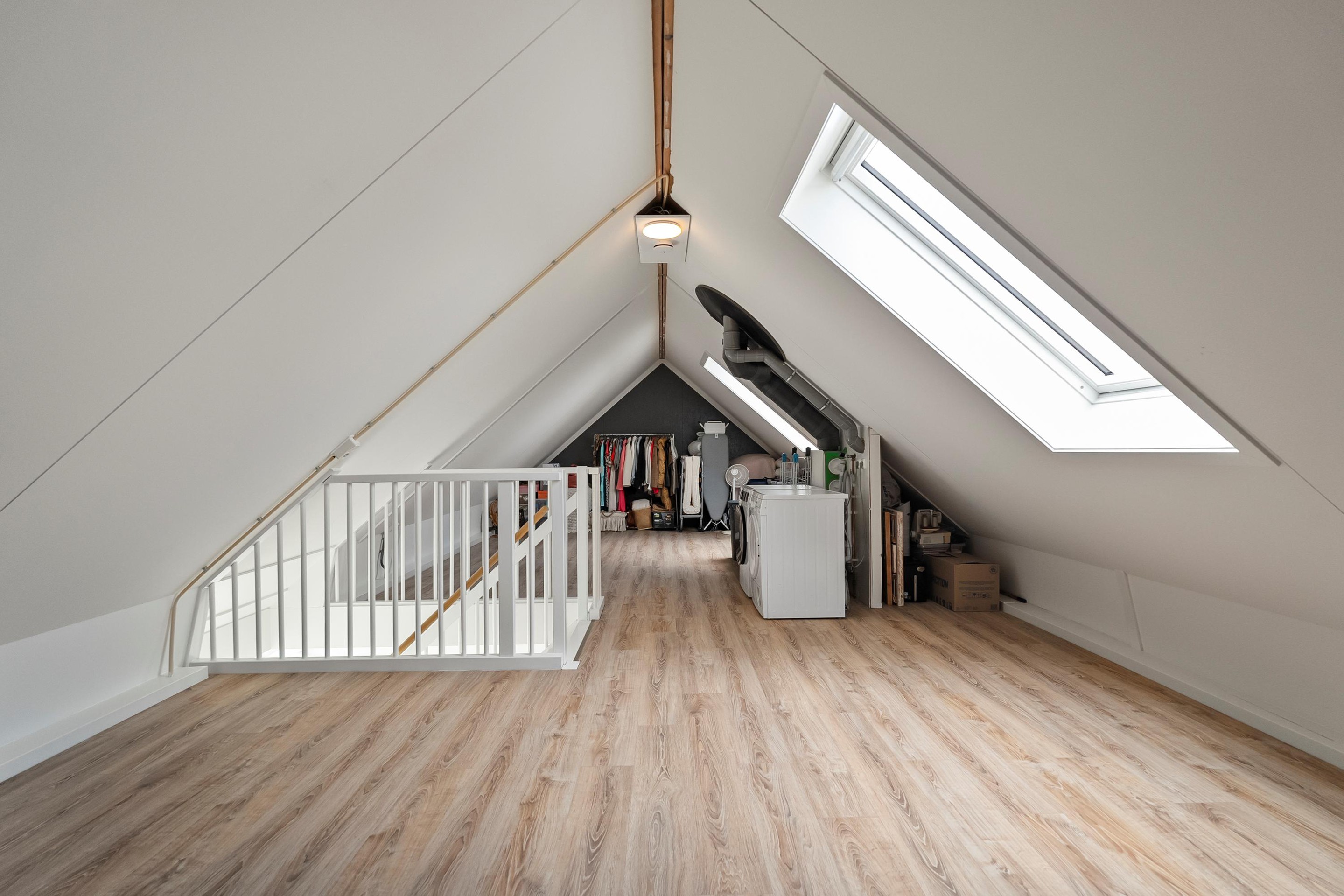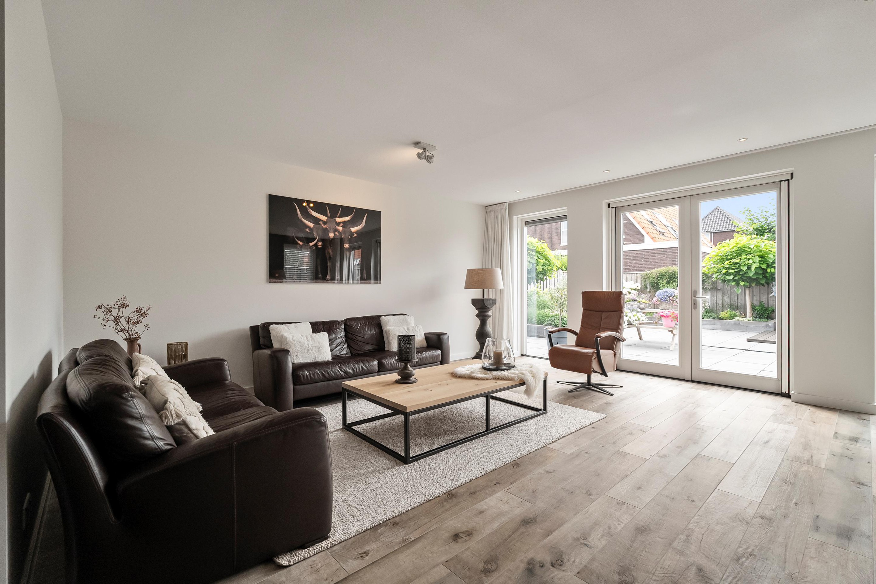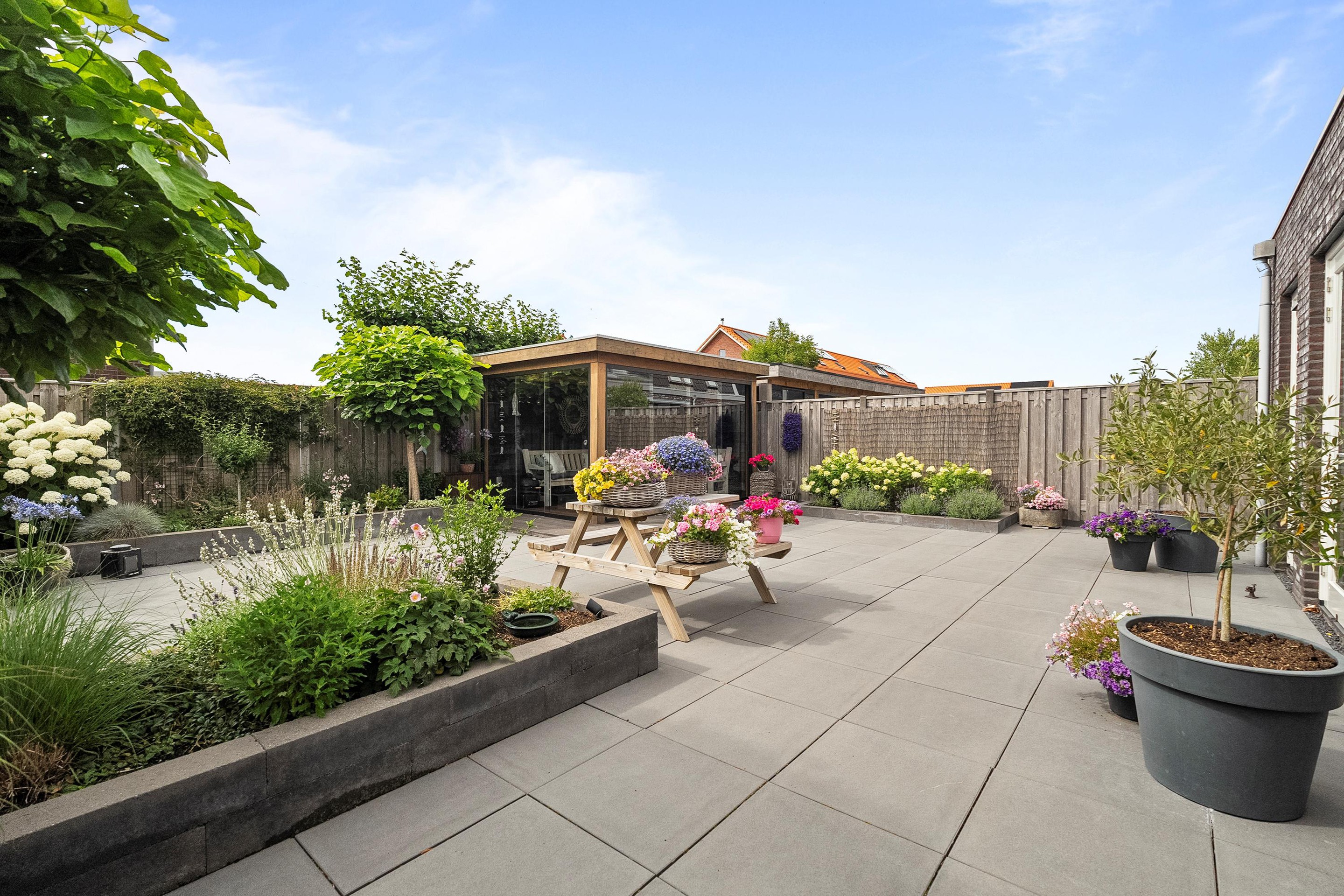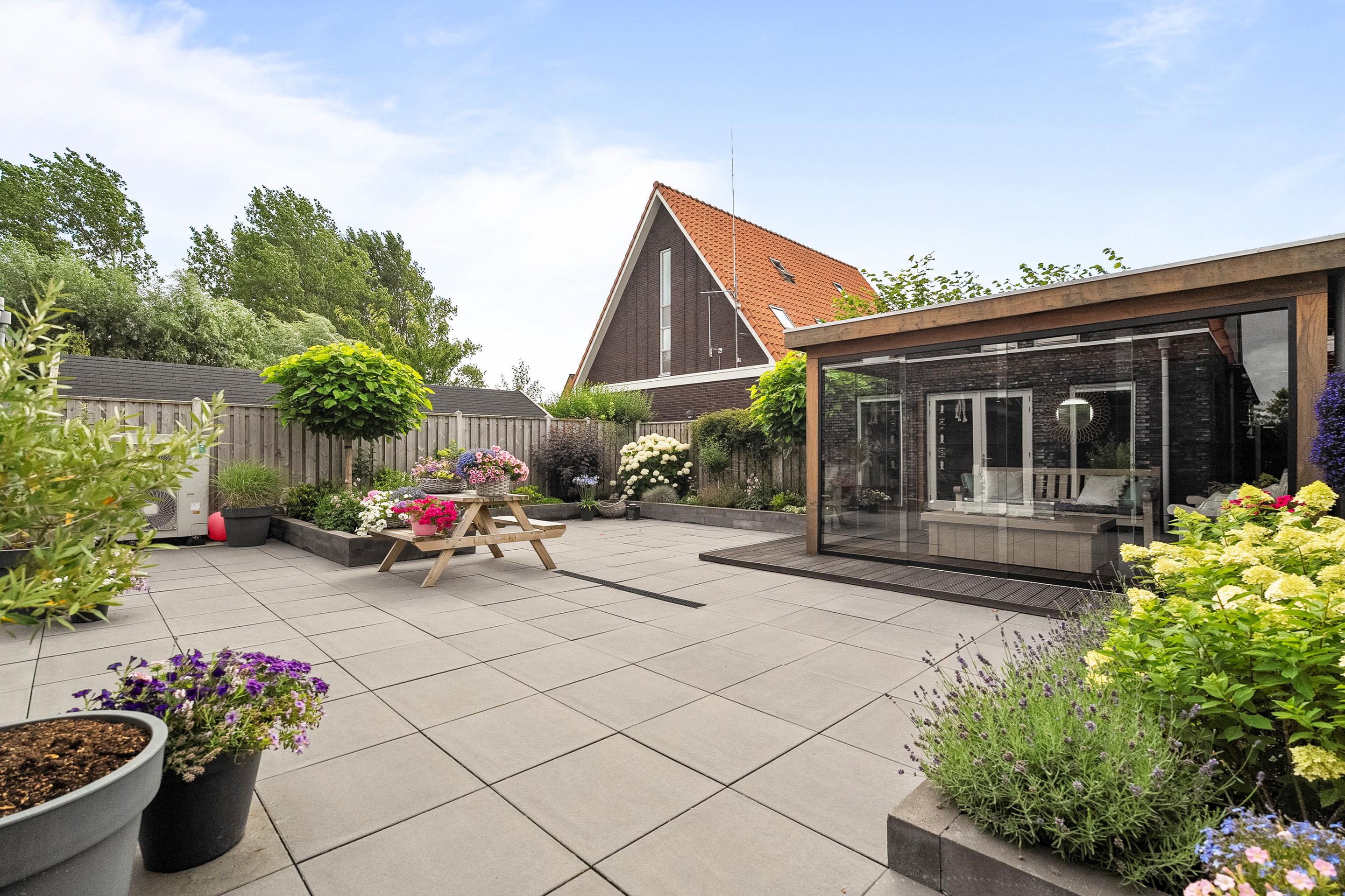 Voortuin, oprit, entree garage en entree woning. Je komt de woning binnen in een ruime hal voorzien van de meterkast, het toilet, trapopgang naar de verdieping, inpandige toegang naar de garage en toegang tot de woonkamer. Een riante woonkamer, zeker gezien de flinke aanbouw met dubbel openslaande tuindeuren die tijdens de nieuwbouw direct is aangebracht. Hiermee komt het totale woonoppervlak op de begane grond tot wel bijna 85m2! De woonkamer is zogezegd tuingericht en aan de voorzijde van de woning vind je de luxe, open inbouwkeuken voorzien van al het gewenste inbouwapparatuur geplaats in een apparatenwand en het fraaie kookeiland, verlengd met een bar waar het heerlijk (na)zitten is. Terug in de hal brengt een brede trapopgang je naar de overloop op de eerste verdieping. Grote raampartijen zorgen voor een fijn lichtinval. De eerste verdieping biedt 3 ruime slaapkamers met aan de master-bedroom een fraaie inloopkast. De daglichtvolle, ruime badkamer is voorzien van een glazen douchecabine en dubbel wastafelmeubel. Het tweede toilet is te vinden op de overloop, separaat van de badkamer. Ideaal! Vanaf diezelfde overloop is er een vaste trap naar de tweede verdieping waar de voorbereidingen voor (mogelijk 2) extra slaapkamers al zijn getroffen door het plaatsen van 2 grote dakramen en het aanbrengen van een laminaatvloer. Heb je de extra kamers niet nodig dan biedt de ruimte tal van andere ontspannings-, thuiswerk-, of bergingsmogelijkheden! Achter de woning ligt een grote, uitstekend gelegen achtertuin. Keurig en onderhoudsvriendelijk aangelegd met sierbestrating, goed schuttingwerk en fraaie borders met diverse beplanting. De achtertuin is gelegen op het Westen en biedt vrijwel de gehele dag ruimte voor de zon. Naast de fraaie aanleg is er een evenzo mooie tuinkamer gerealiseerd. Een volledig met glazen panelen afsluitbare veranda waar het geweldig toeven is op de mooie dagen!