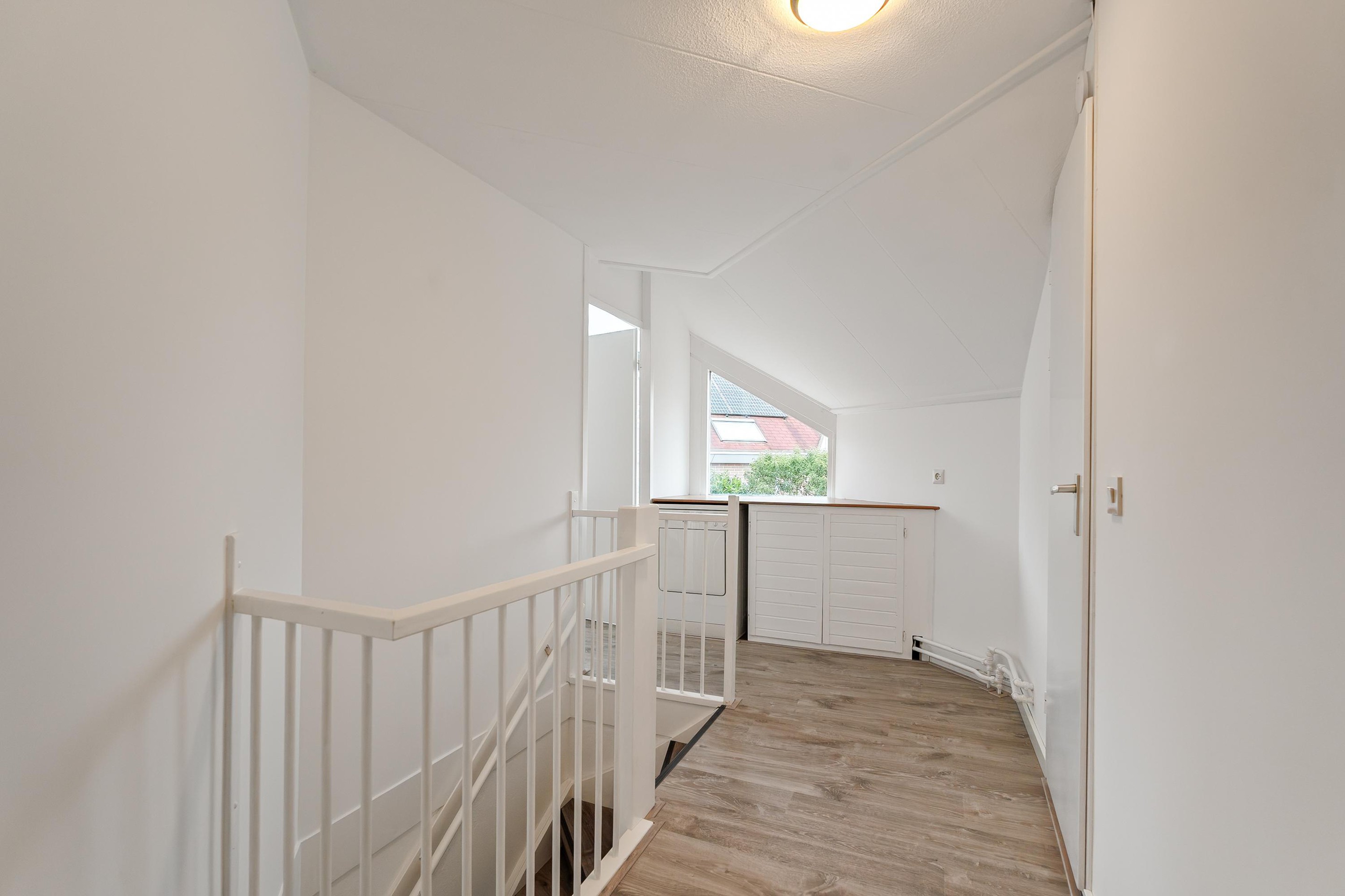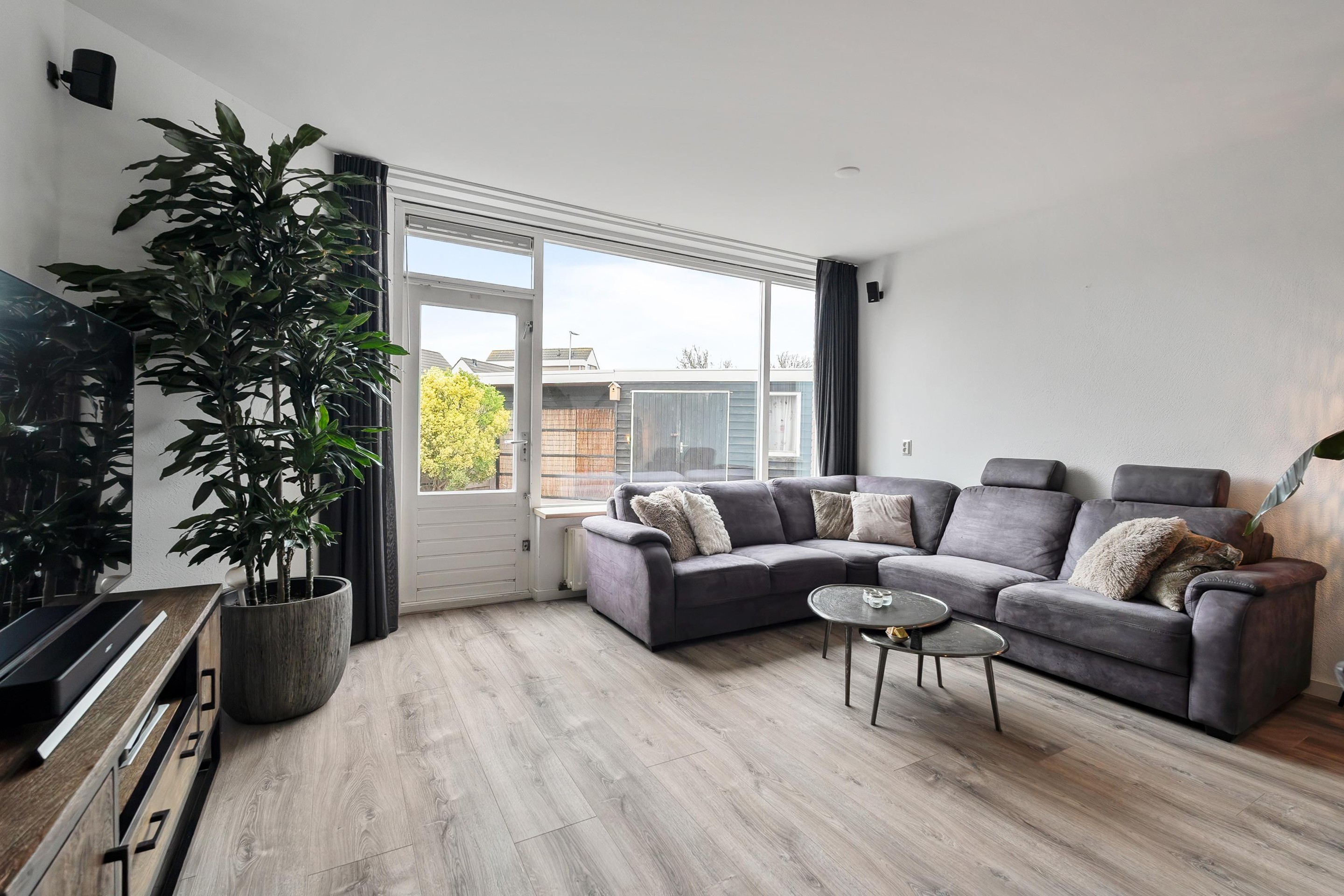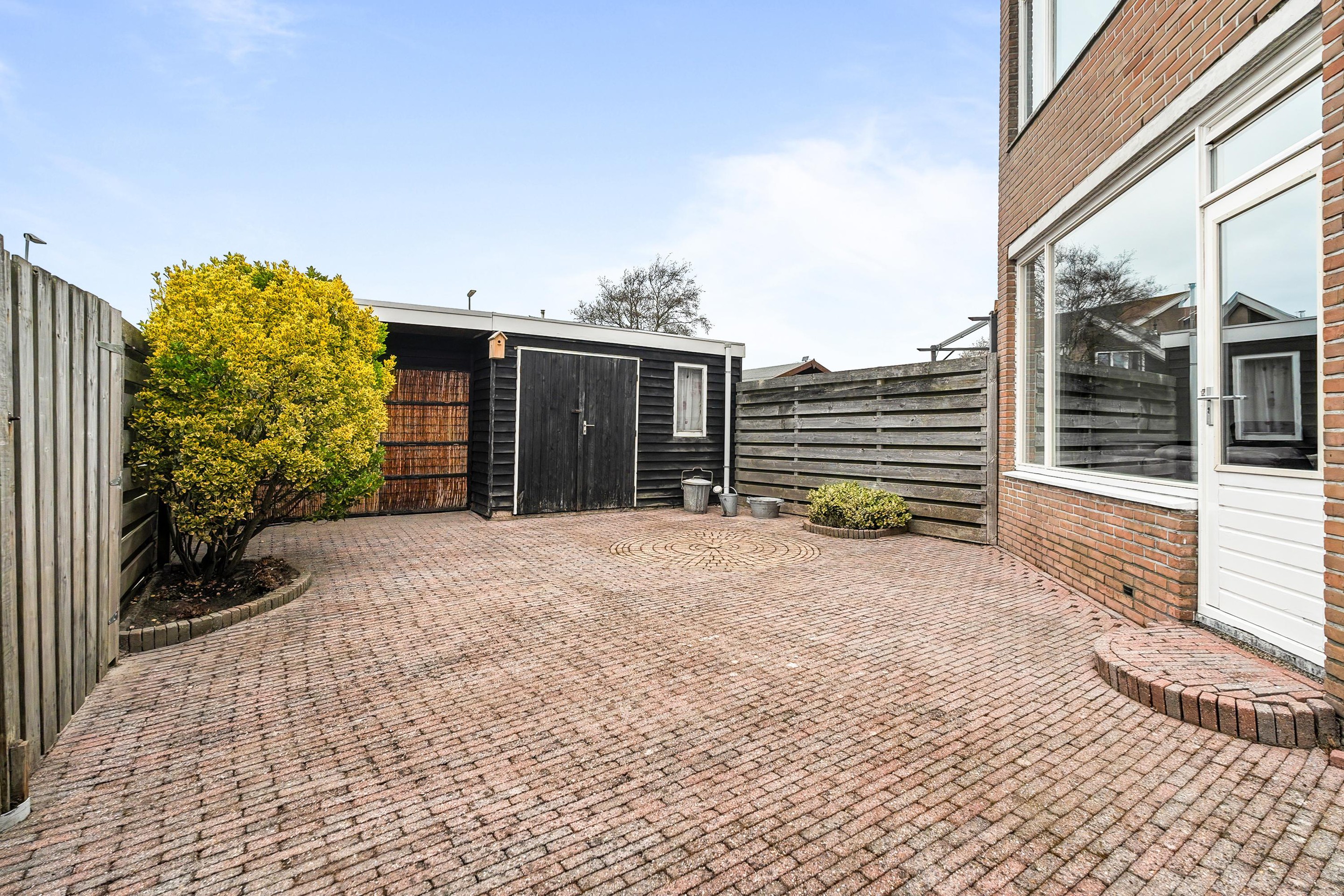Frontberging en entree woning. Je komt de woning binnen in de hal met meterkast, vaste kast met witgoedaansluitingen, het toilet en de trapopgang naar de verdieping. Vanuit de hal kom je in de ruime, tuingerichte woonkamer voorzien van een laminaatvloer en strak afgewerkte wanden en plafond. Aan de voorzijde op de begane grond vind je een keurige, open inbouwkeuken met divers inbouwapparatuur als een gaskookplaat, combi-oven en vaatwasser onder een fraai stenen werkblad. De eerste verdieping biedt je 3 fijne slaapkamers, allen voorzien van een doorlopende laminaatvloer en ook hier weer de strakke, lichte afwerking van de wanden en plafonds. De badkamer is ruim, fris, volledig betegeld en ingericht met een wastafel, douche én ligbad. Rondom de woning ligt een ruim bemeten tuin met een ideale ligging, zowel Zuid als West georiënteerd. De tuin is onderhoudsvriendelijk aangelegd met sierbestrating, enkele borders voor beplanting, degelijk schuttingwerk en bergingen waarvan één met dubbel openslaande deuren. In combinatie met de brede achterom ideaal voor bijvoorbeeld de motorrijder of klusser die ruimte zoekt.