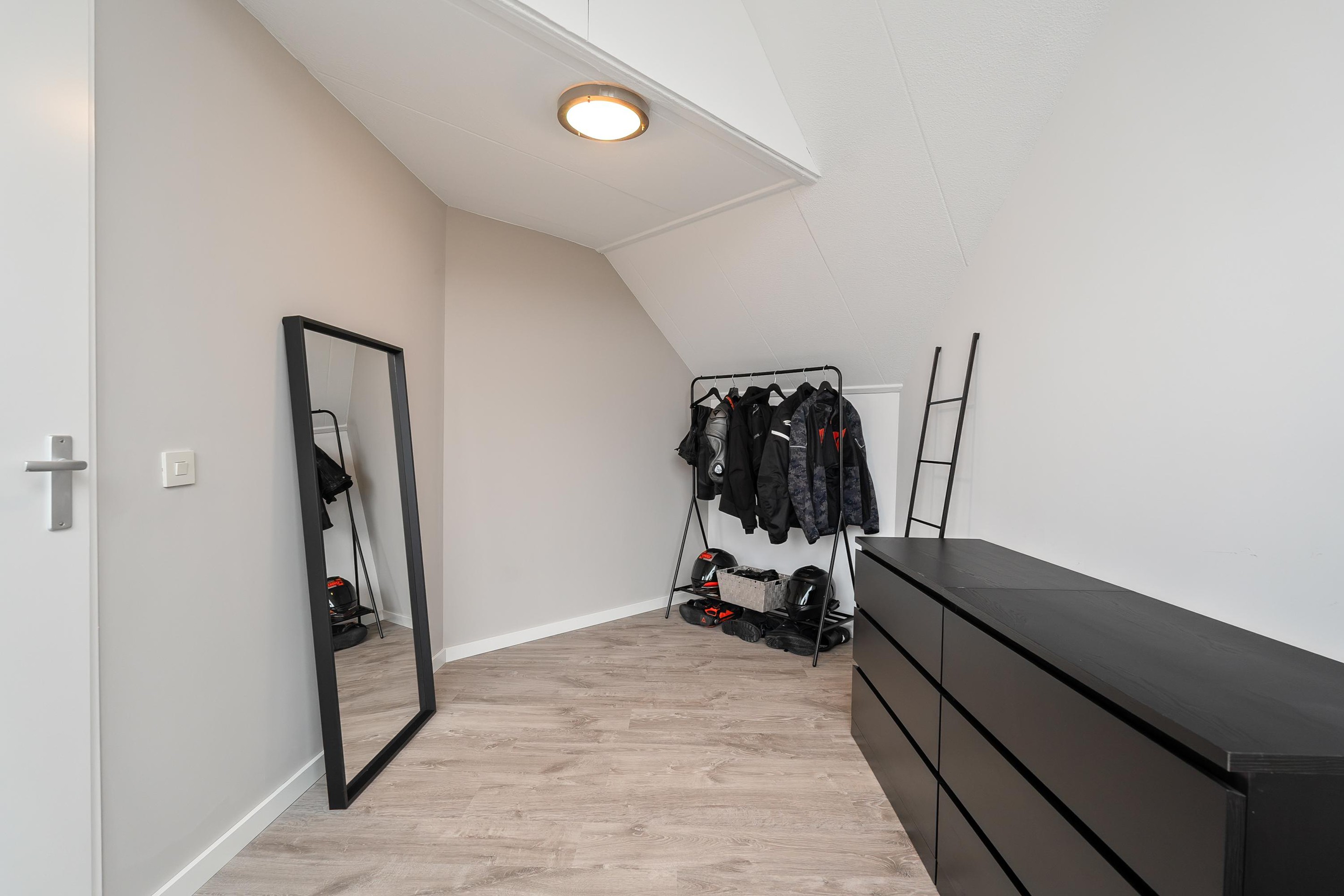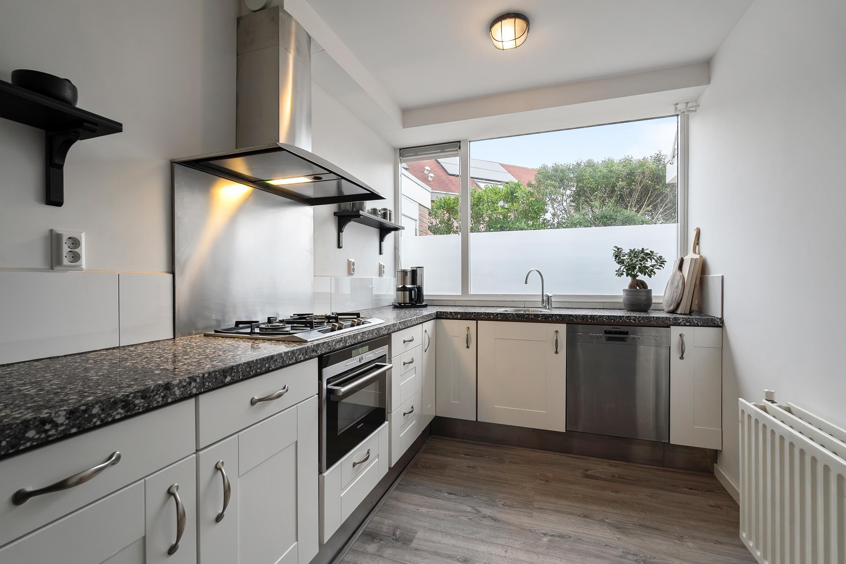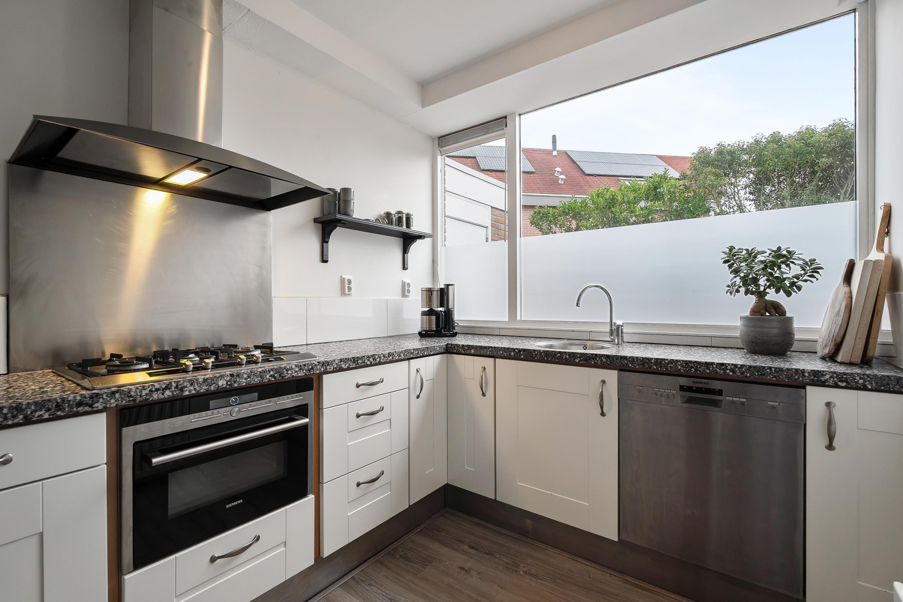 Frontberging en entree woning. Je komt de woning binnen in de hal met meterkast, vaste kast met witgoedaansluitingen, het toilet en de trapopgang naar de verdieping. Vanuit de hal kom je in de ruime, tuingerichte woonkamer voorzien van een laminaatvloer en strak afgewerkte wanden en plafond. Aan de voorzijde op de begane grond vind je een keurige, open inbouwkeuken met divers inbouwapparatuur als een gaskookplaat, combi-oven en vaatwasser onder een fraai stenen werkblad. De eerste verdieping biedt je 3 fijne slaapkamers, allen voorzien van een doorlopende laminaatvloer en ook hier weer de strakke, lichte afwerking van de wanden en plafonds. De badkamer is ruim, fris, volledig betegeld en ingericht met een wastafel, douche én ligbad. Rondom de woning ligt een ruim bemeten tuin met een ideale ligging, zowel Zuid als West georiënteerd. De tuin is onderhoudsvriendelijk aangelegd met sierbestrating, enkele borders voor beplanting, degelijk schuttingwerk en bergingen waarvan één met dubbel openslaande deuren. In combinatie met de brede achterom ideaal voor bijvoorbeeld de motorrijder of klusser die ruimte zoekt.