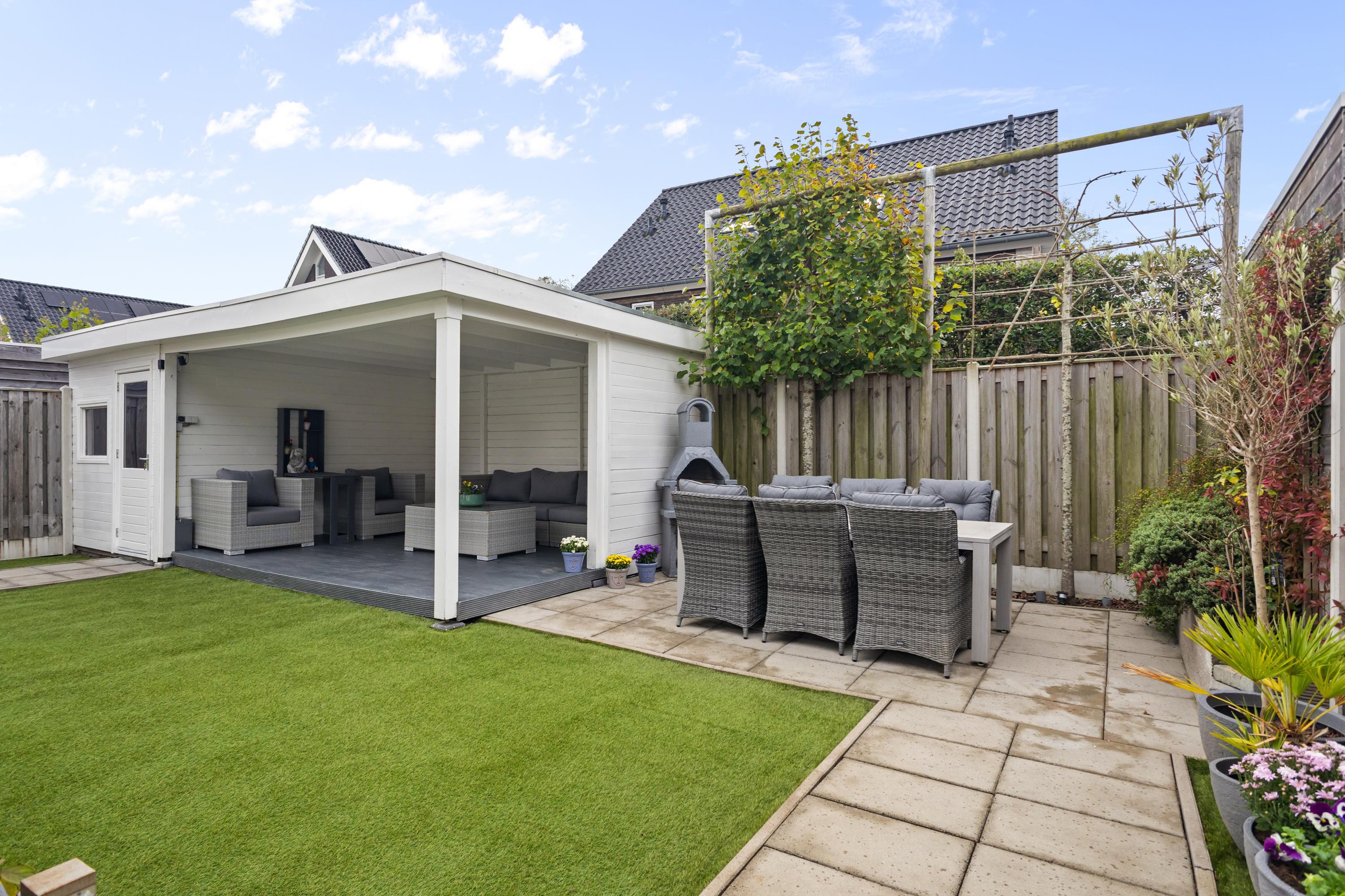 Parkeren op eigen oprit voor tenminste 2 auto's. Achterom naar de achtertuin en entree woning. Entree in de hal met meterkast, het toilet en de trapopgang naar de verdieping. Vanuit de hal kom je in de verrassend ruime, aan de zij- en achterzijde uitgebouwde living. Aan de voorzijde van de begane grond is de keuken gesitueerd. Ruim van opzet in 2x een rechte opstelling voorzien van al het gewenste inbouwapparatuur, veel werkruimte en kastruimte door een apparaten- kastenwand. De woonkamer is tuingericht en biedt een heerlijk lichtinval door raampartijen tot aan de grond. De zij-aanbouw biedt vele mogelijkheden en is momenteel in gebruik als separate eetkamer wat een gevoel van grandeur geeft. Andere opties als thuiswerken, een TV- of speelkamer behoren natuurlijk ook tot de mogelijkheden. Op de eerste verdieping bereik je vanaf de overloop 3 prima slaapkamers, allen voorzien van (kunststof) kozijnen met draai/kiepramen. De geheel betegelde badkamer is van alle gemakken voorzien en meer dan volledig ingericht. Zo biedt het een glazen douchecabine met Grohe Smart inbouw regendoucheset, groot (190x90) ligbad met whirlpool, een wastafelmeubel en tweede toilet. Vanaf de overloop leidt een vaste trap je naar de tweede verdieping. Door het plaatsten van 2 (kunststof) dakkapellen zijn hier 2 ruime slaapkamers gerealiseerd die het totaal aan slaapkamers op 5 brengen. Het dakkapel aan de achterzijde is extra breed en loopt door op de overloop. Extra (verrassend veel) bergruimte vind je op de vliering boven de tweede verdieping en in de berg- / witgoedkast die je vanaf de overloop kunt bereiken. Achter de woning is er een zeer goed gelegen en ruime achtertuin, nagenoeg pal zuid. De tuin is keurig aangelegd met deugdelijk schuttingwerk, terrassen van hout en sierbestrating, een gazon, borders met beplanting en een geïsoleerde houten tuinberging met veranda.