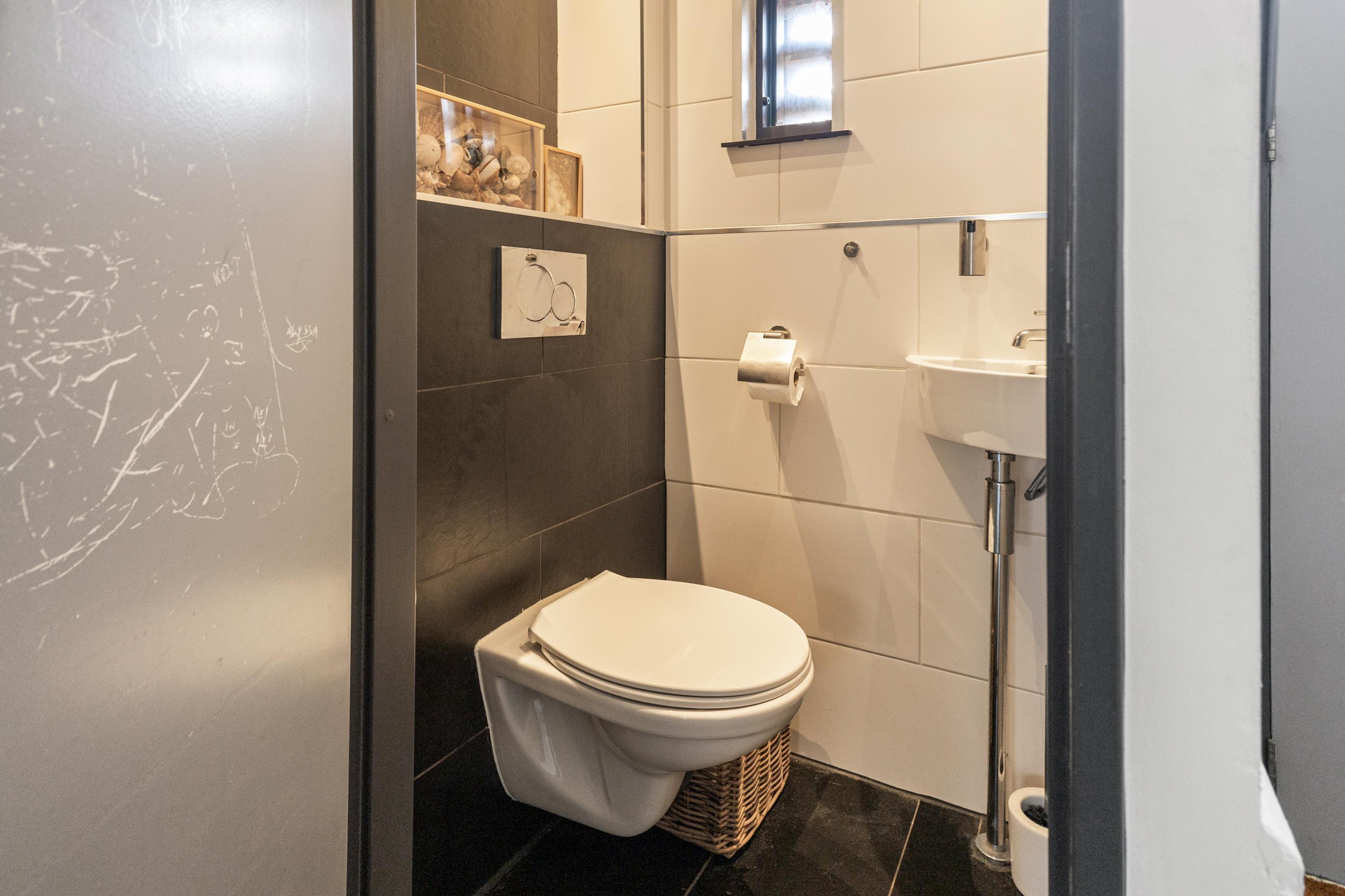 Voortuin met eigen oprit en stenen berging, entree woning met meterkast, toilet en trapopgang, woongedeelte met keuken aan straatzijde en tuingerichte woonkamer.