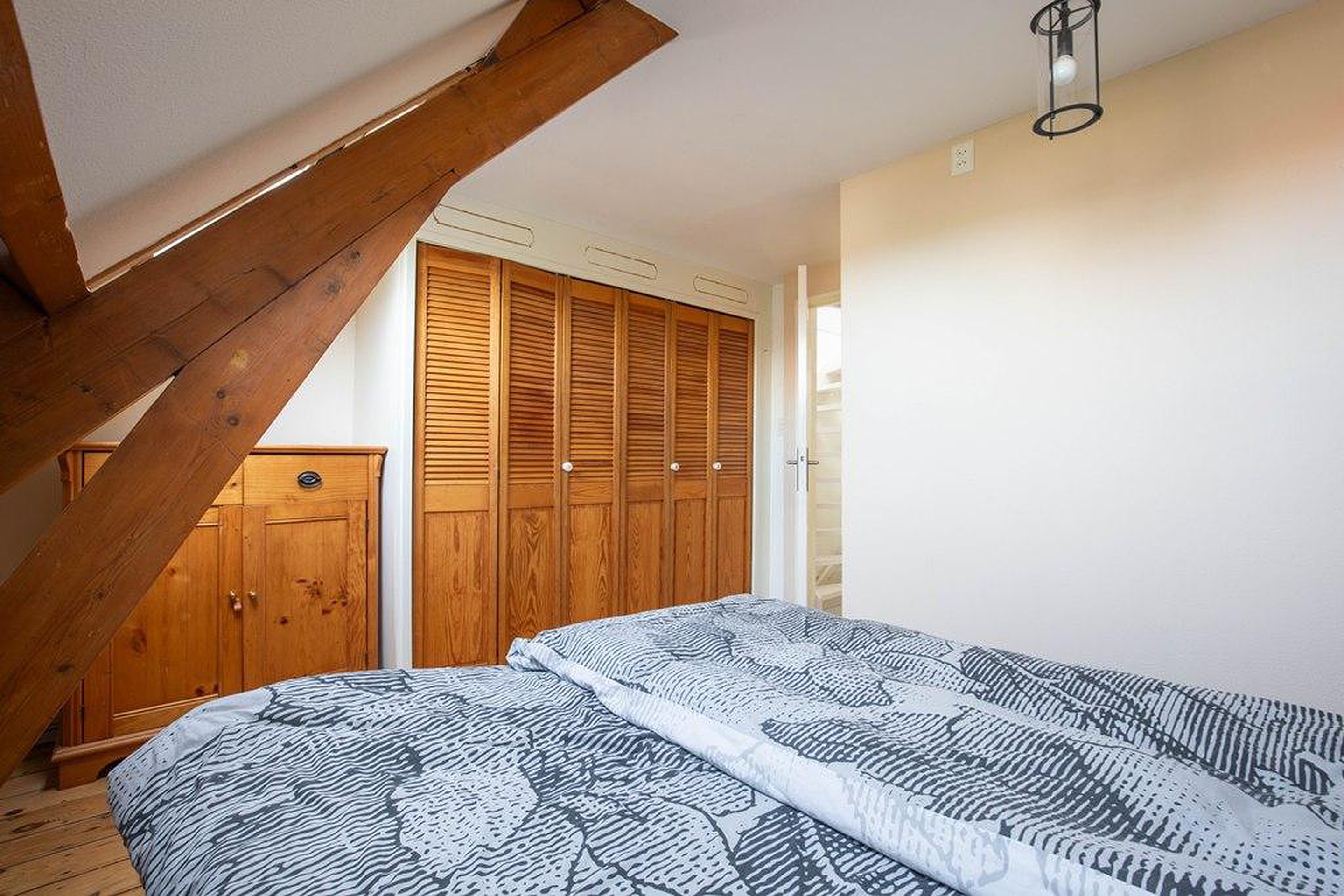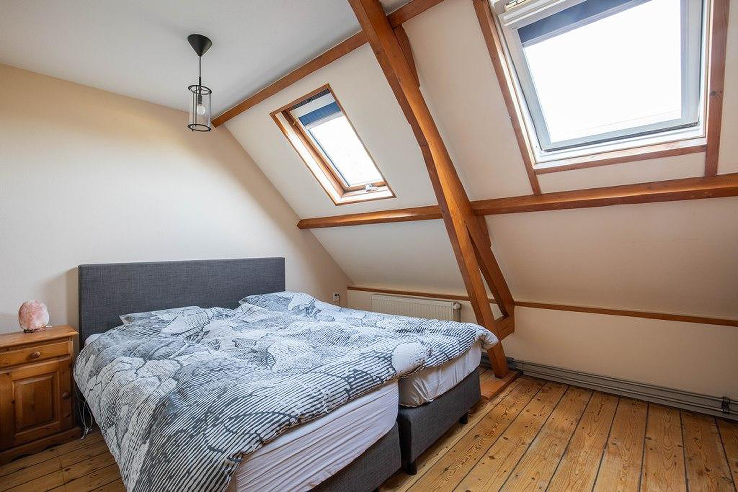 Op de eerste verdieping liggen twee ruime slaapkamers. De kamer aan de voorzijde is voorzien van een dakkapel, wat zorgt voor extra licht en ruimte. De slaapkamer aan de achterzijde heeft Velux dakramen én een grote vaste kast – ideaal voor kleding of extra opbergruimte.