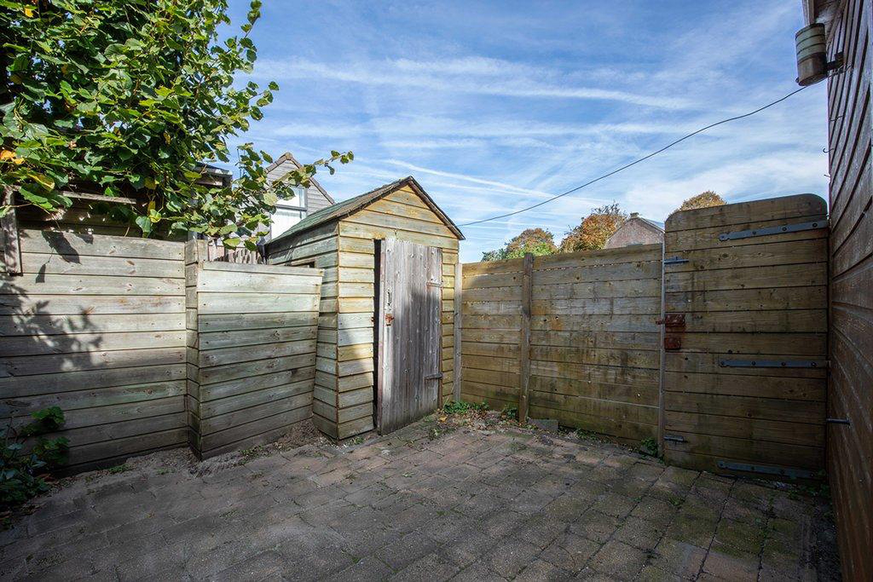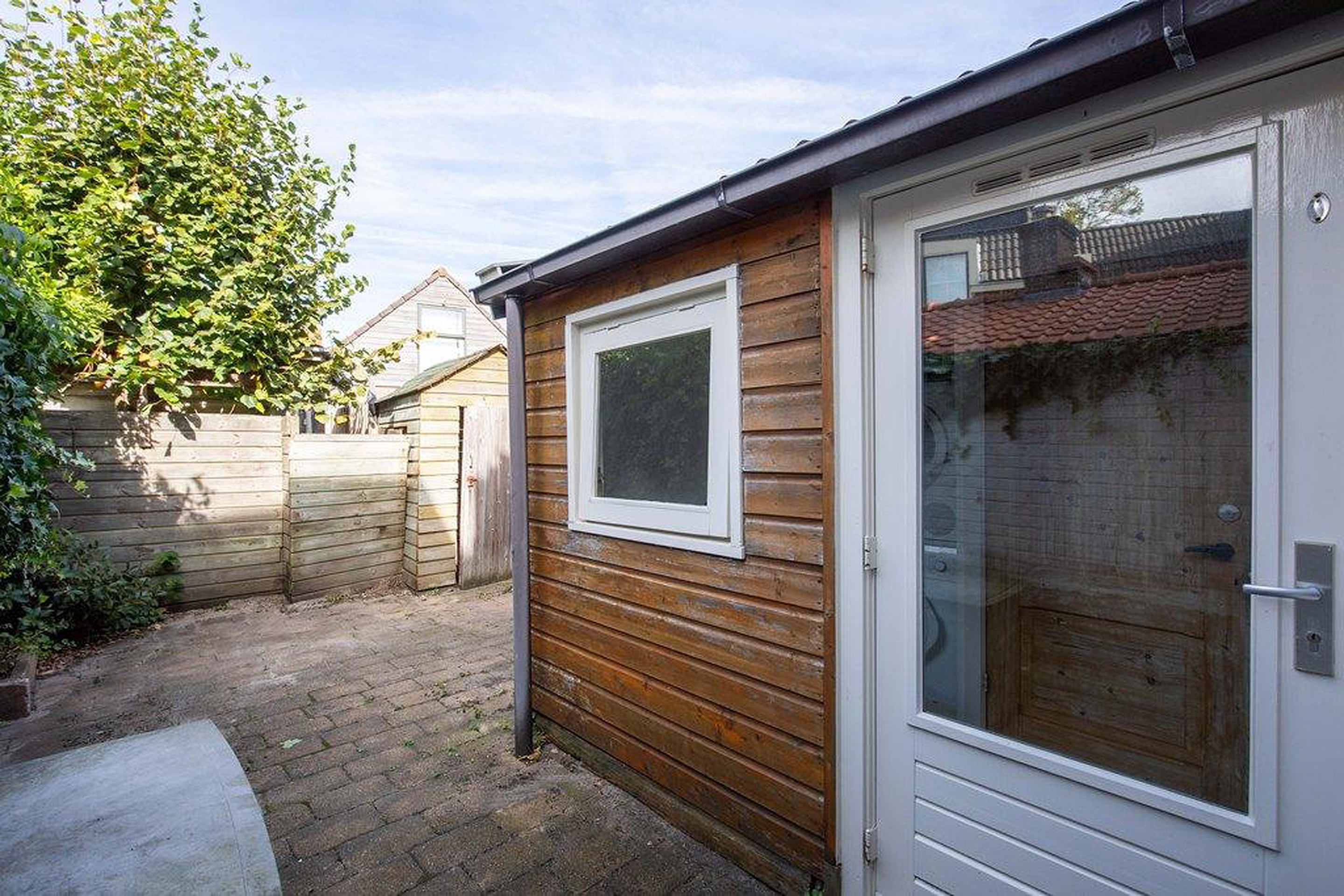 De buitenplaats is lekker besloten en biedt volop mogelijkheden om er een sfeervolle plek van te maken. Of je nu kiest voor een eettafel, een loungeset of juist veel groen; hier kun je alle kanten op. Dankzij de achterom en de houten berging is het ook praktisch in gebruik. De berging heeft nog wat liefde nodig, maar vormt een mooie basis voor extra opslag.