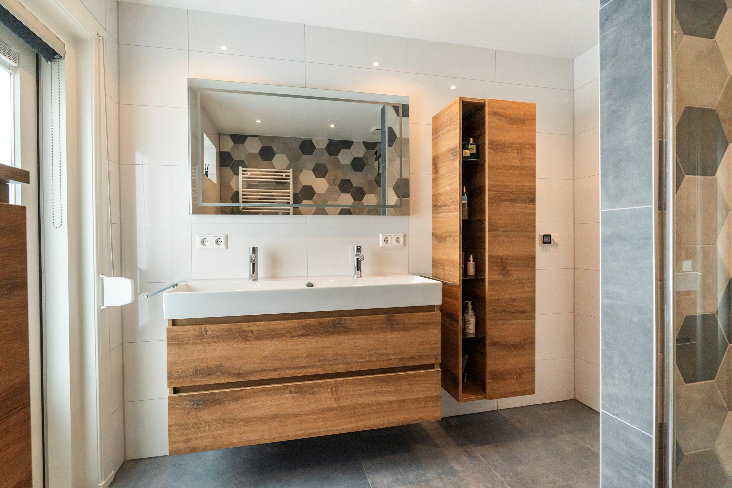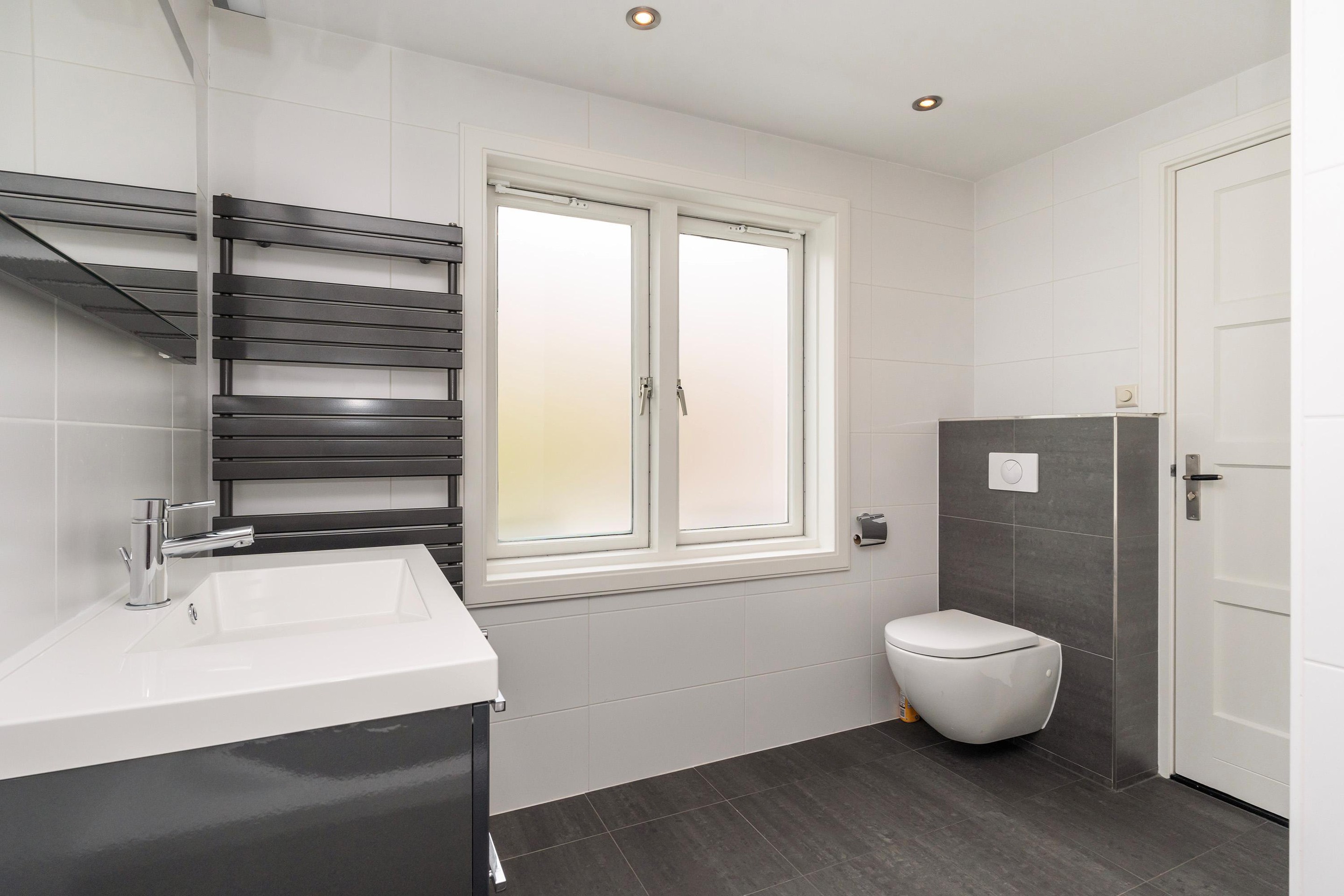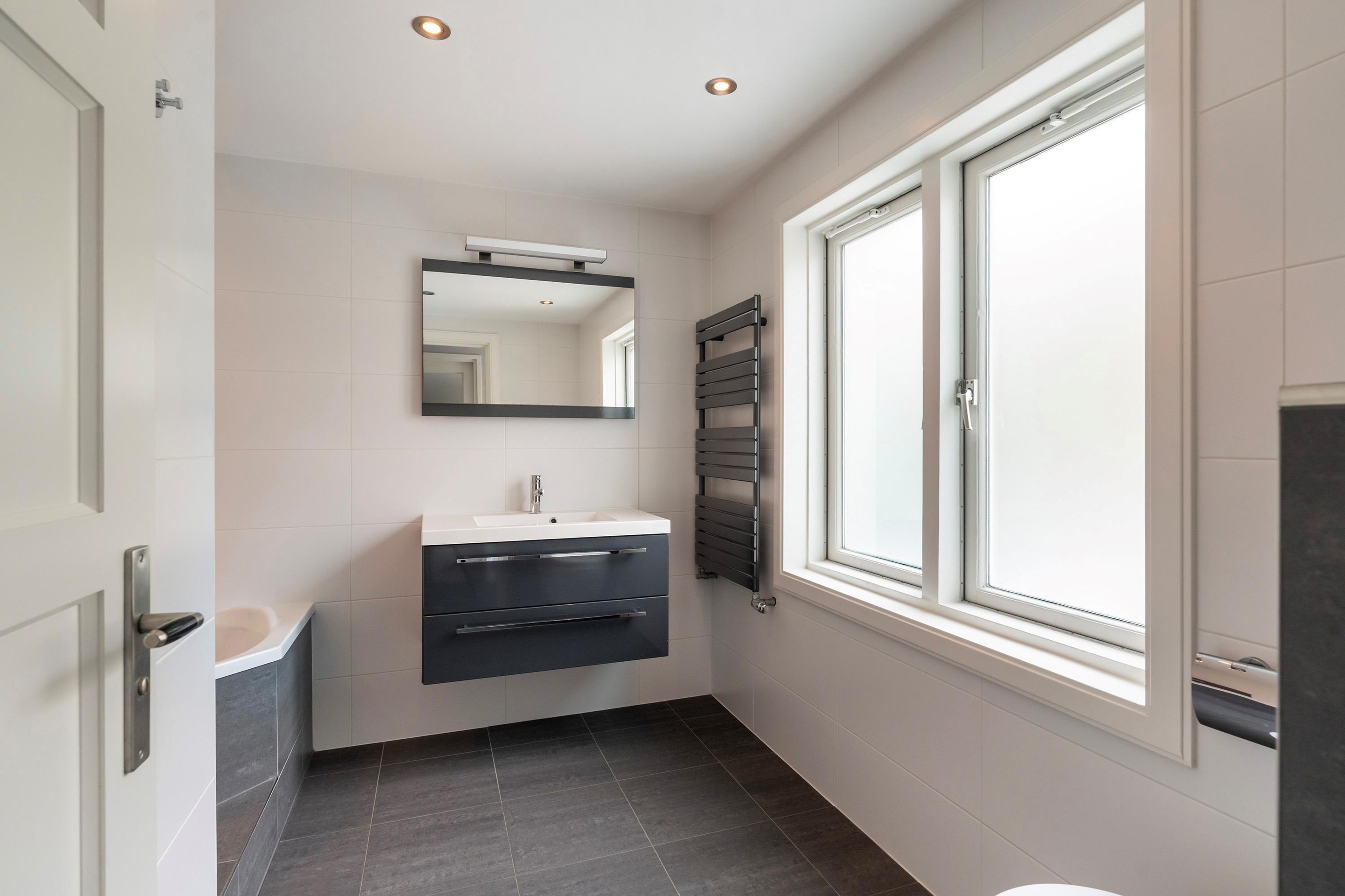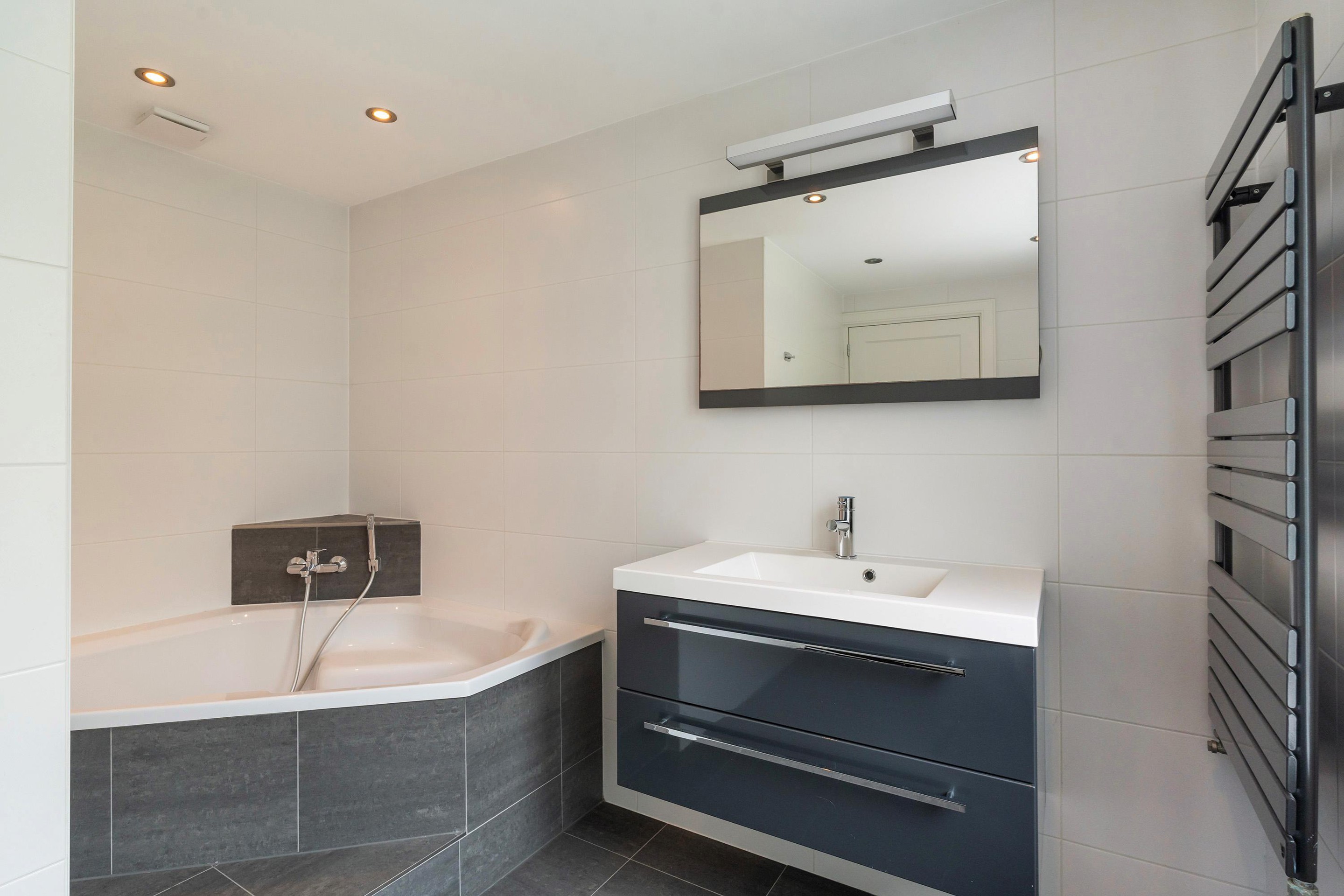 Tussenhal met wasruimte, CV-opstelling (2021) en toegang tot de eerste ruime badkamer, voorzien van hoekligbad, wastafelmeubel, tweede toilet en designradiator.