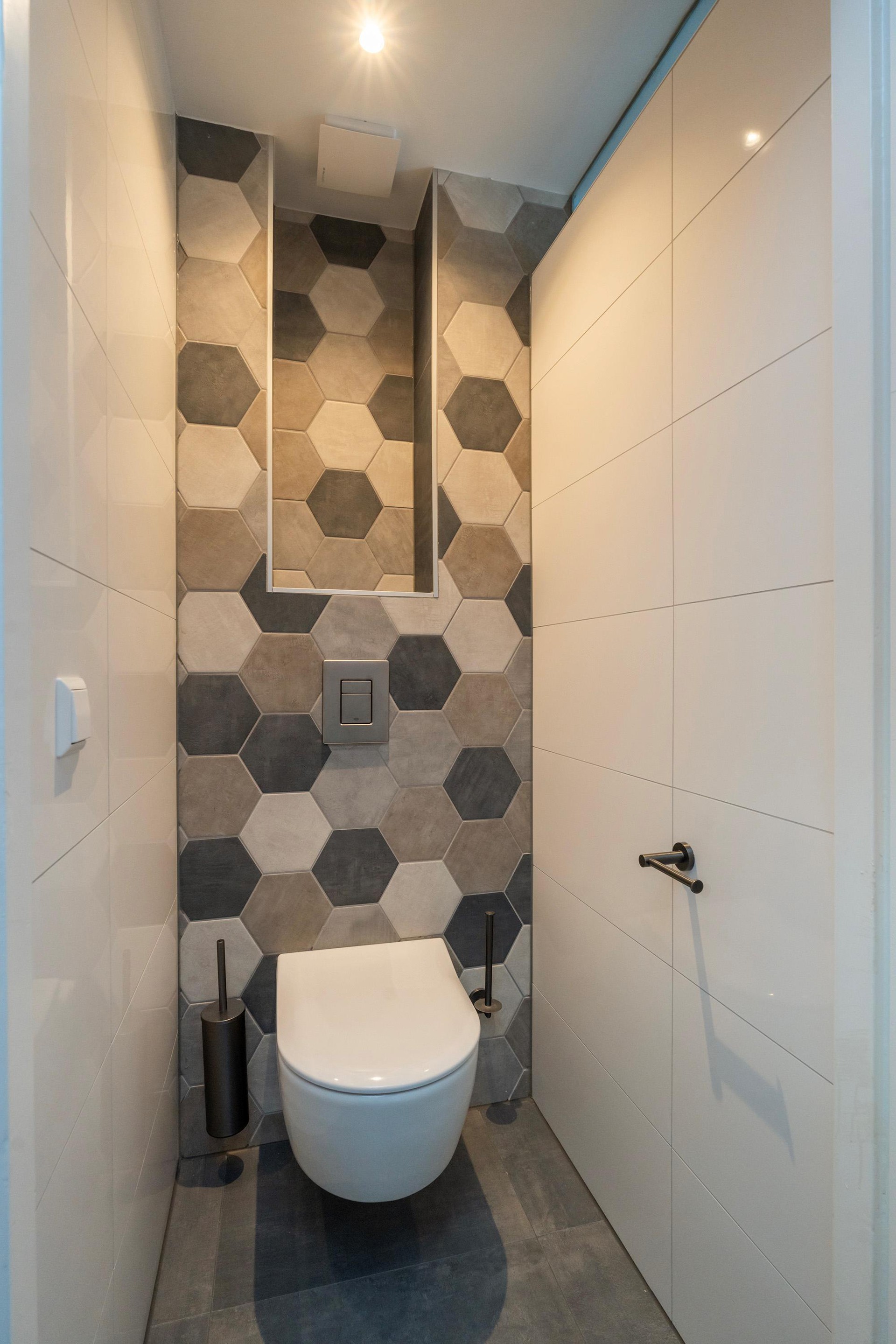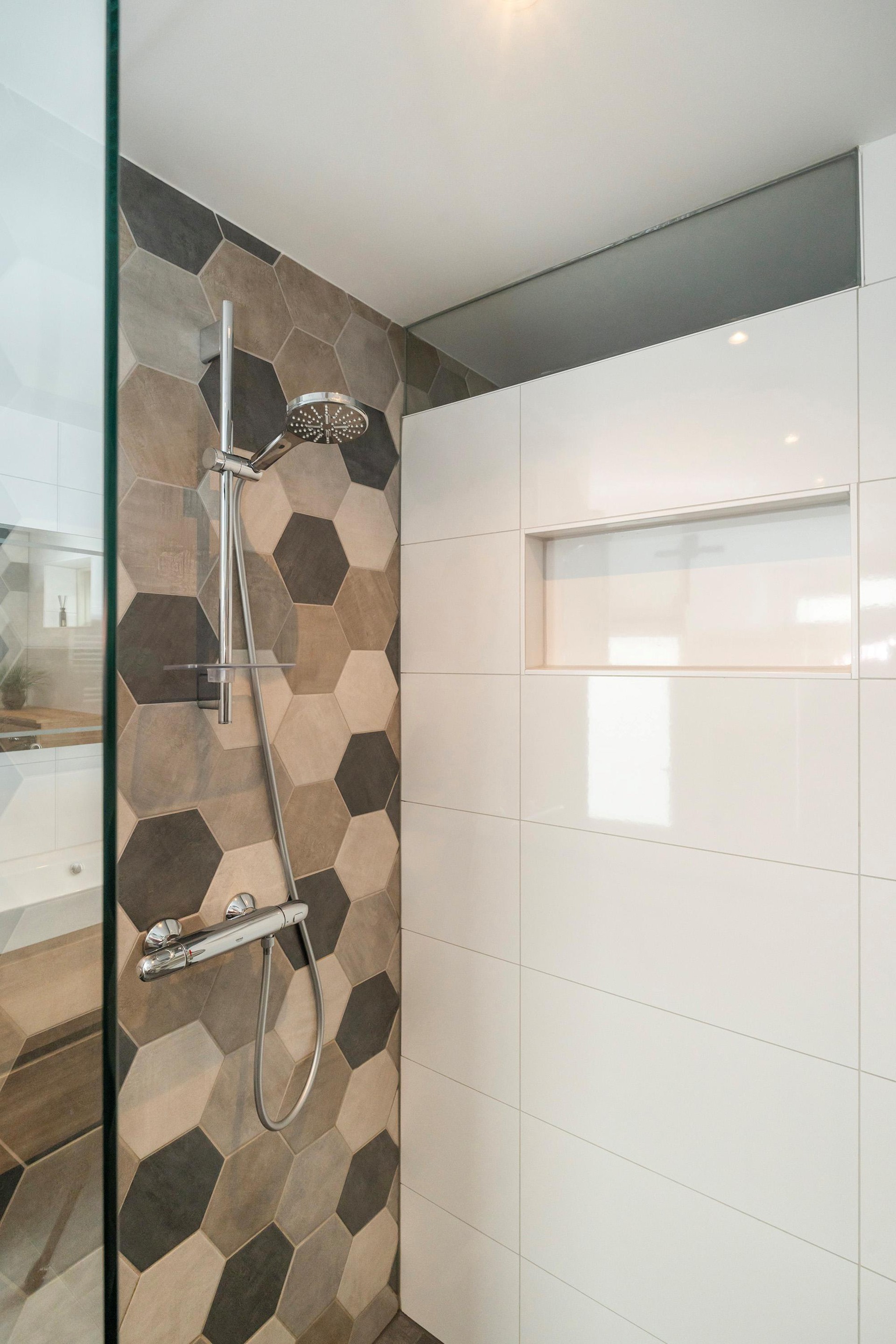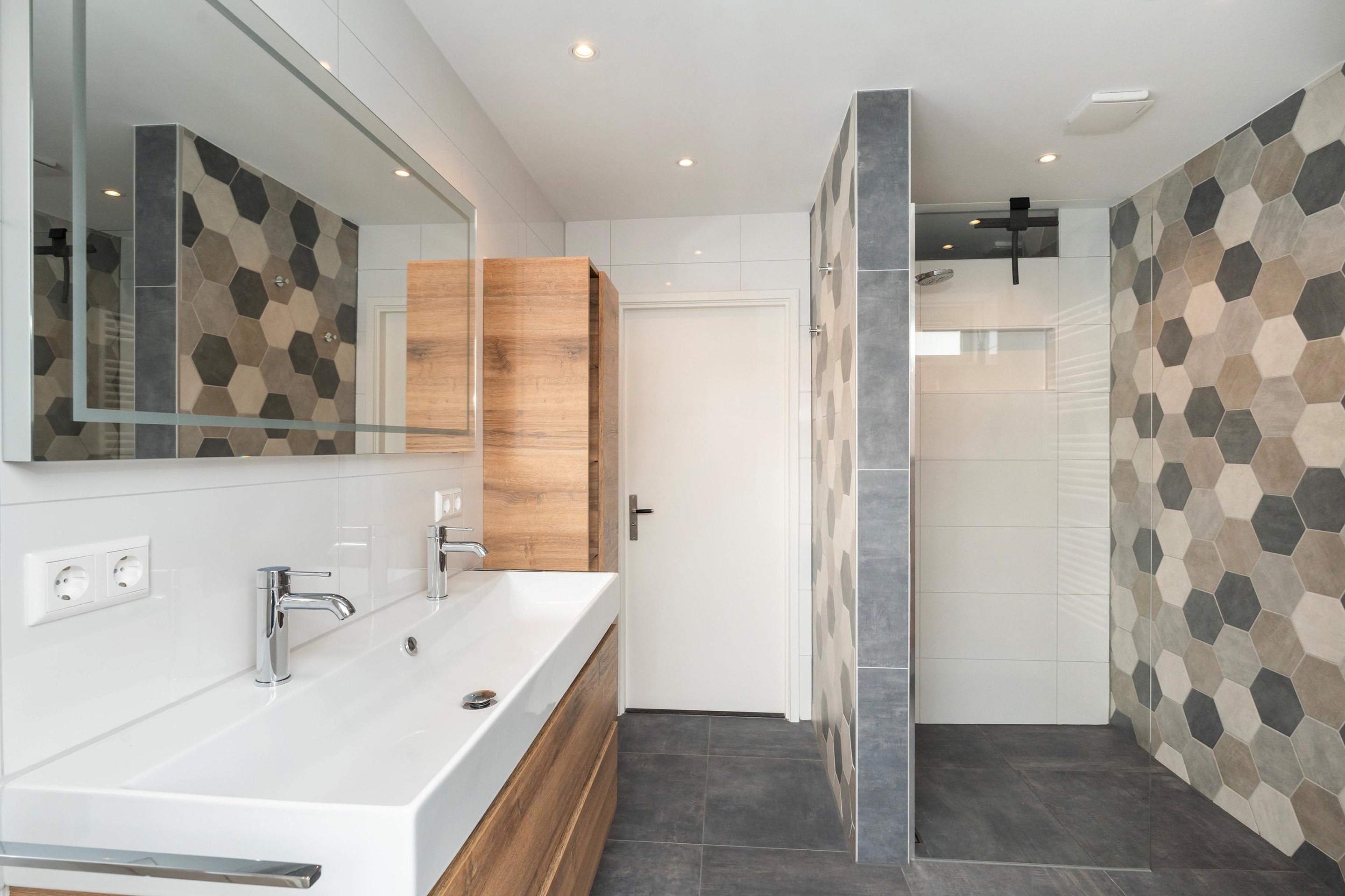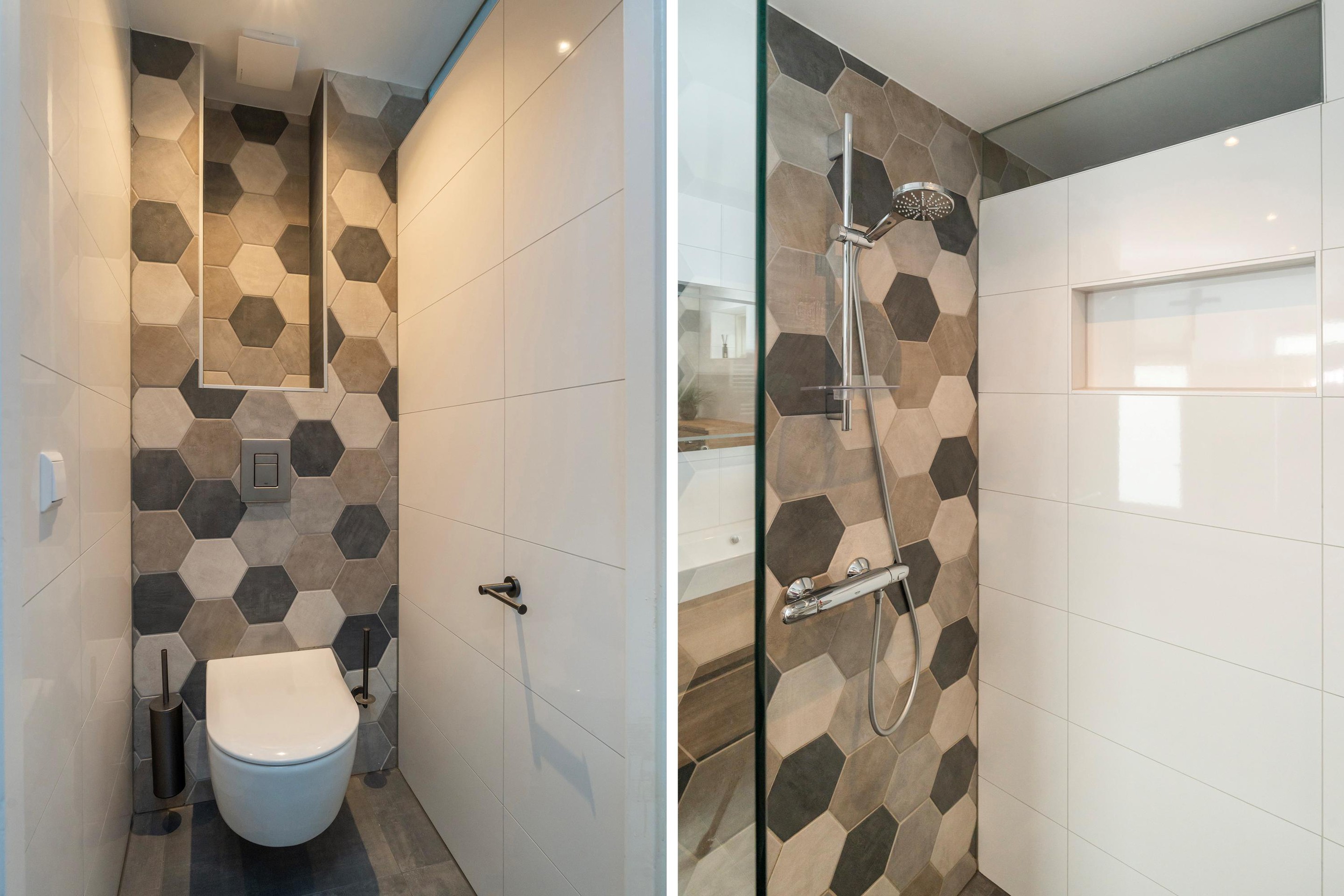 Tussenhal met wasruimte, CV-opstelling (2021) en toegang tot de eerste ruime badkamer, voorzien van hoekligbad, wastafelmeubel, tweede toilet en designradiator.