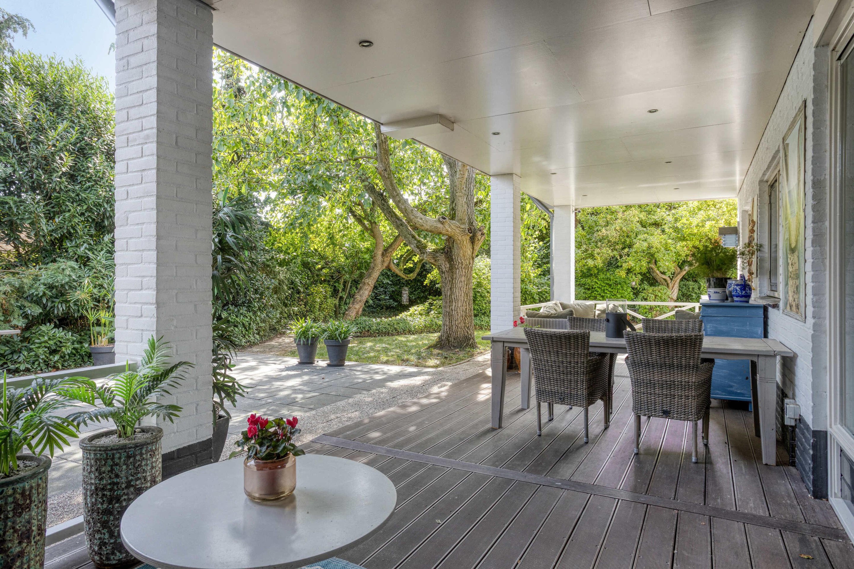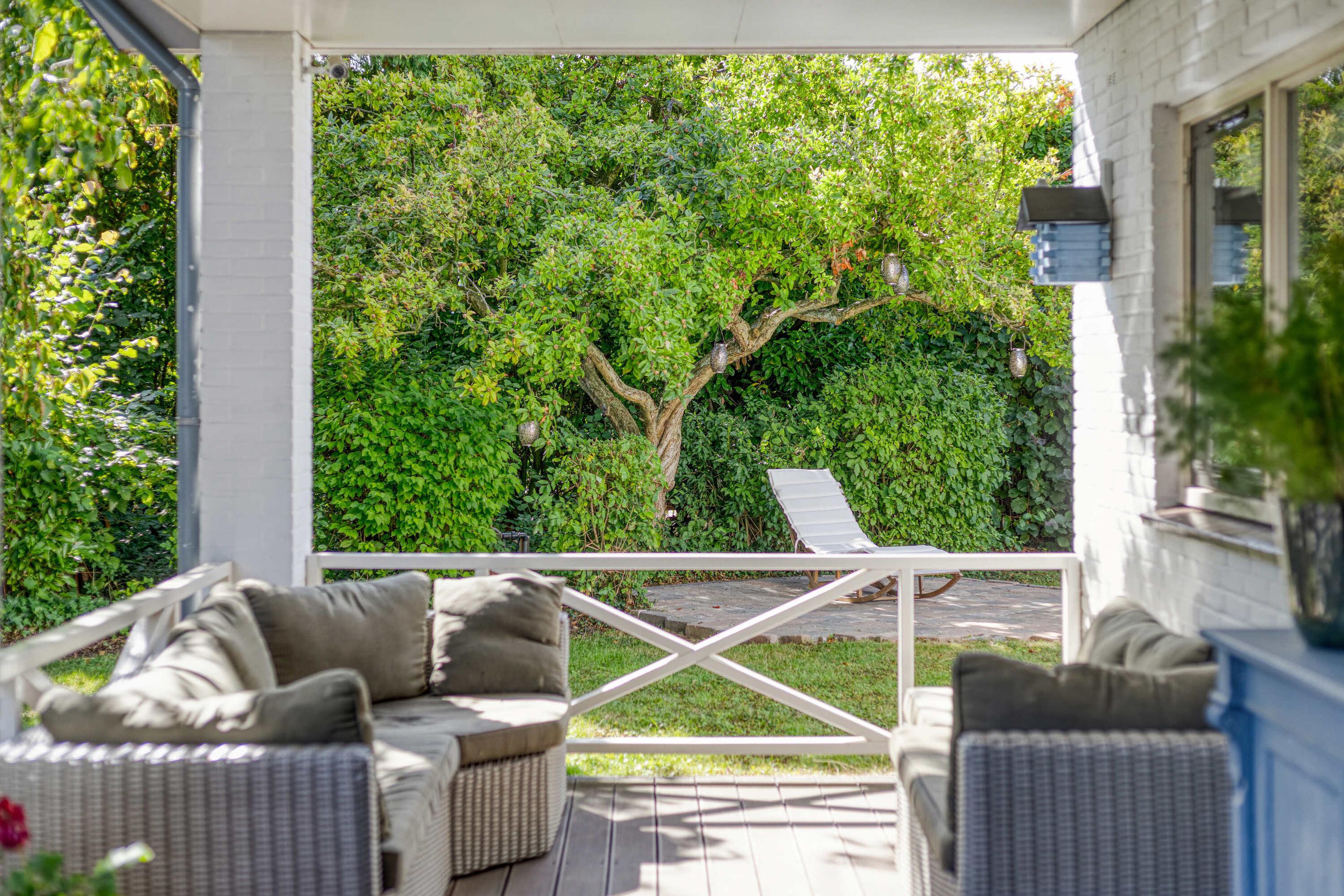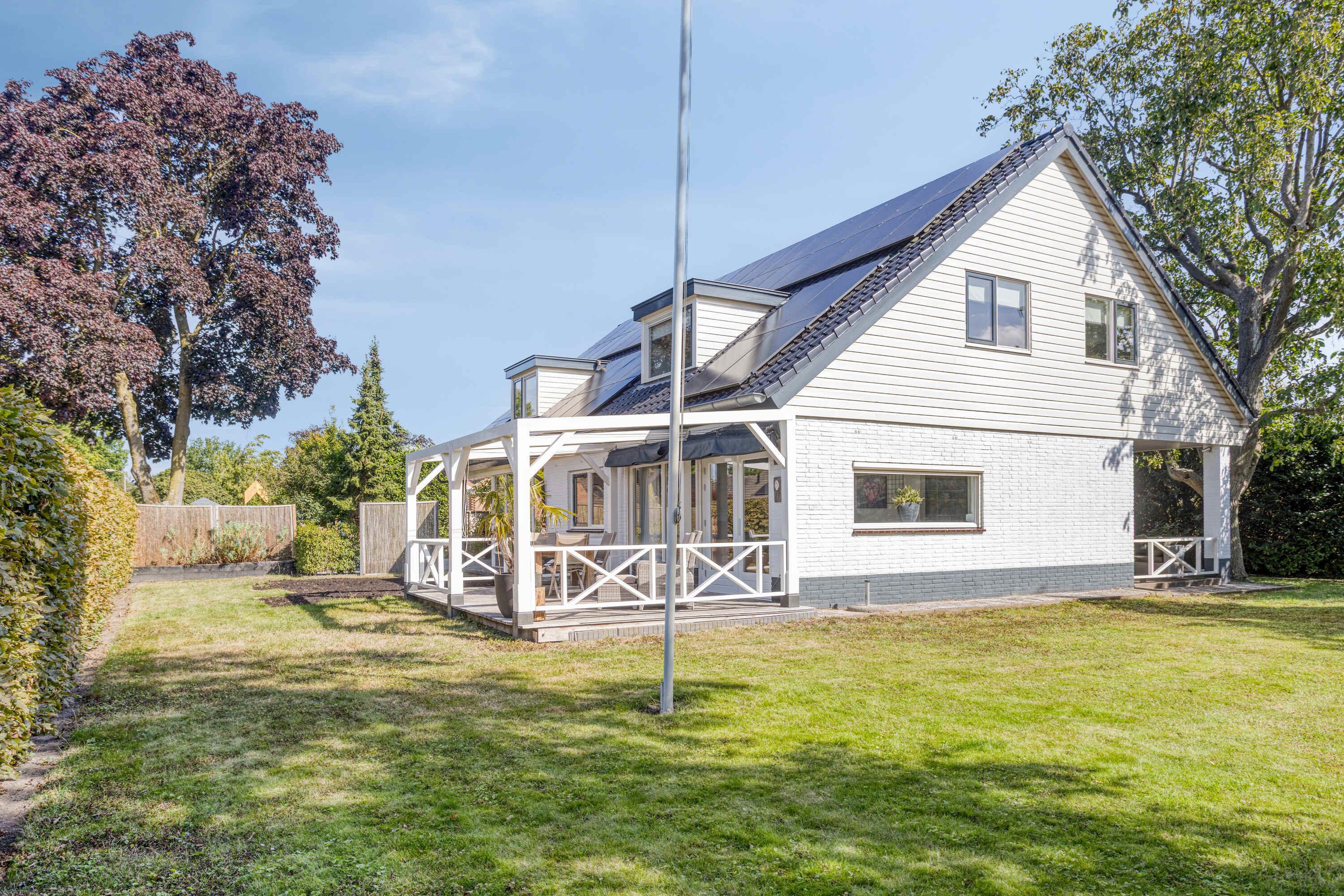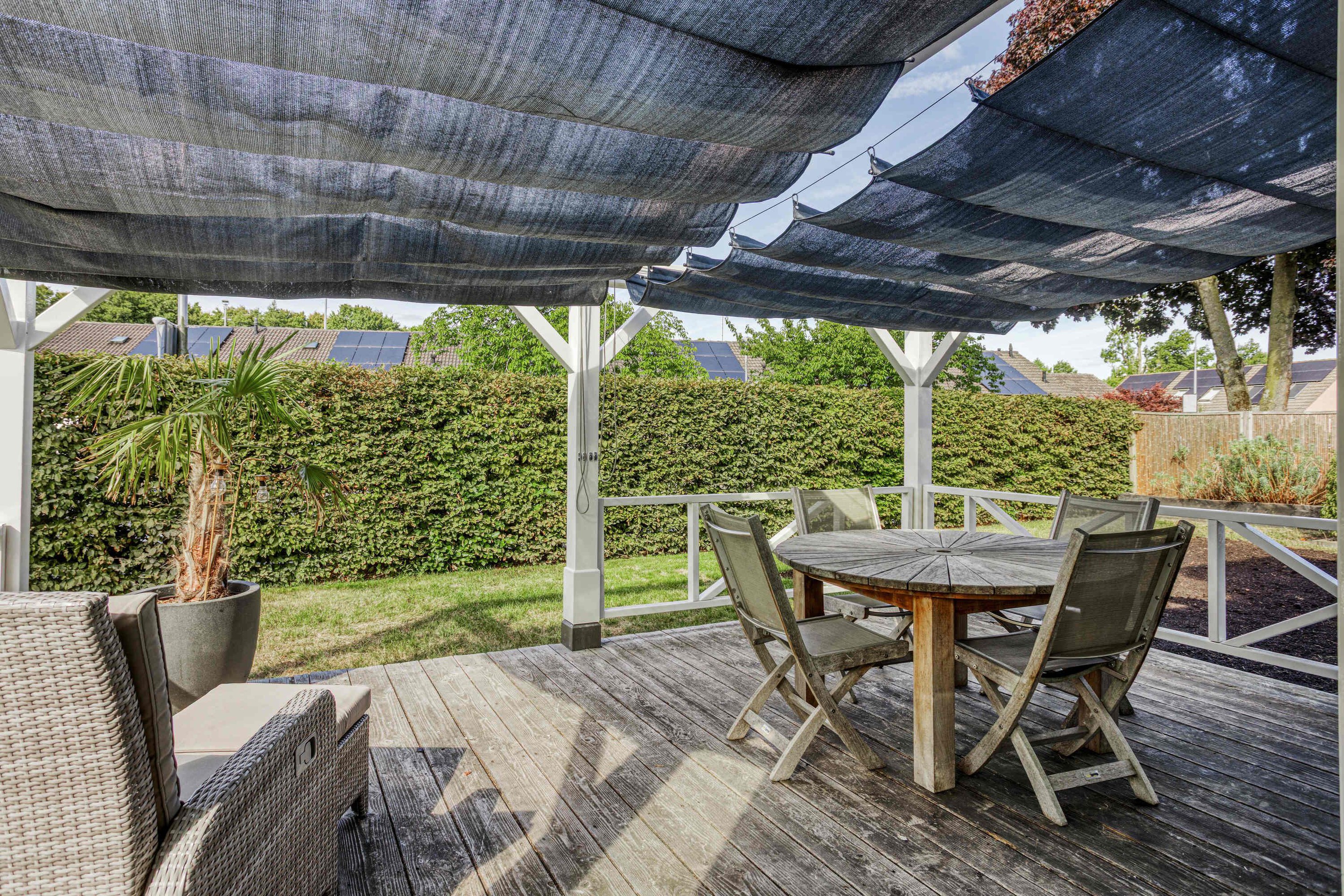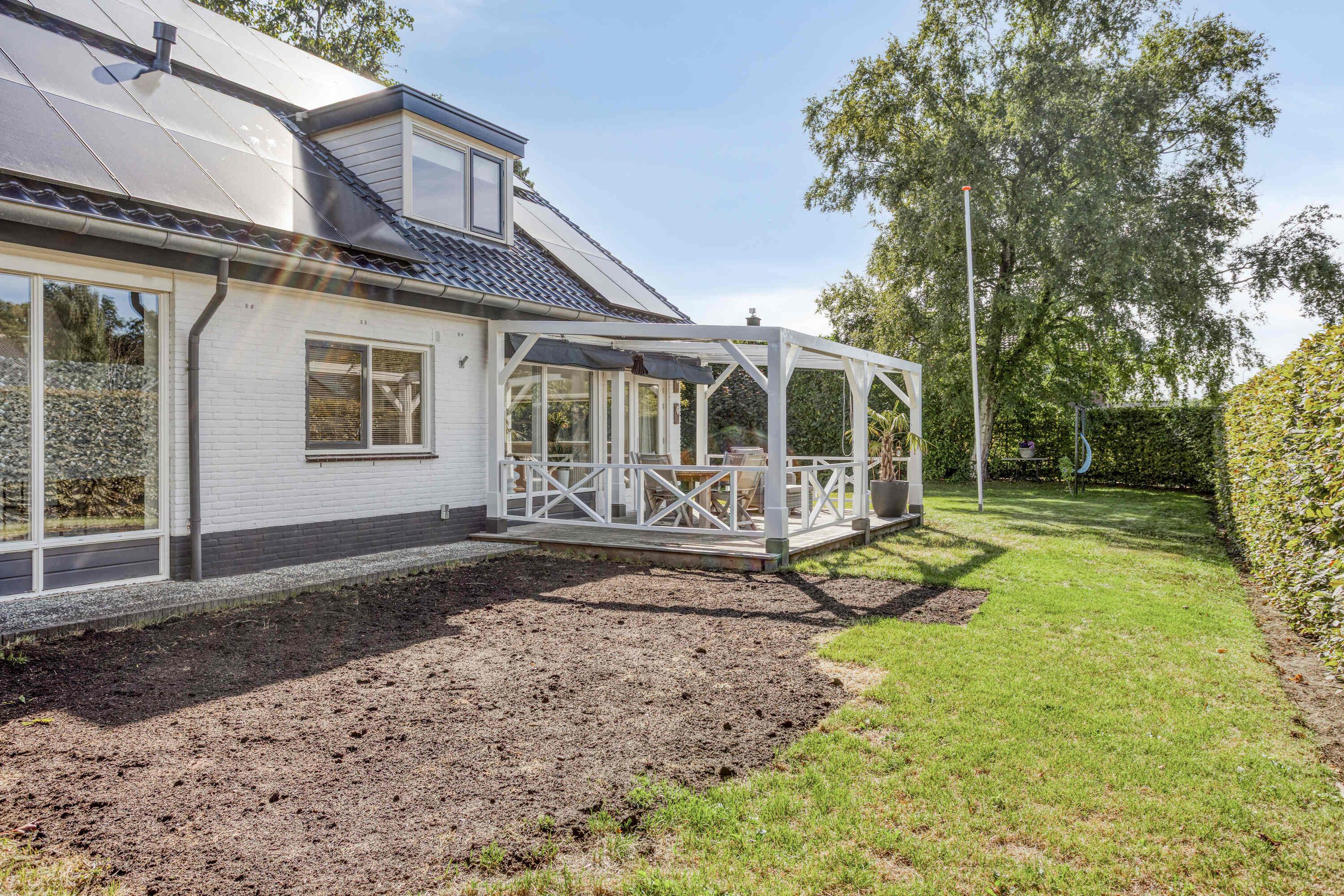 De tuin rondom de woning biedt volop privacy en groen, mede dankzij de gunstige hoekligging en lage bebouwing in de directe omgeving. Dankzij de verschillende terrassen – waaronder een overdekt terras direct grenzend aan de woonkamer – is er altijd een fijne plek om te zitten. De royale oprit biedt ruimte aan meerdere auto’s en de indeling van de woning zorgt ervoor dat je aan alle kanten verbonden bent met buiten.
