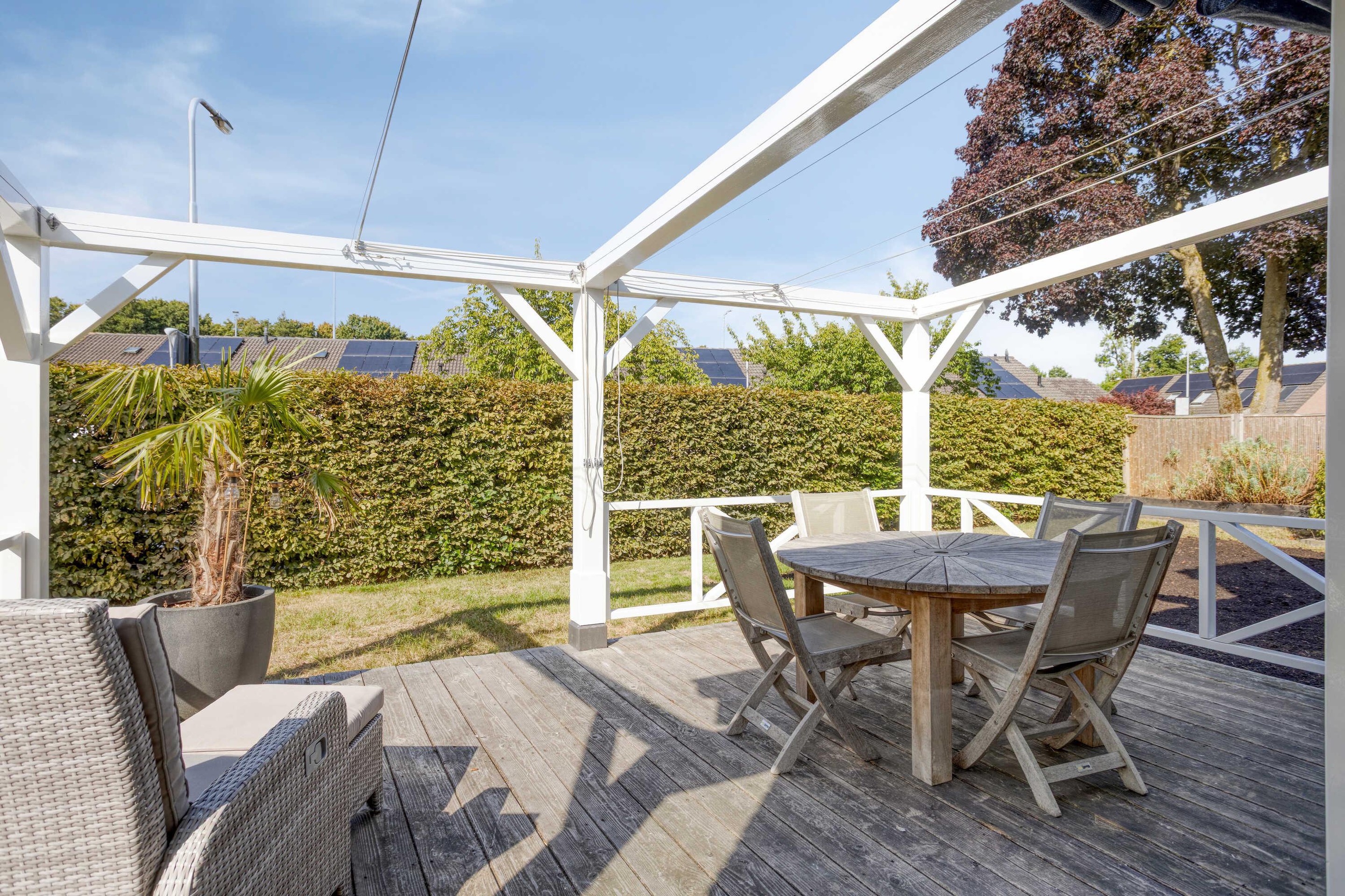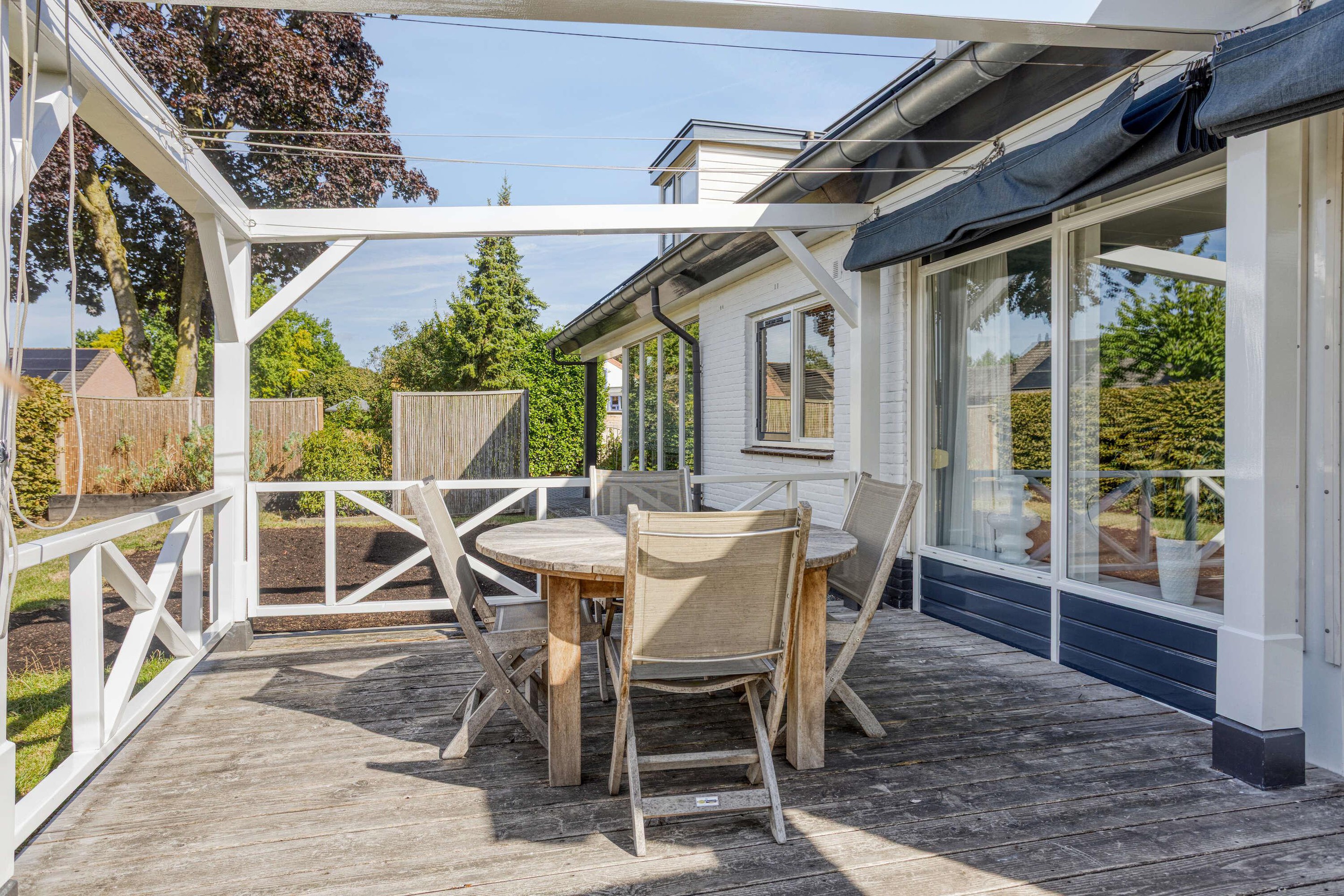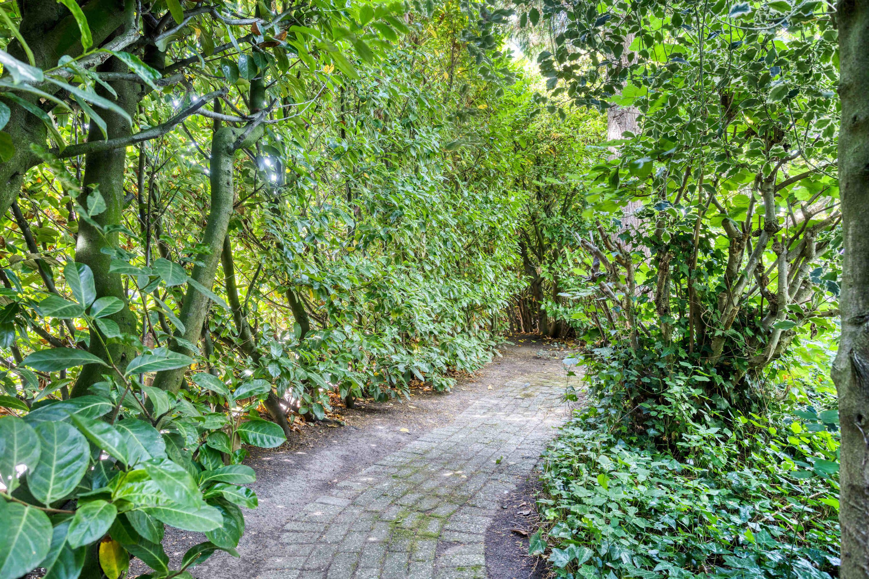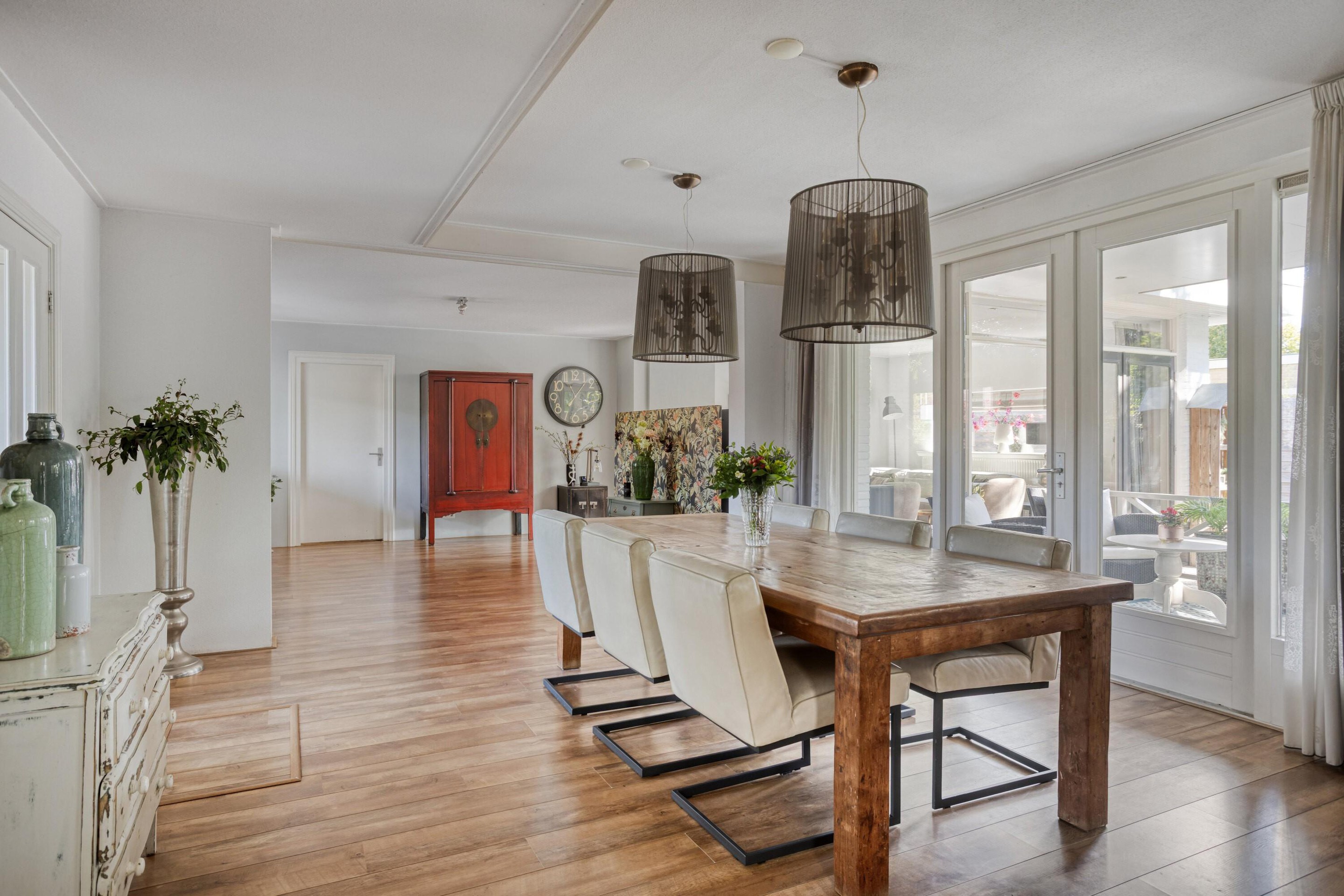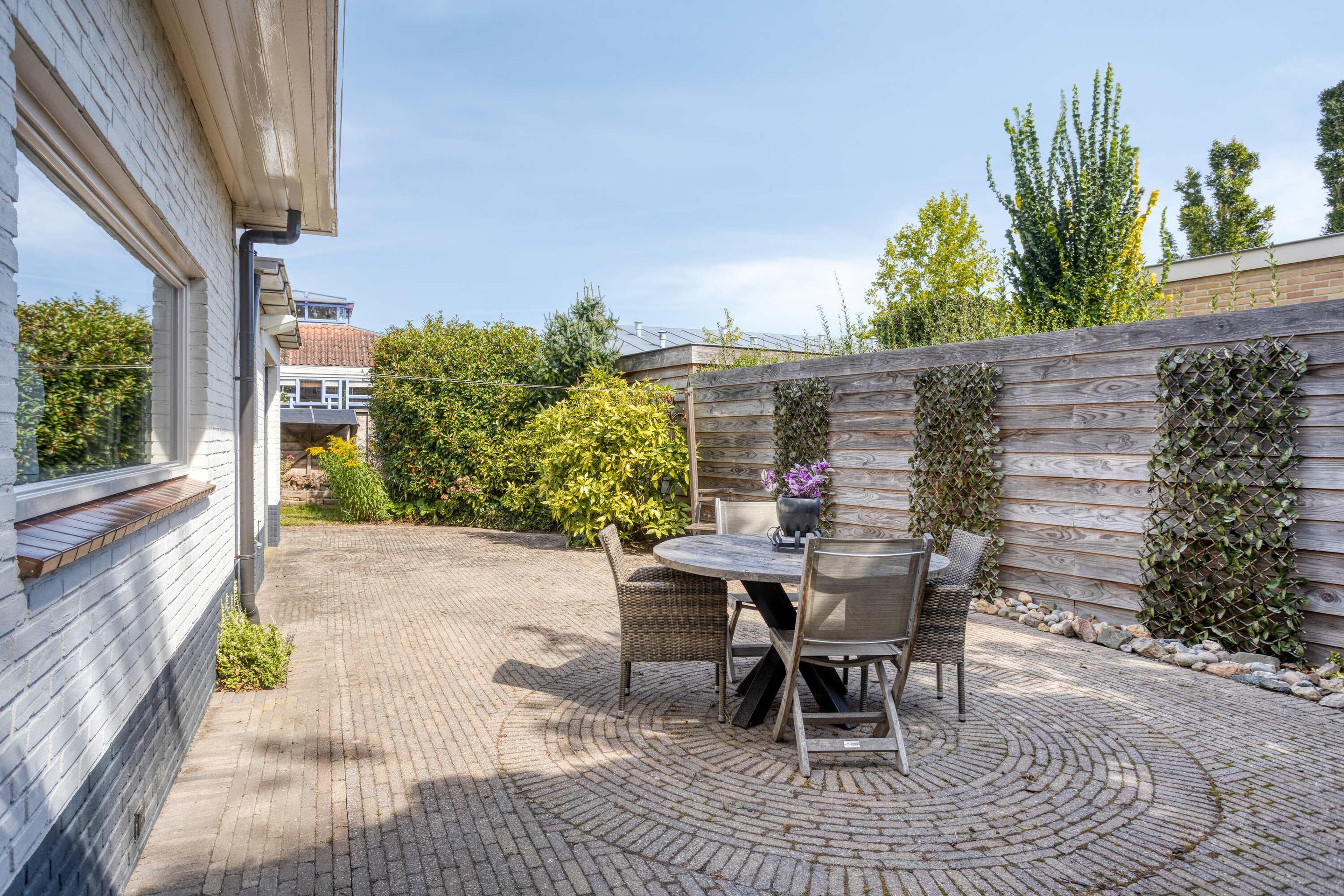 De tuin rondom de woning biedt volop privacy en groen, mede dankzij de gunstige hoekligging en lage bebouwing in de directe omgeving. Dankzij de verschillende terrassen – waaronder een overdekt terras direct grenzend aan de woonkamer – is er altijd een fijne plek om te zitten. De royale oprit biedt ruimte aan meerdere auto’s en de indeling van de woning zorgt ervoor dat je aan alle kanten verbonden bent met buiten.