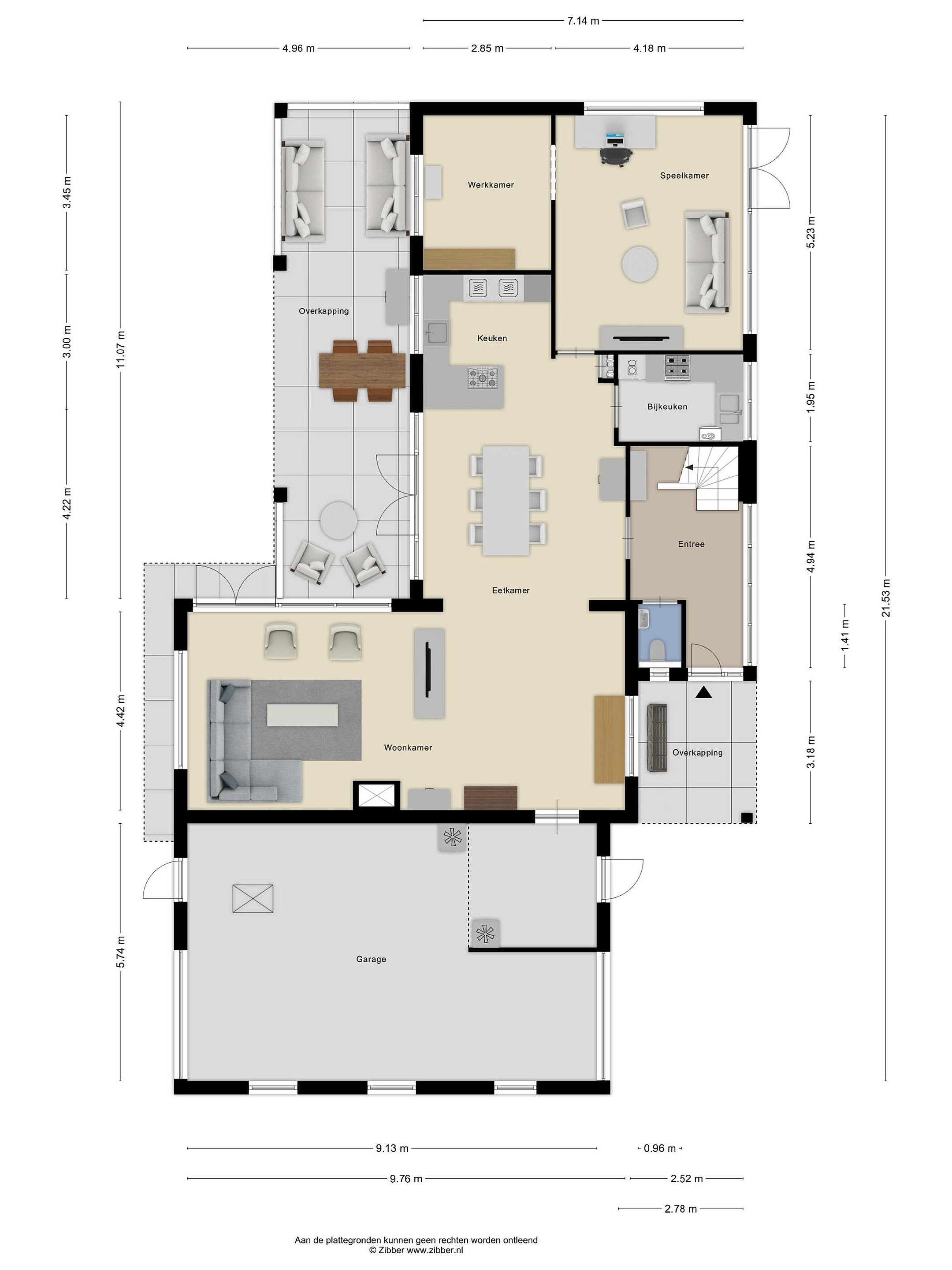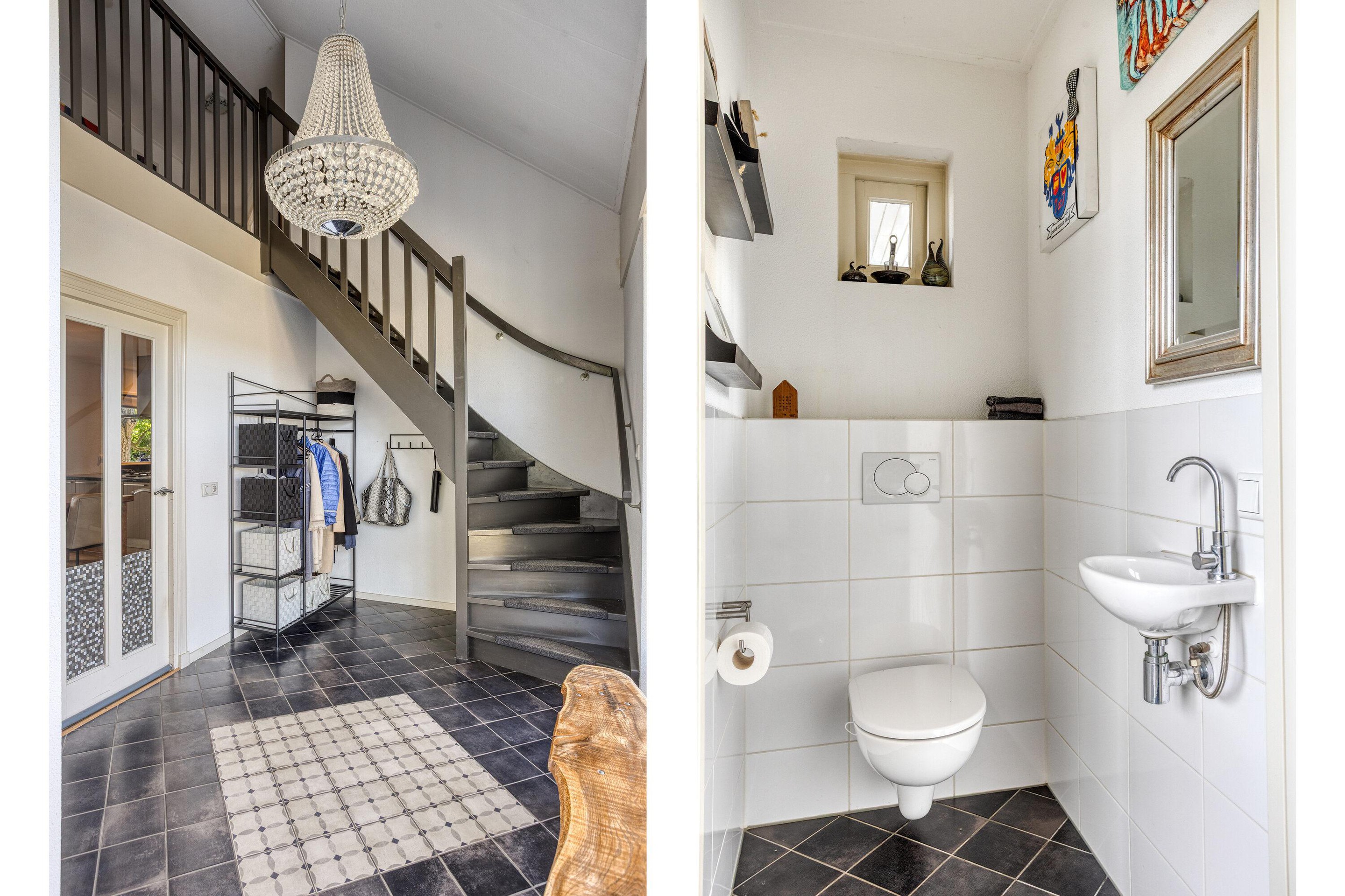 Via de overdekte entree kom je binnen in een lichte, royale hal met garderoberuimte en trapopgang. Hier vind je ook het toilet. De woonkamer is ruim en sfeervol, met een gashaard als gezellig middelpunt en openslaande deuren naar het overdekte terras. Ook in het eetgedeelte zorgen openslaande deuren voor een fijne verbinding met buiten. De open keuken is opgesteld in een praktische U-vorm en voorzien van alle benodigde inbouwapparatuur. Grenzend hieraan bevindt zich de bijkeuken met extra keukenopstelling en witgoedaansluitingen. Daarnaast vind je op de begane grond nog een grote speelkamer met openslaande deuren naar het terras aan de voorzijde en een fijne werkkamer. En een royale inpandige garage van ruim 50 m2 met garagedeur én aparte loopdeuren aan de voor- en achterzijde.