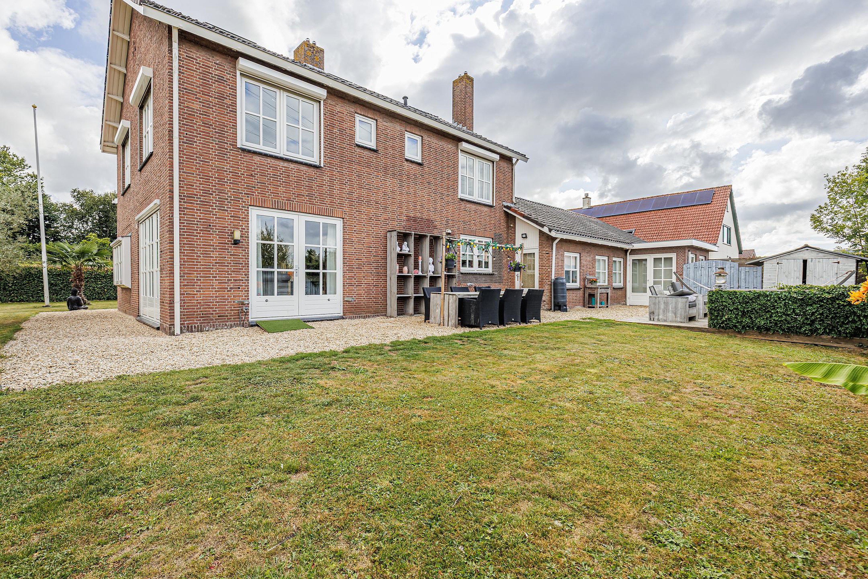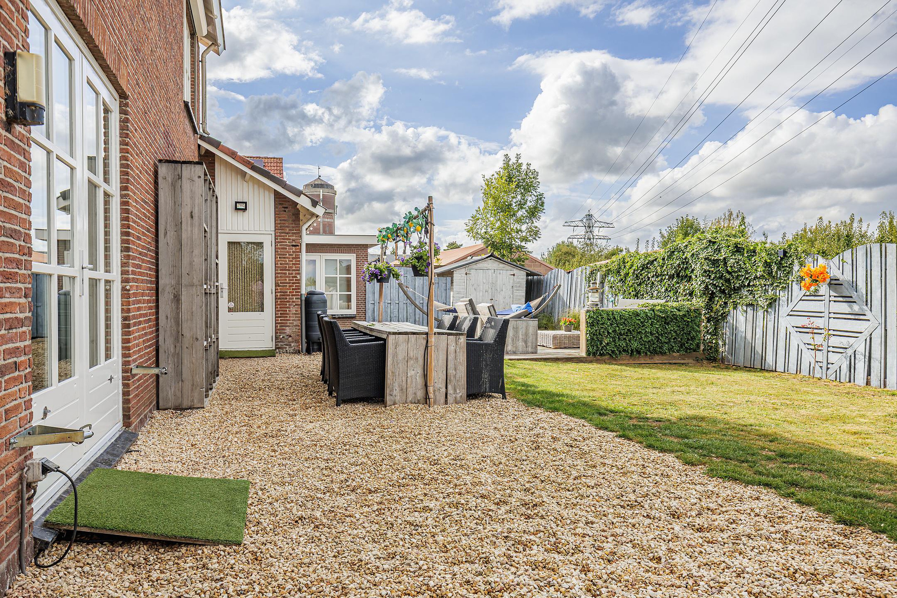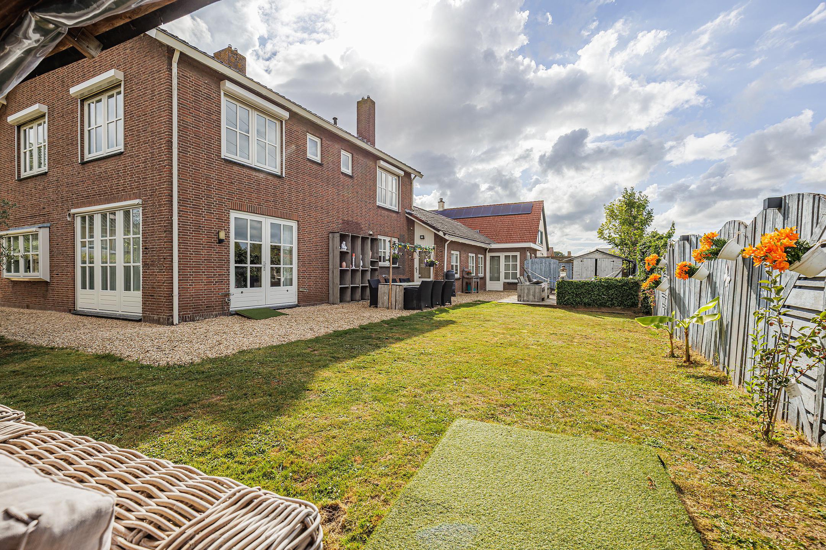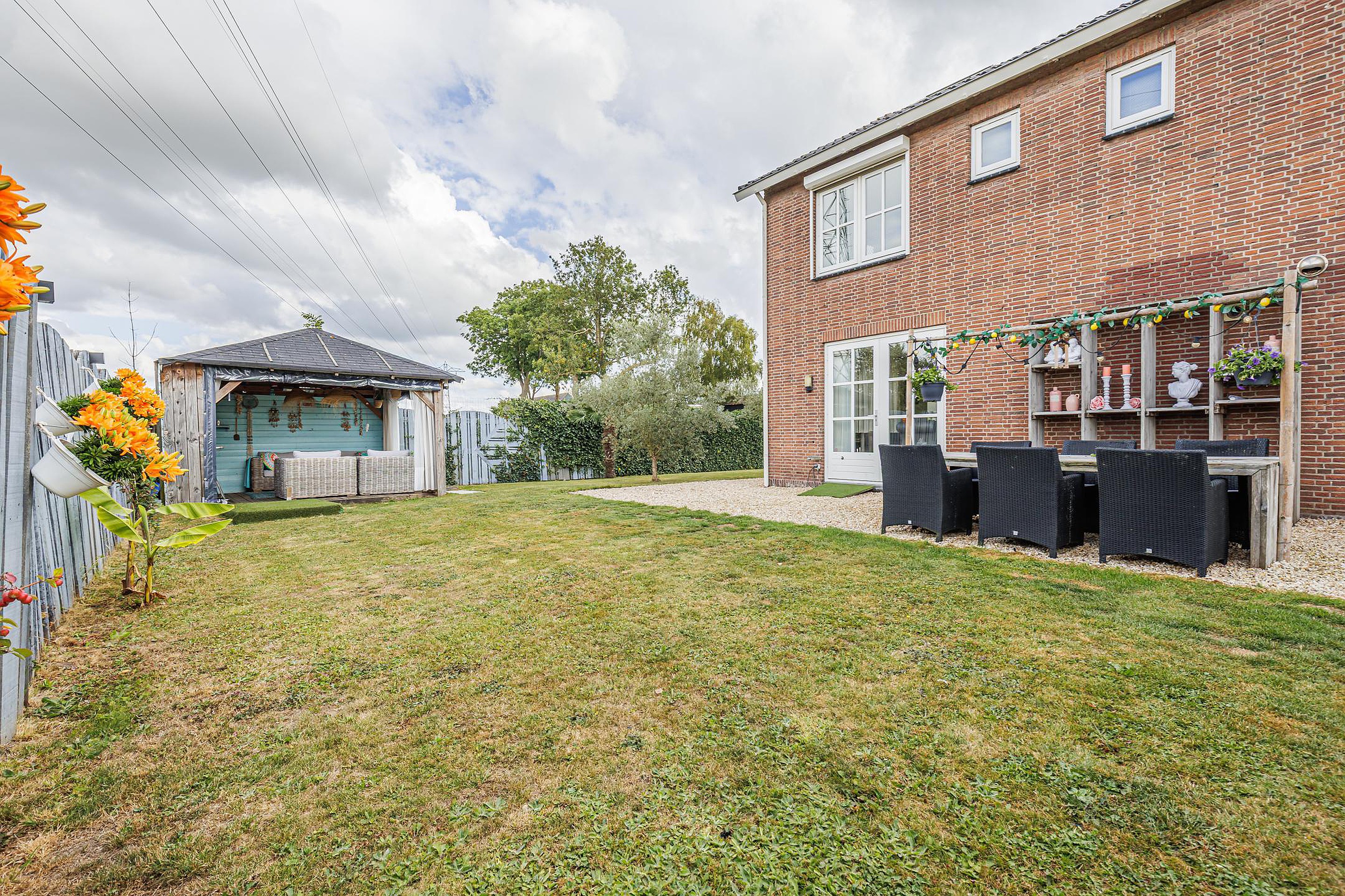 Rondom de woning ligt een fraai aangelegde en onderhoudsvriendelijke tuin. Meerdere terrassen en zitjes bieden altijd een plekje in de zon of schaduw. Onder de overkapping geniet je van lange zomeravonden, terwijl kinderen volop speelruimte hebben op het grote grasveld.