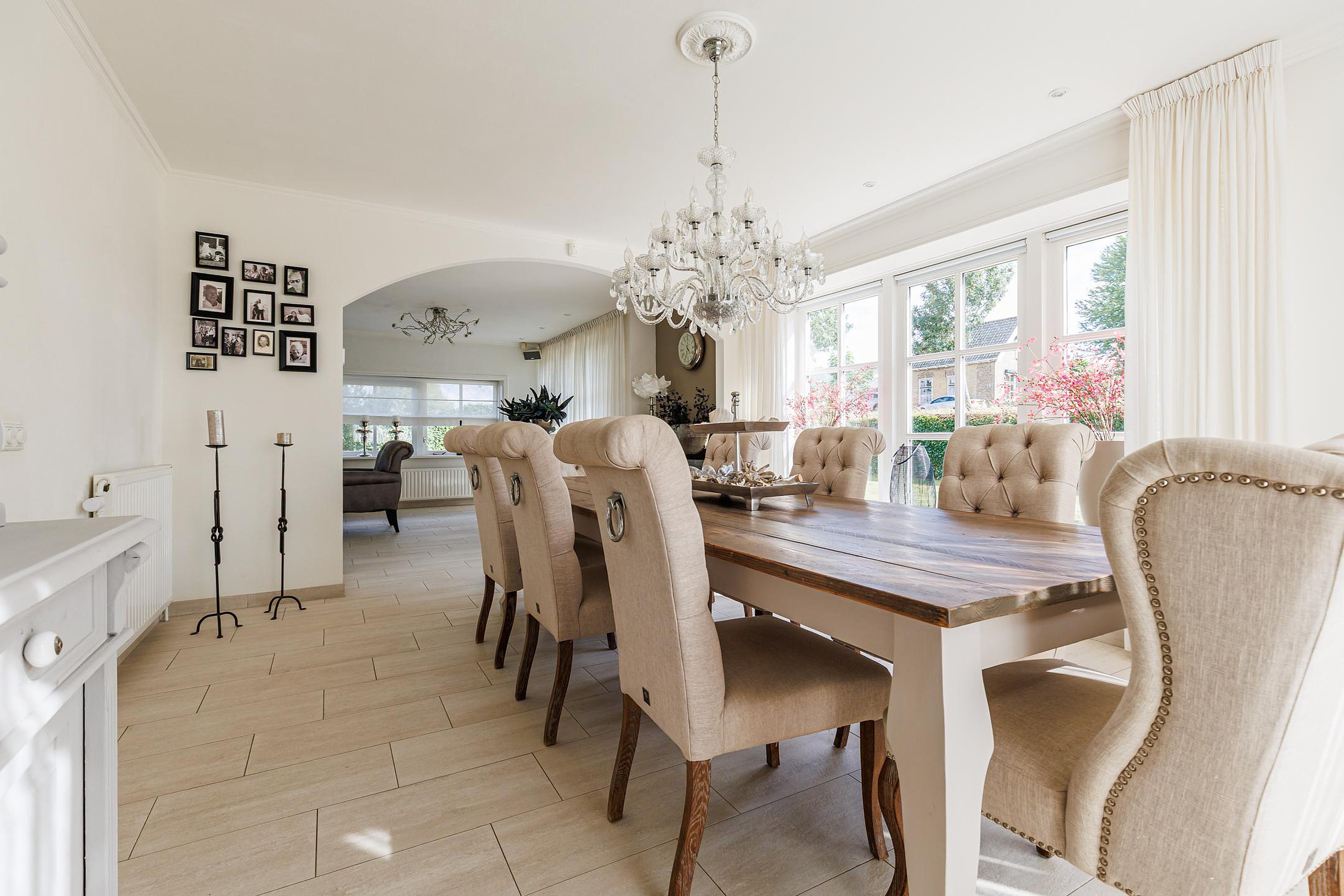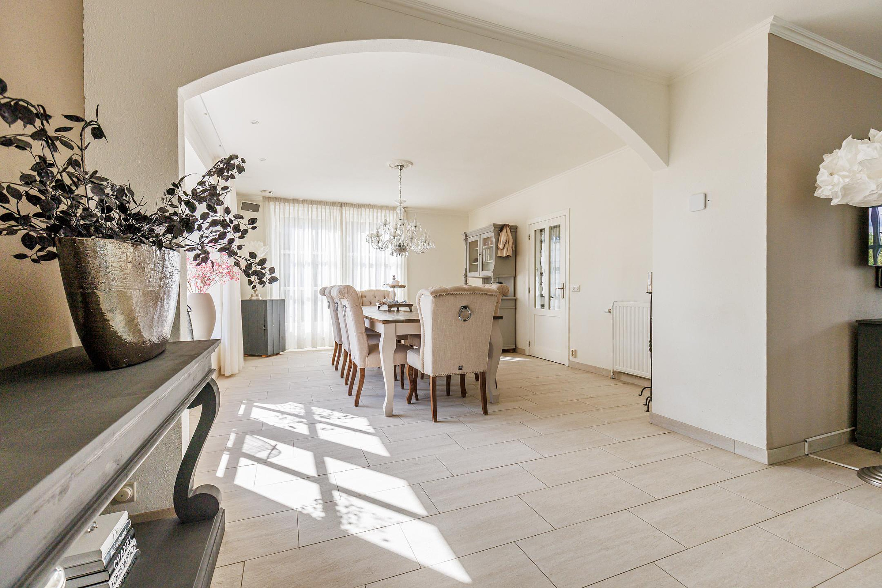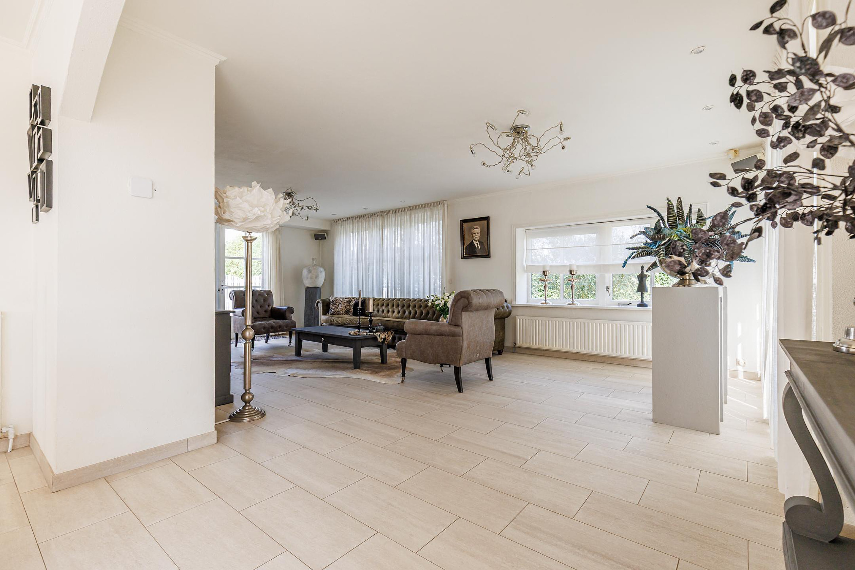 De entree geeft toegang tot een ruime hal met garderobe en toilet. De royale woonkamer (ca. 60 m2) is heerlijk licht door de grote raampartijen en openslaande deuren naar de tuin. De plafonds en wanden zijn strak gestuukt en de plavuizenvloer met vloerverwarming zorgt voor comfort. Aansluitend bevindt zich een aparte eetkamer, perfect voor lange avonden tafelen met familie of vrienden.