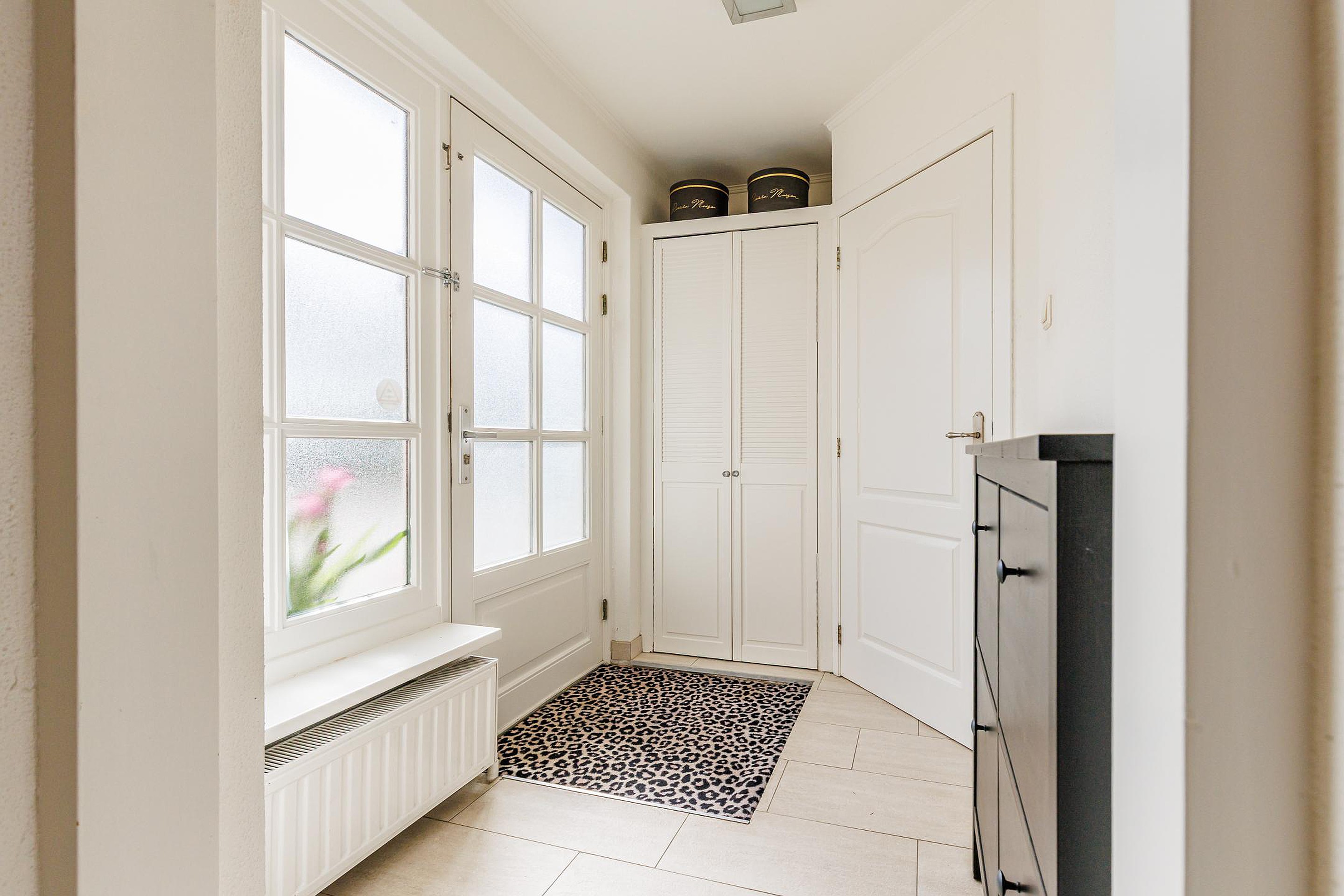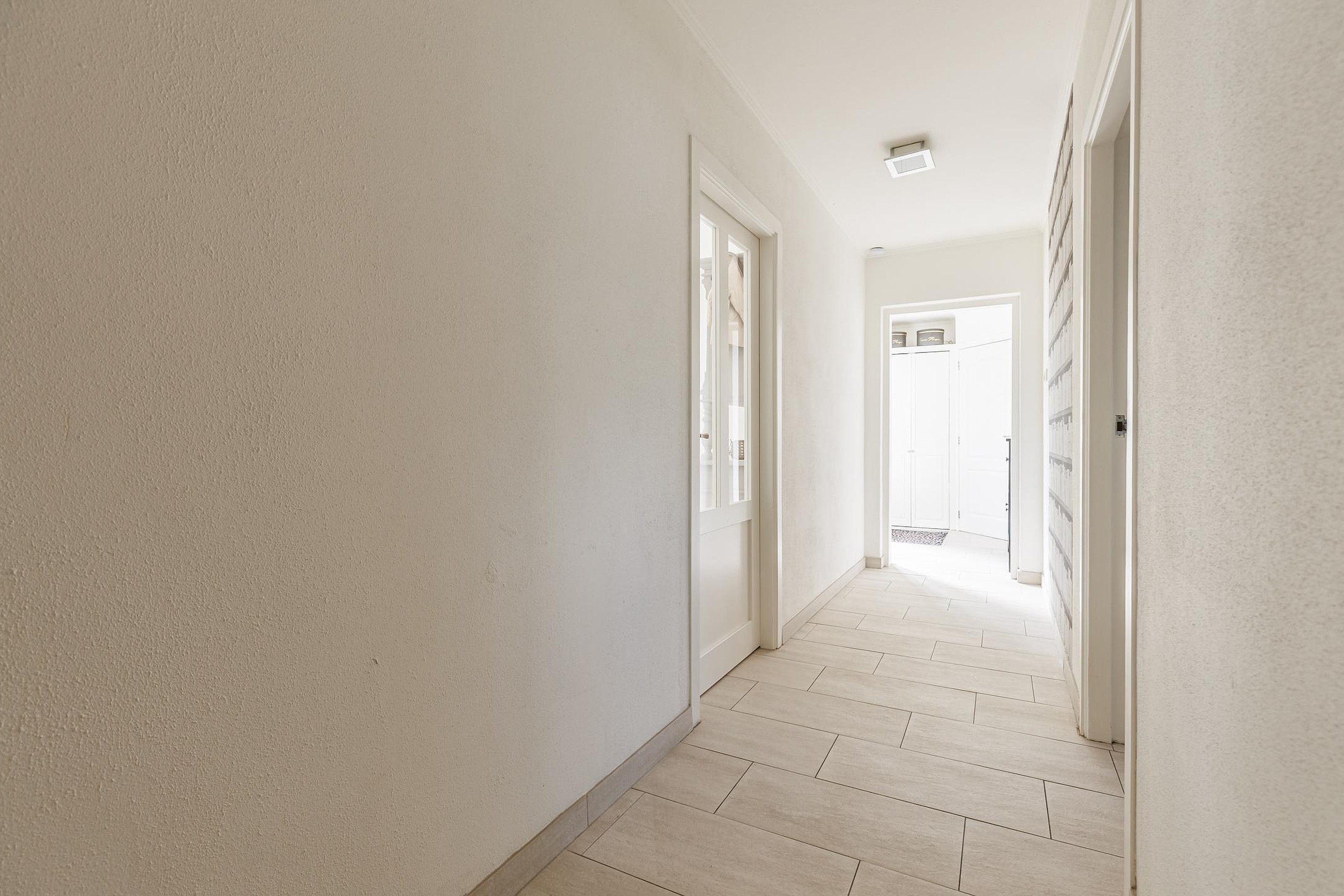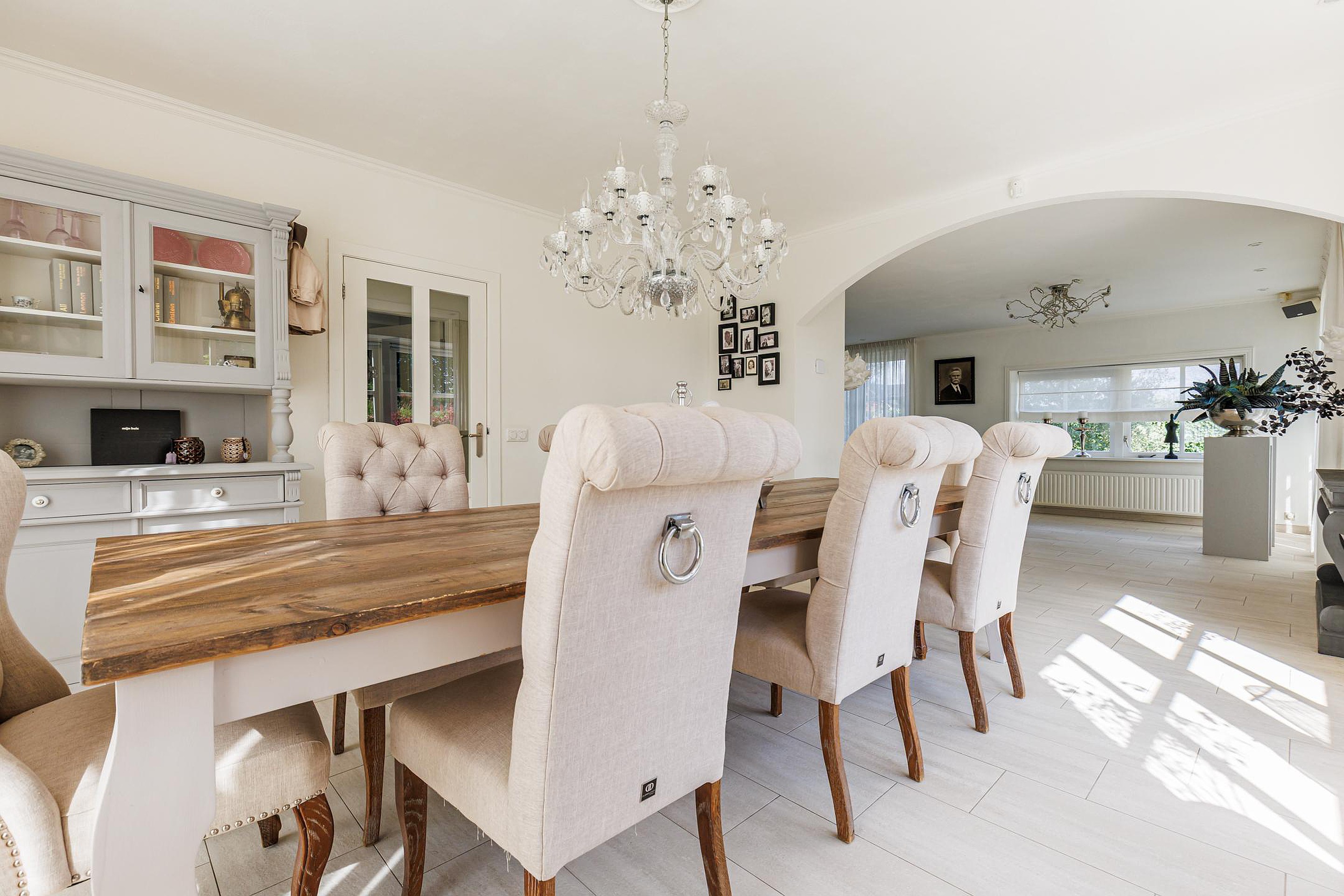 De entree geeft toegang tot een ruime hal met garderobe en toilet. De royale woonkamer (ca. 60 m2) is heerlijk licht door de grote raampartijen en openslaande deuren naar de tuin. De plafonds en wanden zijn strak gestuukt en de plavuizenvloer met vloerverwarming zorgt voor comfort. Aansluitend bevindt zich een aparte eetkamer, perfect voor lange avonden tafelen met familie of vrienden.