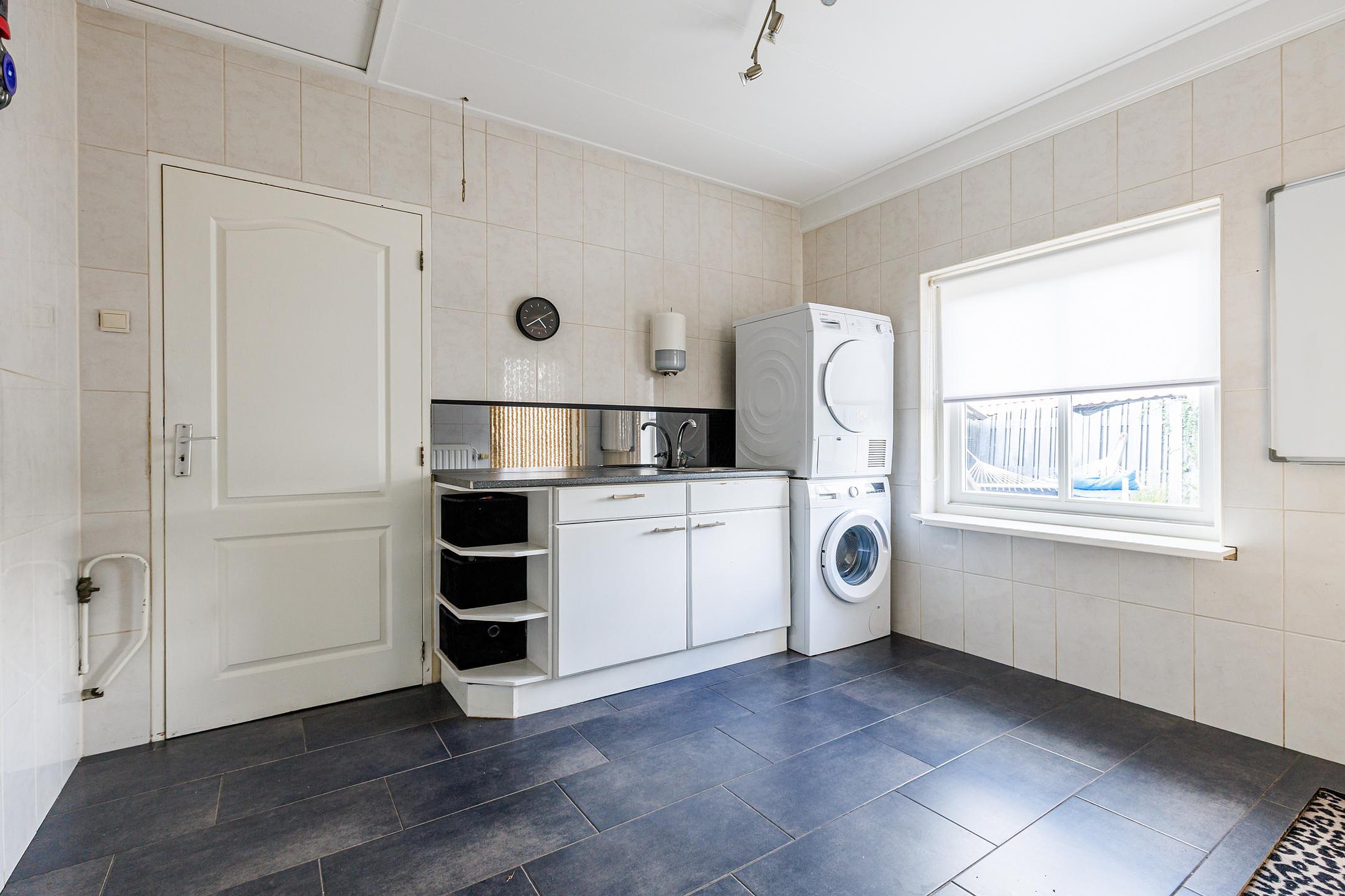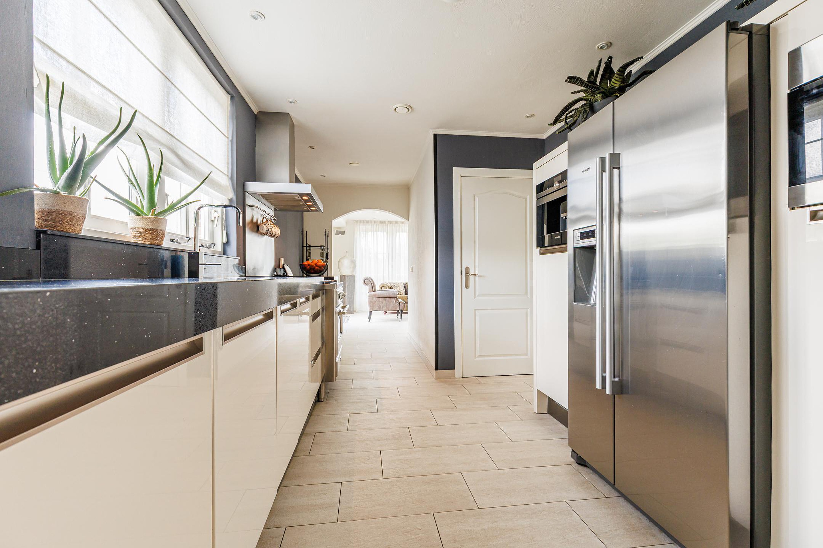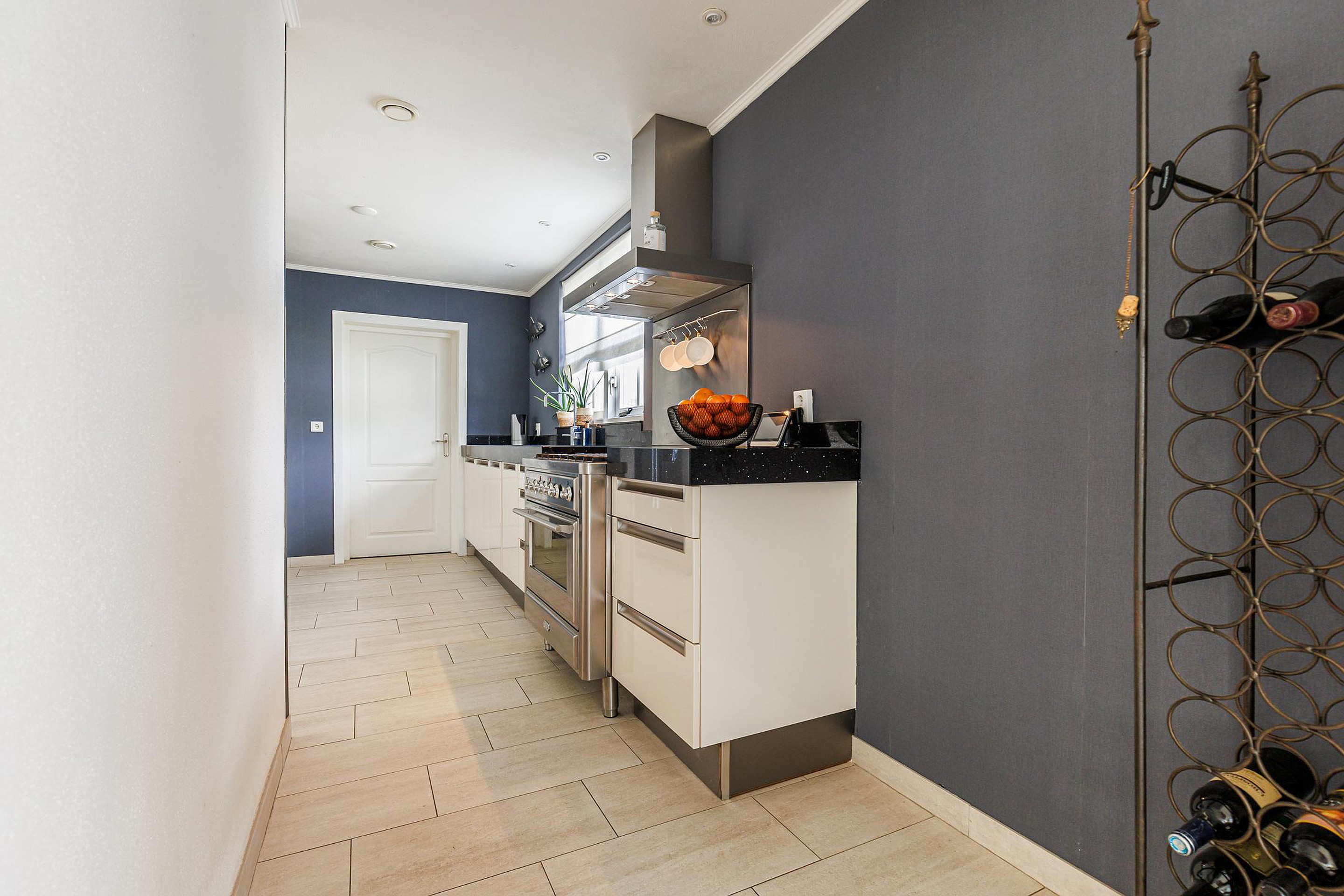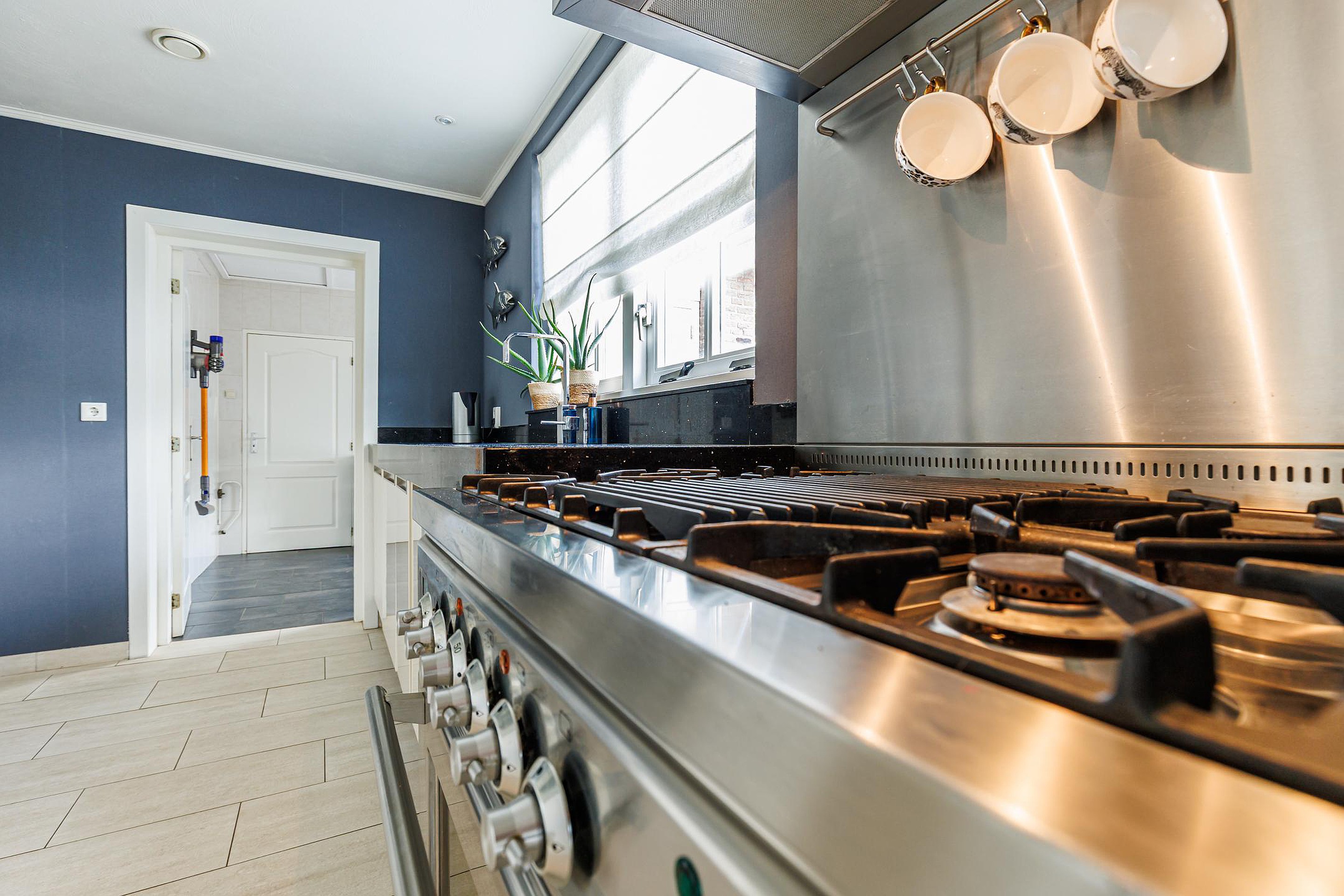 De halfopen keuken is luxe uitgevoerd met o.a. een Borretti gasfornuis met grillplaat, dubbele koelkast/vriezer met ijsblokjesmachine, vaatwasser, combimagnetron en inbouw koffiezetapparaat. Vanuit hier is de bijkeuken bereikbaar met extra bergzolder, aansluitingen voor wasapparatuur en de cv-installatie.