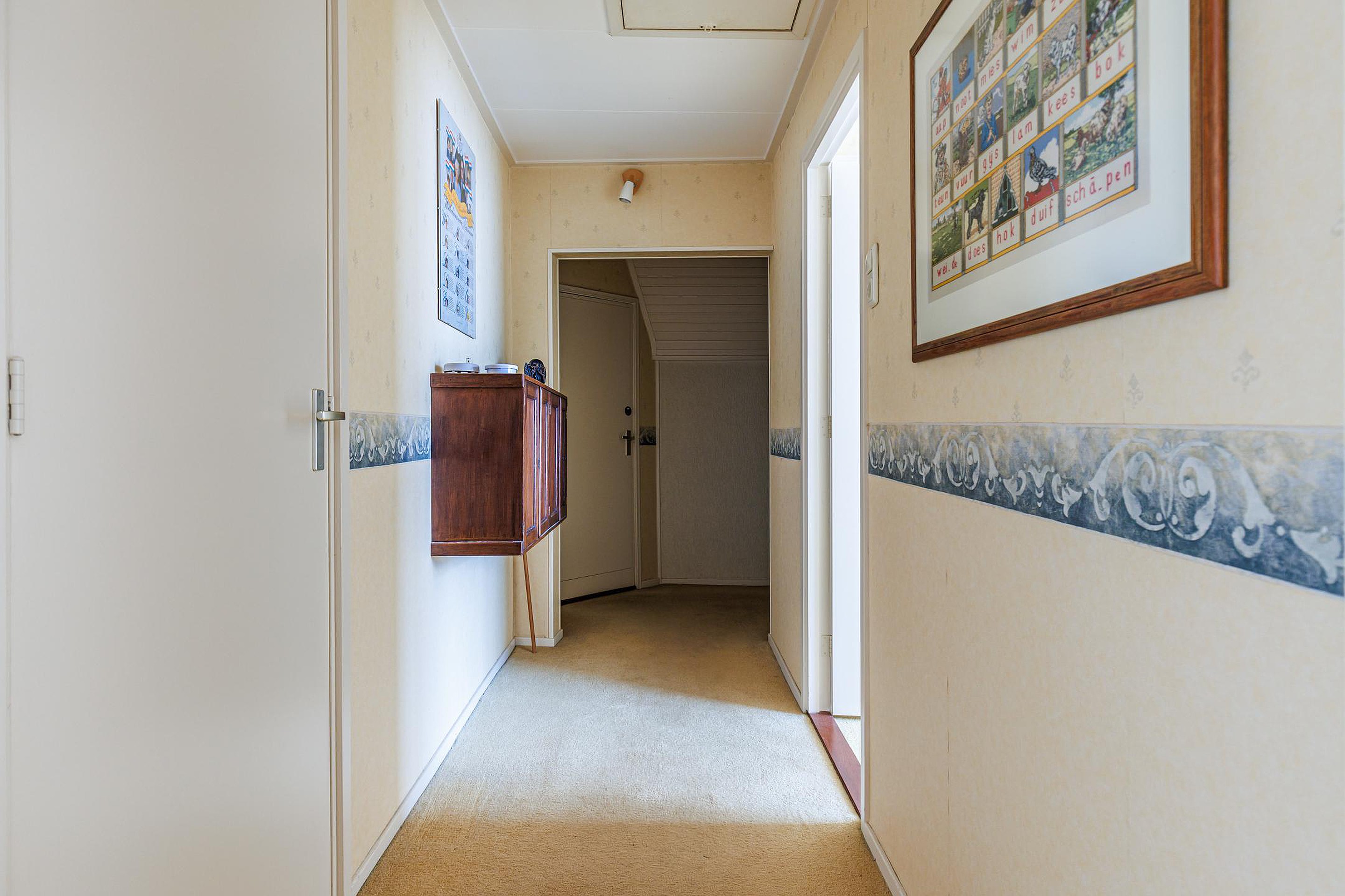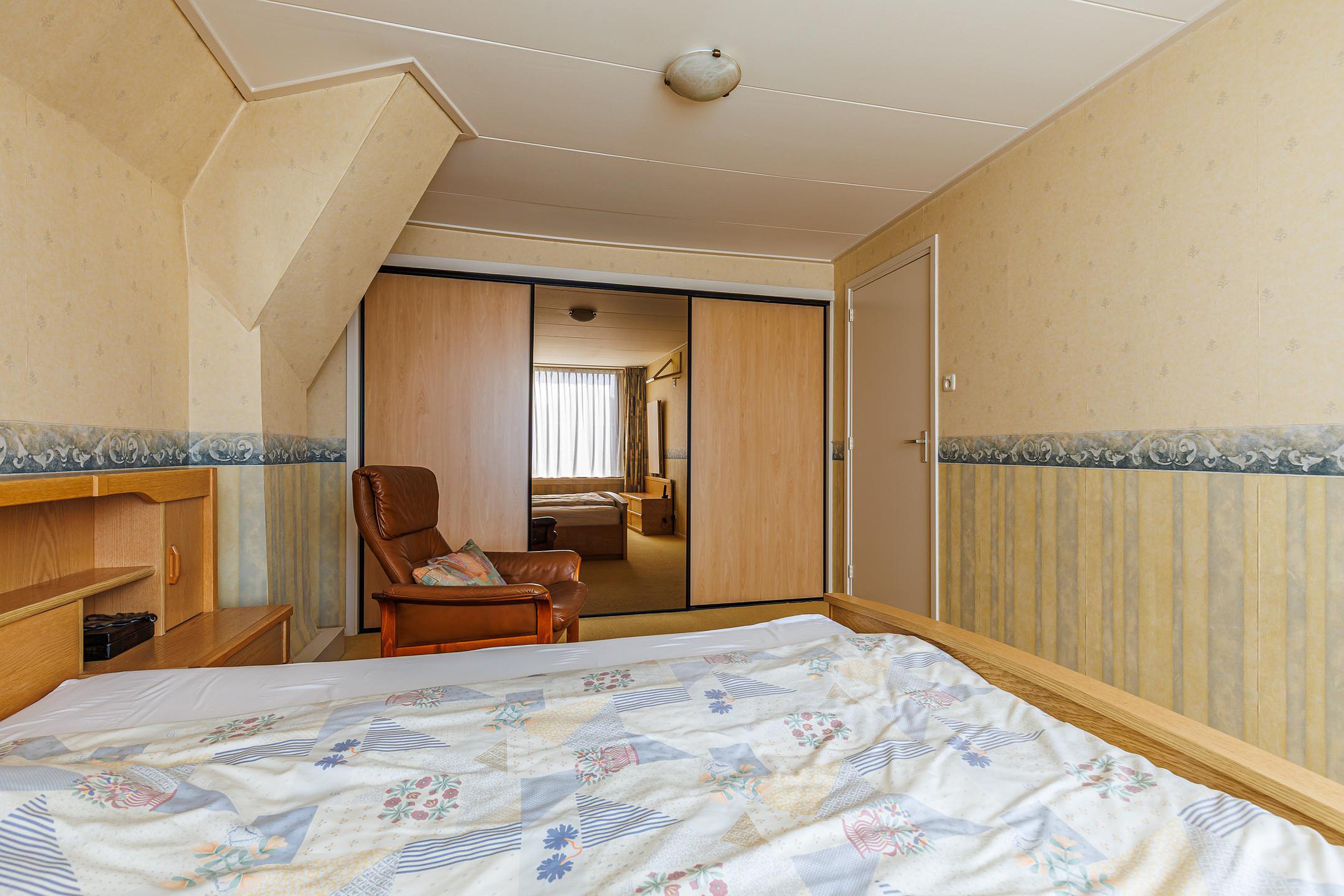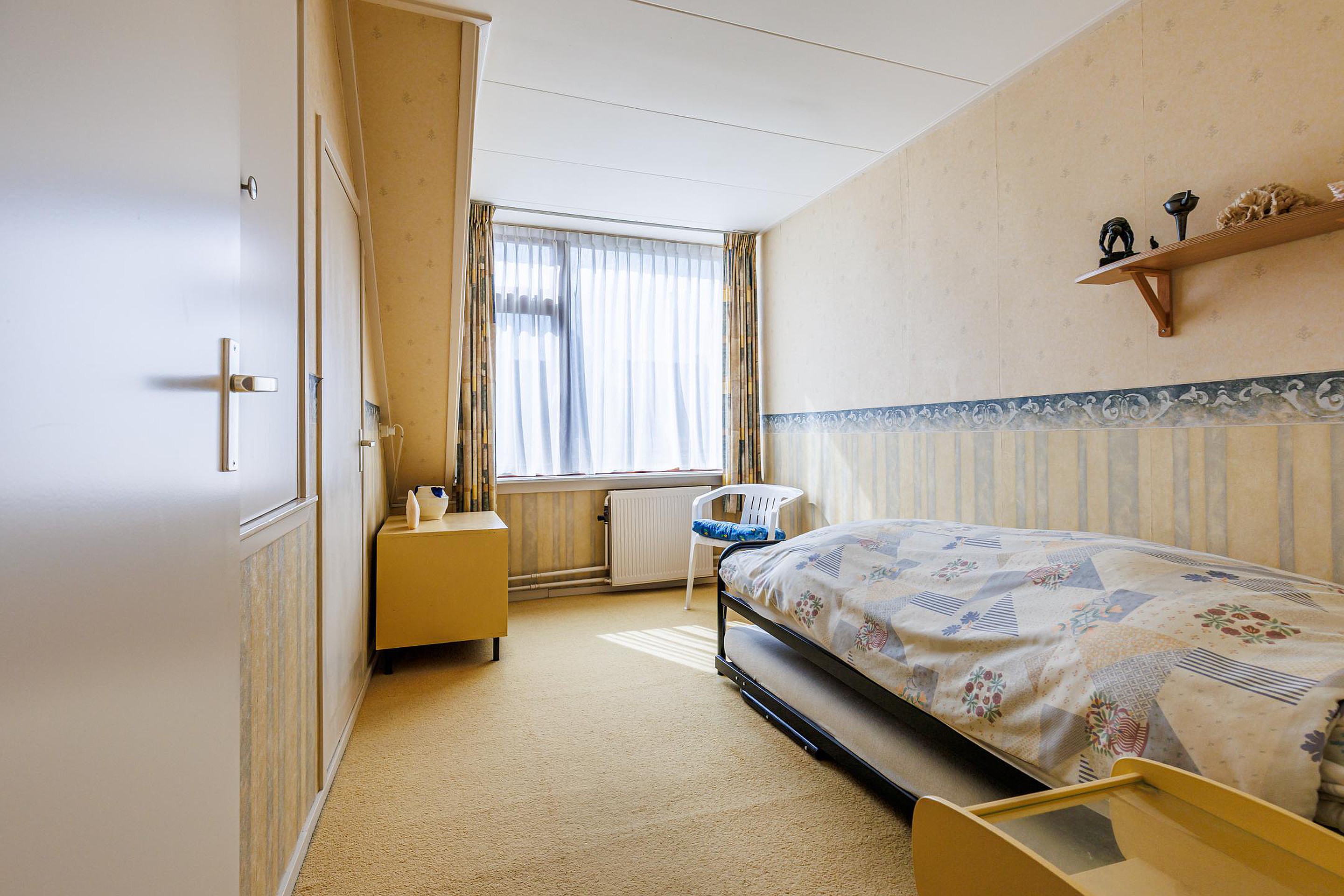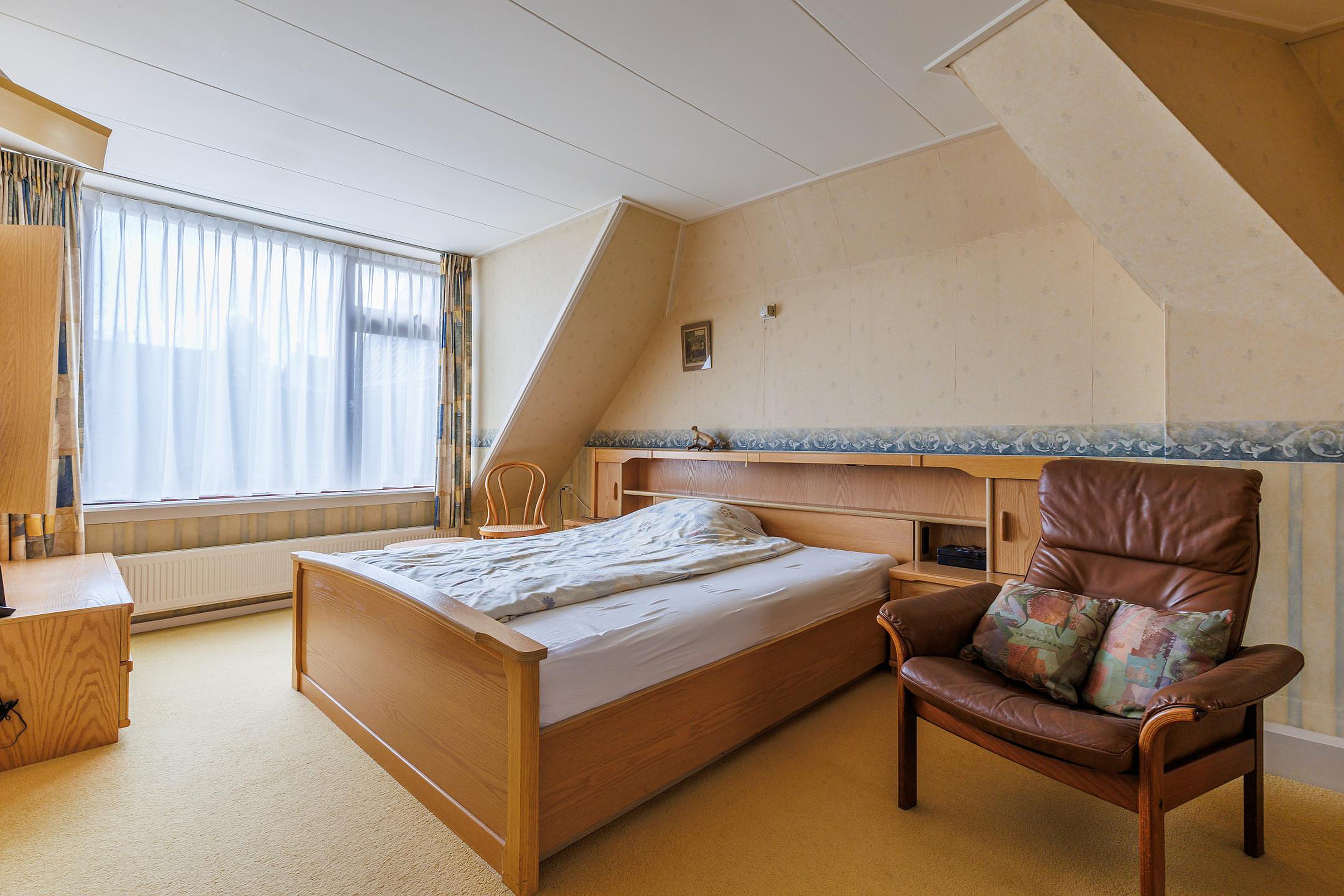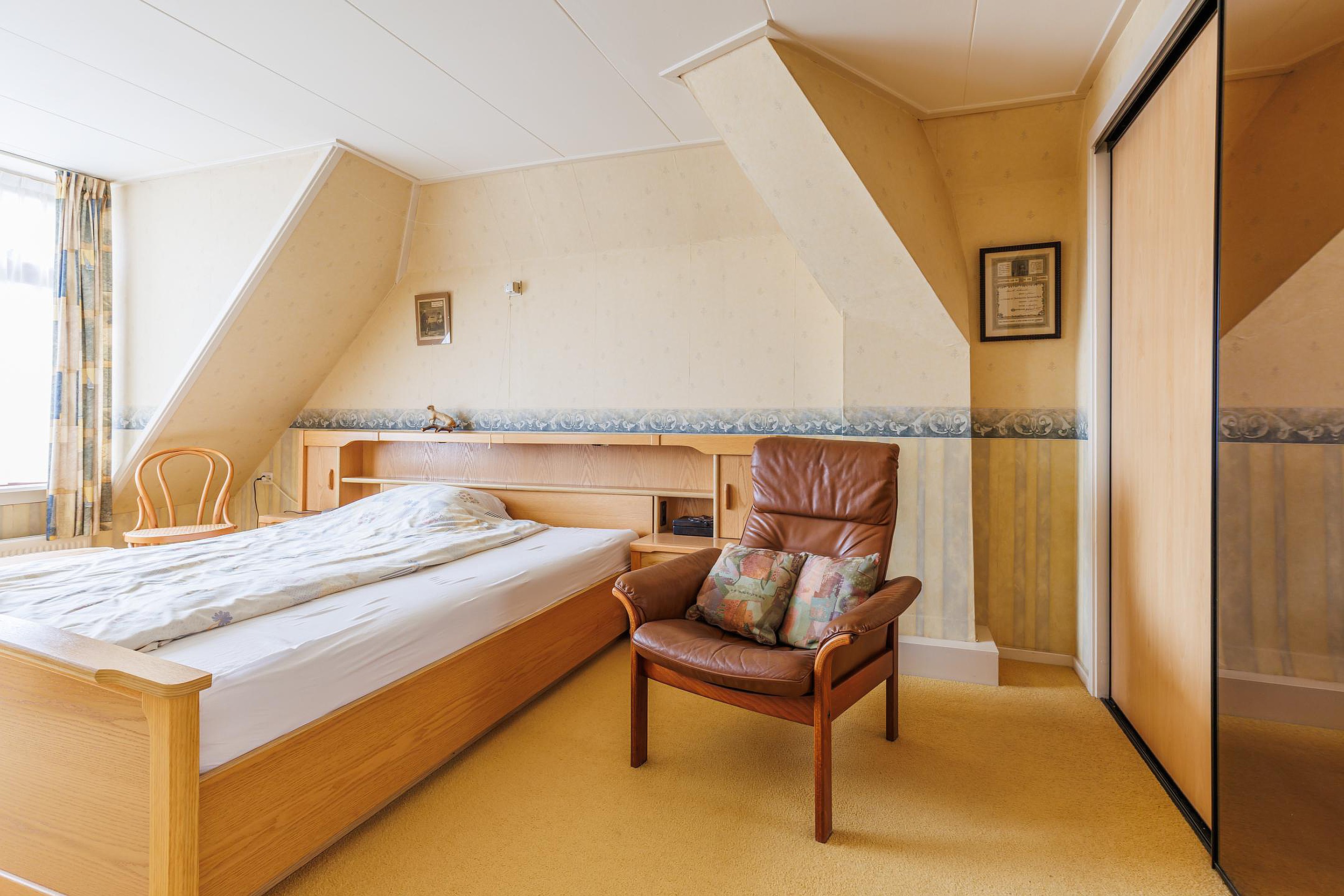 Op de ruime overloop zijn twee slaapkamers te vinden, beide aan de voorzijde en voorzien van vaste kasten. Aan de achterzijde ligt de badkamer, ingericht met een douche, wastafelmeubel en tweede toilet. Via een vlizotrap is de vliering bereikbaar, ideaal voor extra opslag.